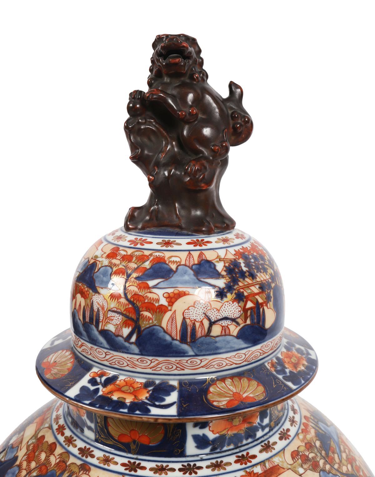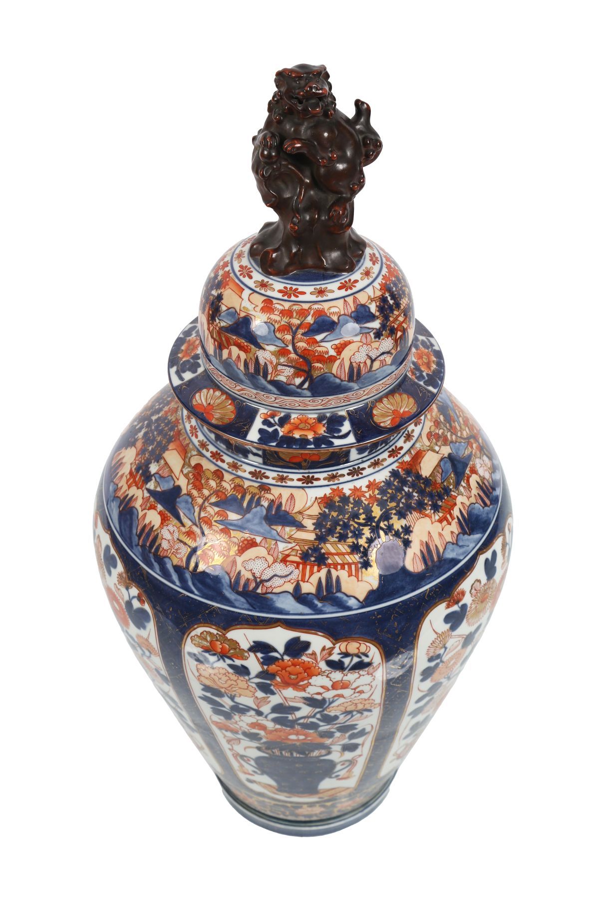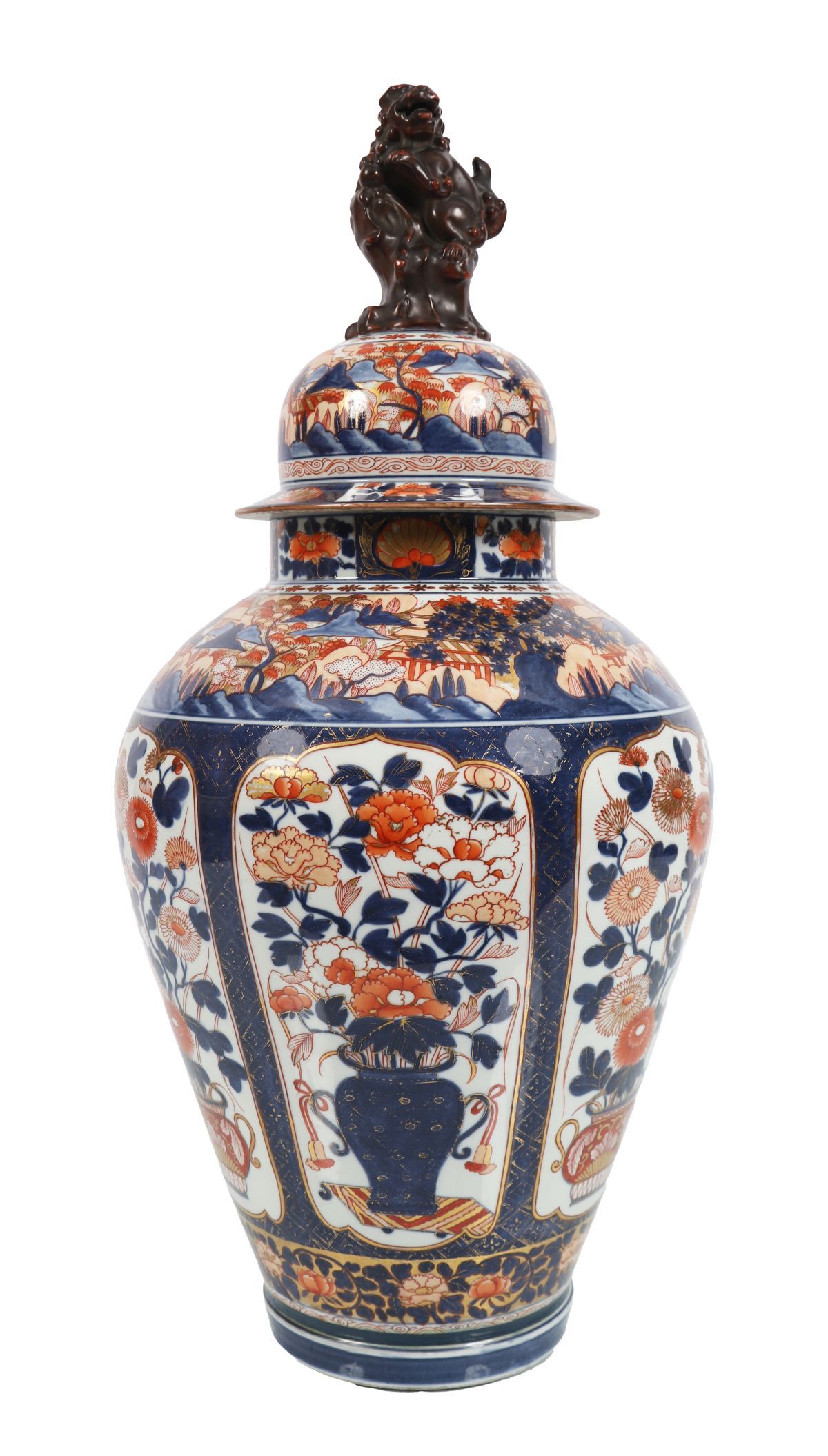 A large 19th-century Japanese Imari porcelain vase and cover, decorated in underglaze blue, iron red and gilt with shaped panels of flowers, foliage and stylised landscape elements, surmounted by a lion finial.