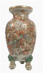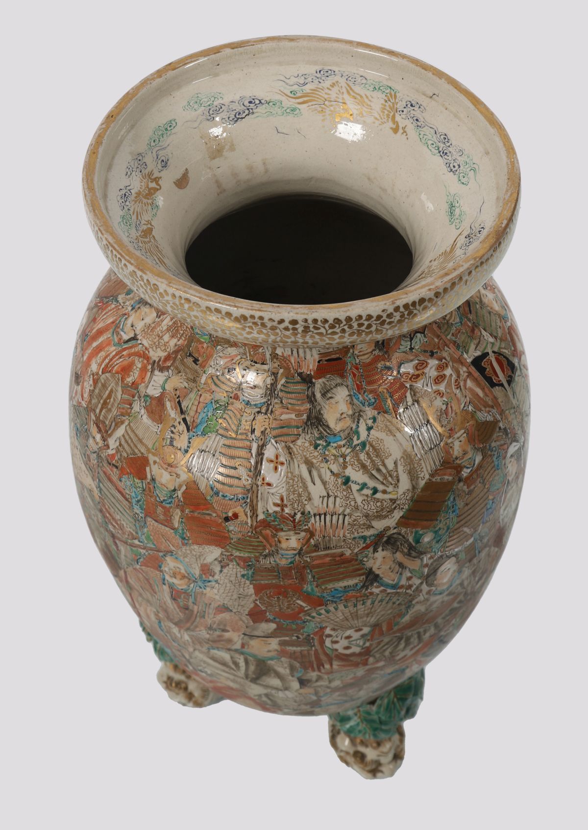 A large 19th-century Japanese Satsuma vase, densely decorated with figural scenes and attendant detail in polychrome enamels and gilt, the neck with geometric and floral borders, raised on short bracket feet.