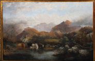 Lot 232 LARGE 19TH-CENTURY LANDSCAPE OIL PAINTING WITH CATTLE BY A MOUNTAIN STREAM