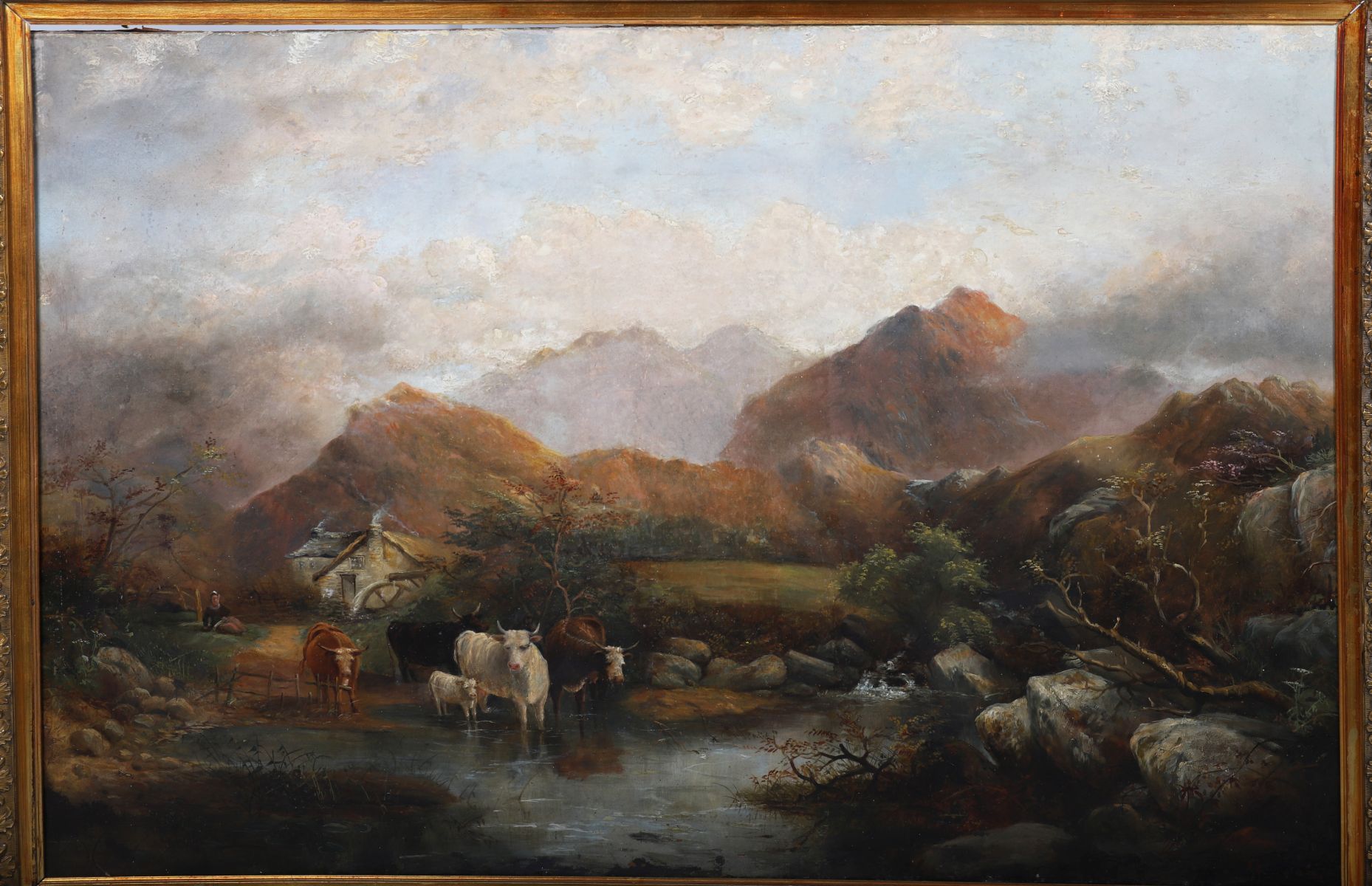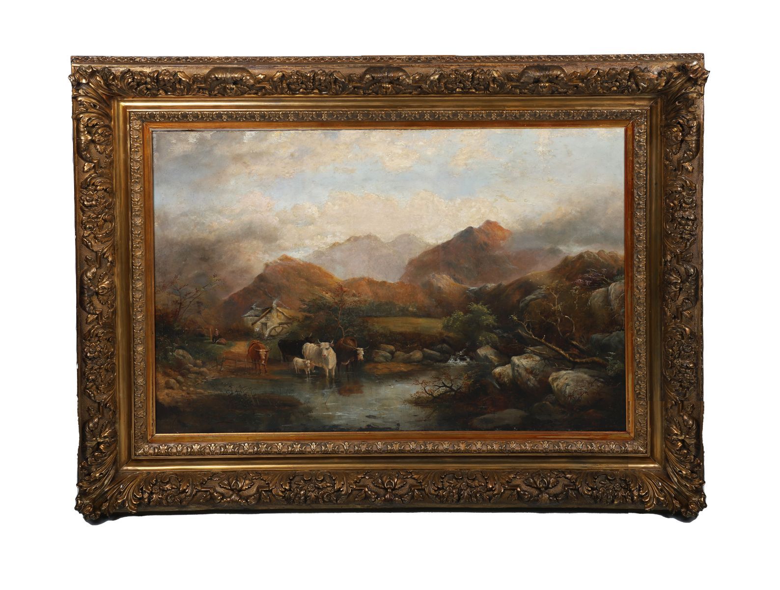 A substantial 19th-century oil on canvas landscape, depicting cattle watering at a mountain stream before a rustic cottage, with dramatic highland scenery beyond. Richly painted in naturalistic tones with strong light effects. Signed indistinctly lower left, possibly “W.A.T.” and dated 1885. Presented in a deeply carved and gilt foliate frame of excellent quality.