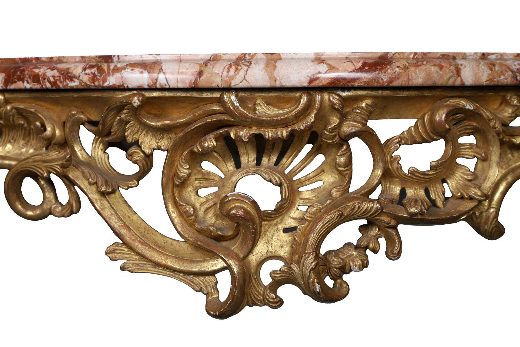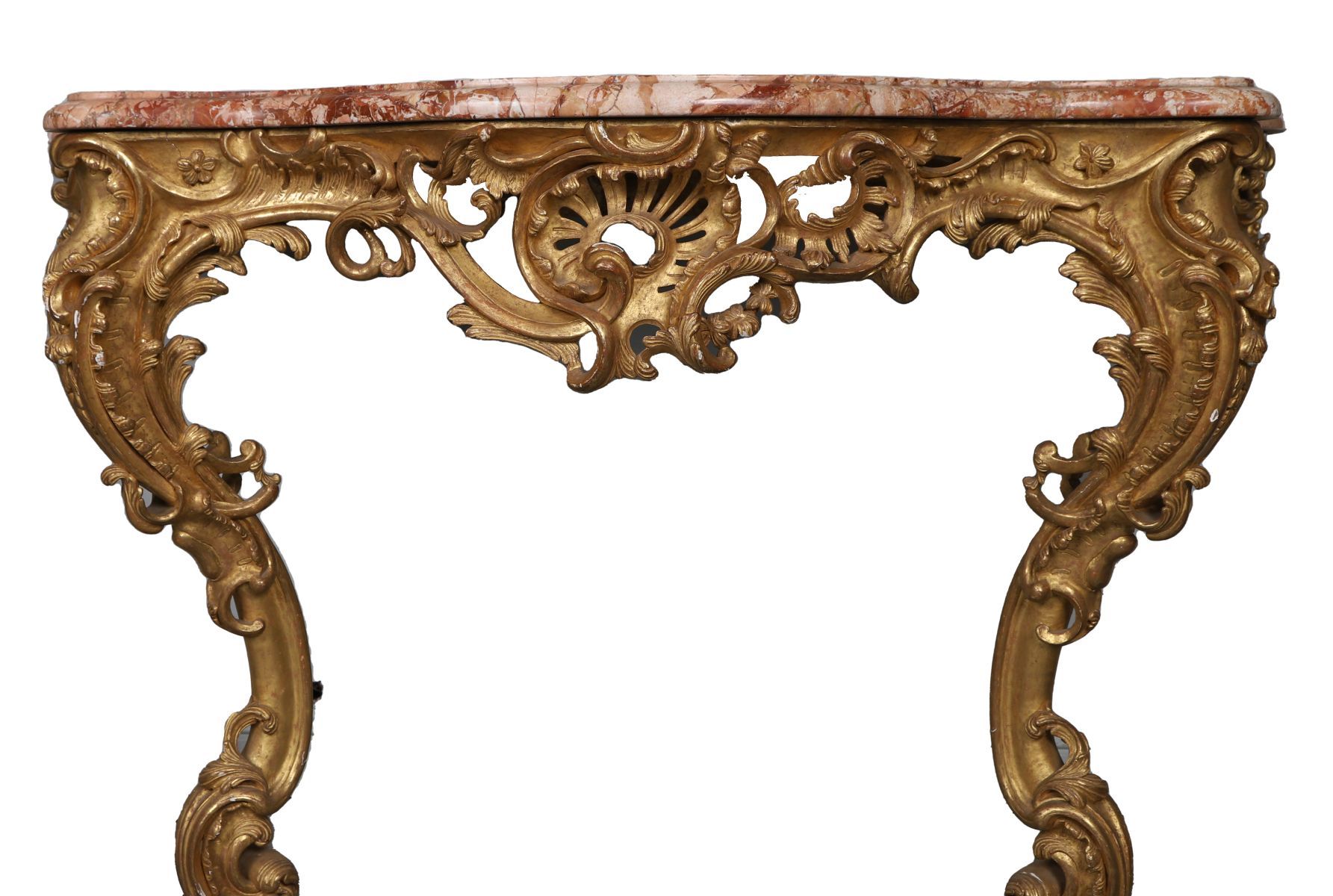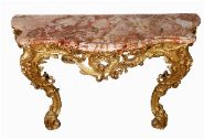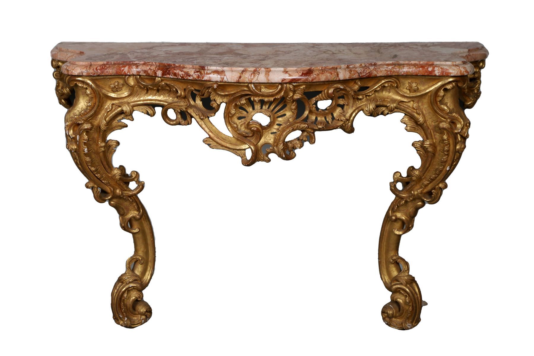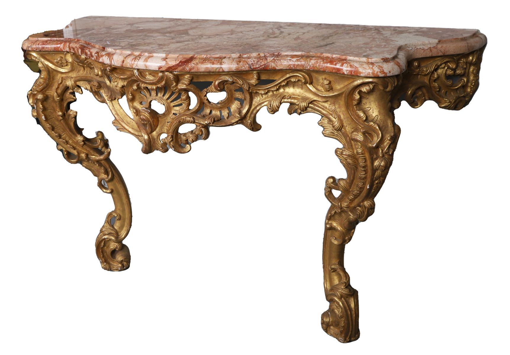Large 19th-century giltwood console table with shaped marble top above a carved frieze, raised on scrolling supports terminating in cabriole legs.