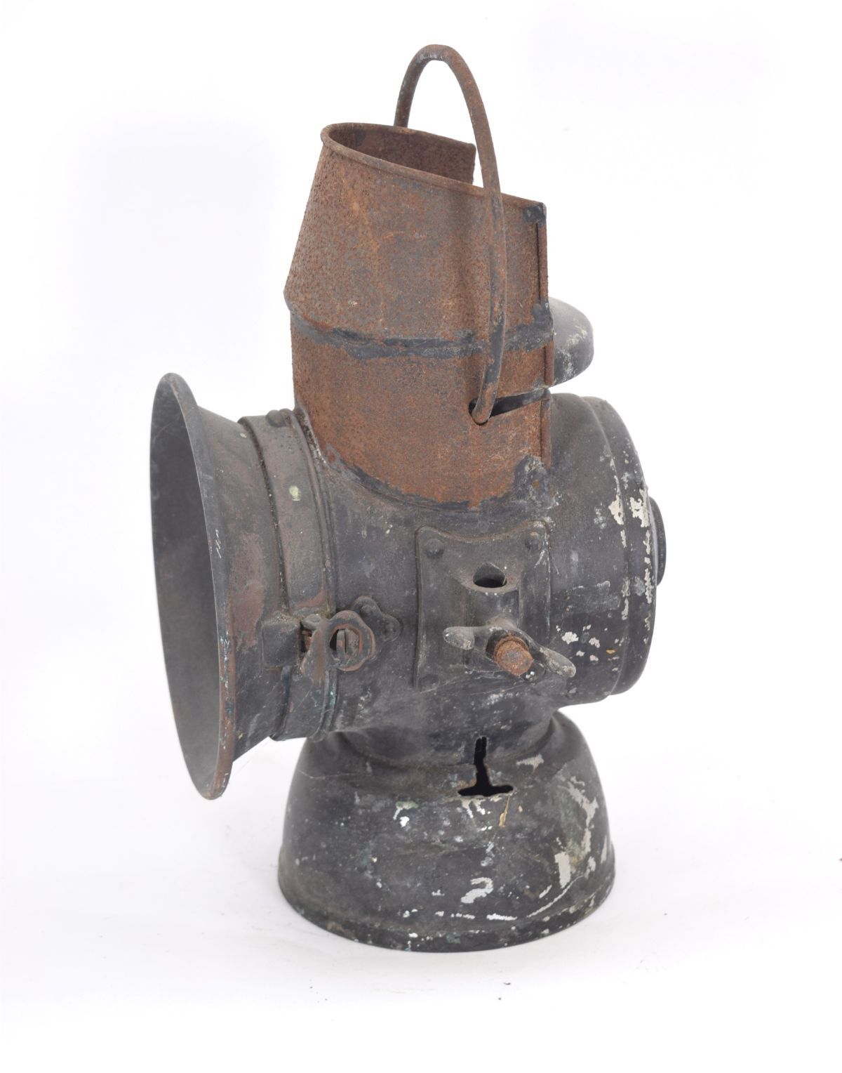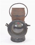 Large 19th-century metal railway lamp with swing handle.
