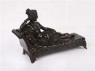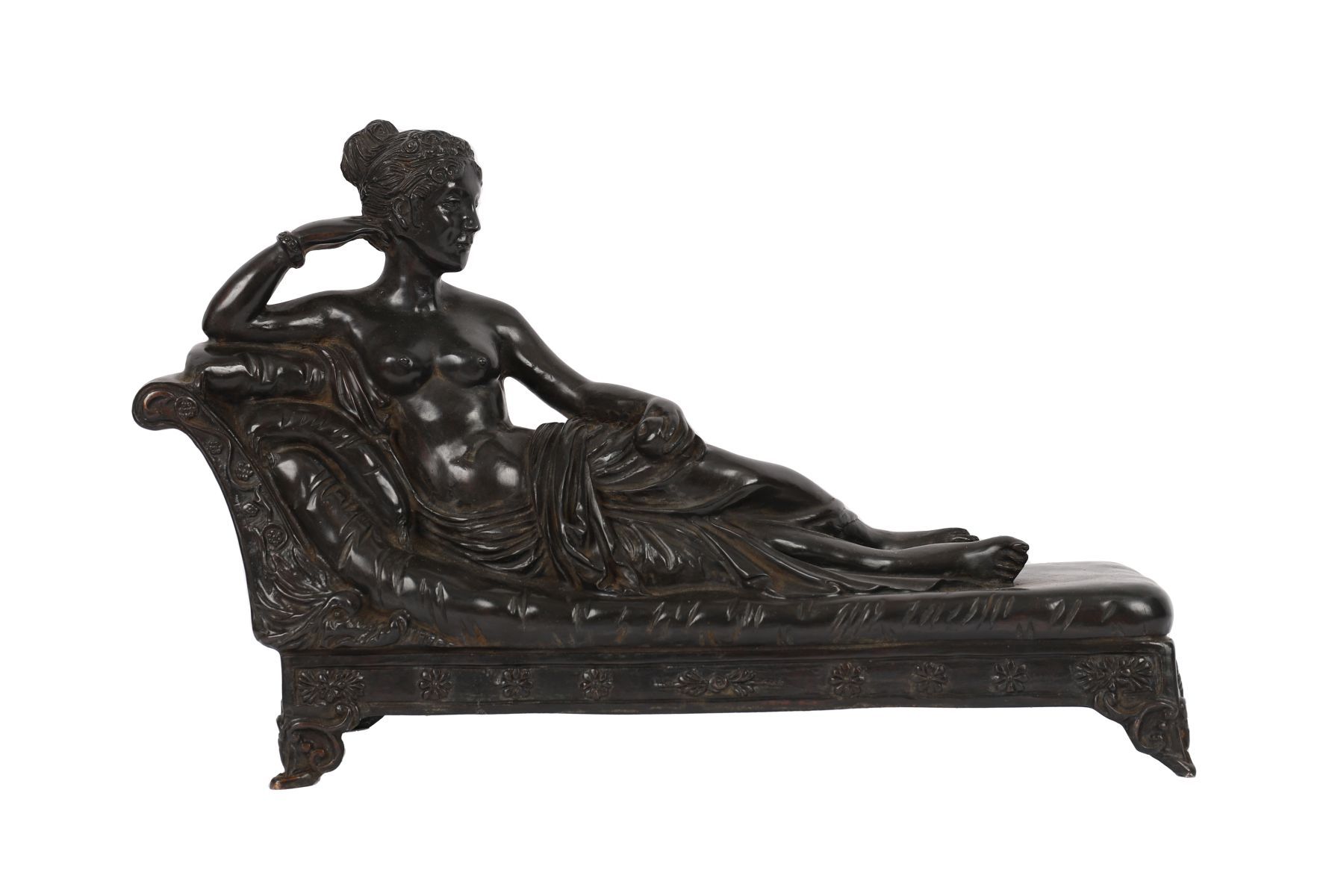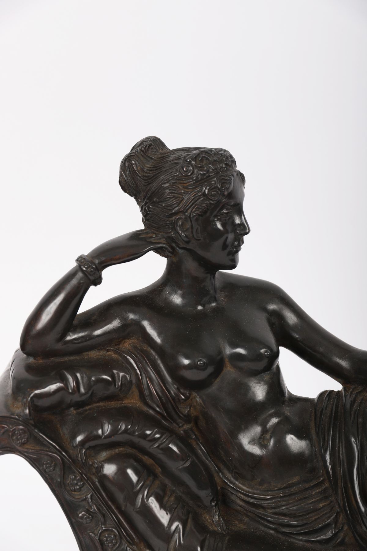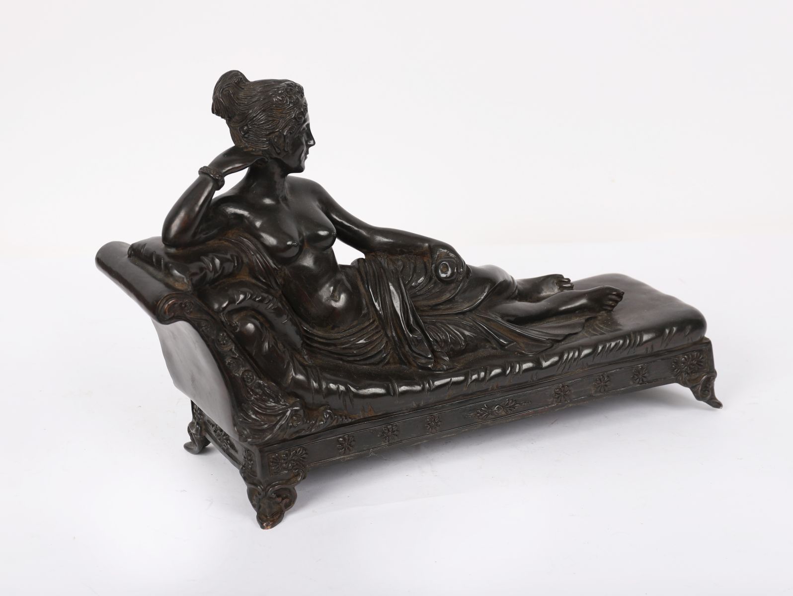 Substantial bronze sculpture depicting a classical reclining nude on a draped couch.