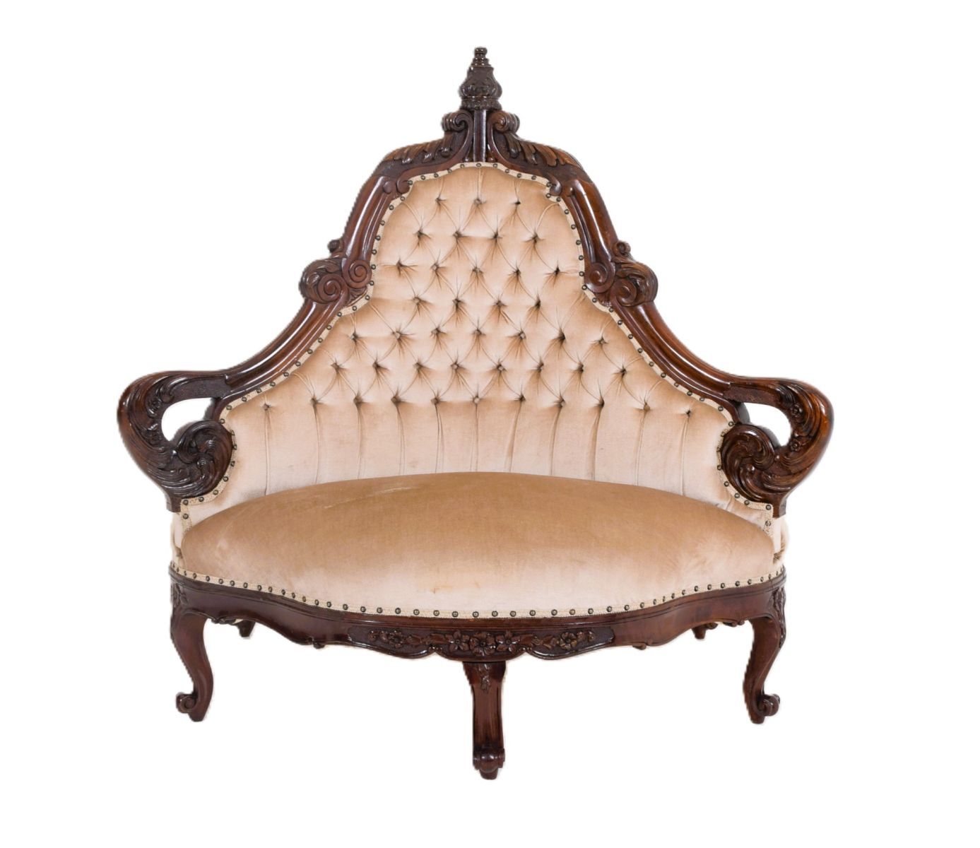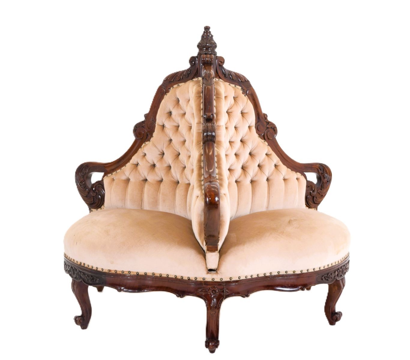Lot 987 LARGE CARVED WALNUT AND DEEP BUTTONED UPHOLSTERED CONVERSATION SEAT