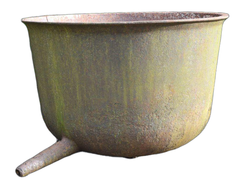 A large 19th-century cast iron famine pot, of substantial form with flared rim and side pouring spout. Retains an attractive weathered patina with surface pitting from age and outdoor use.
