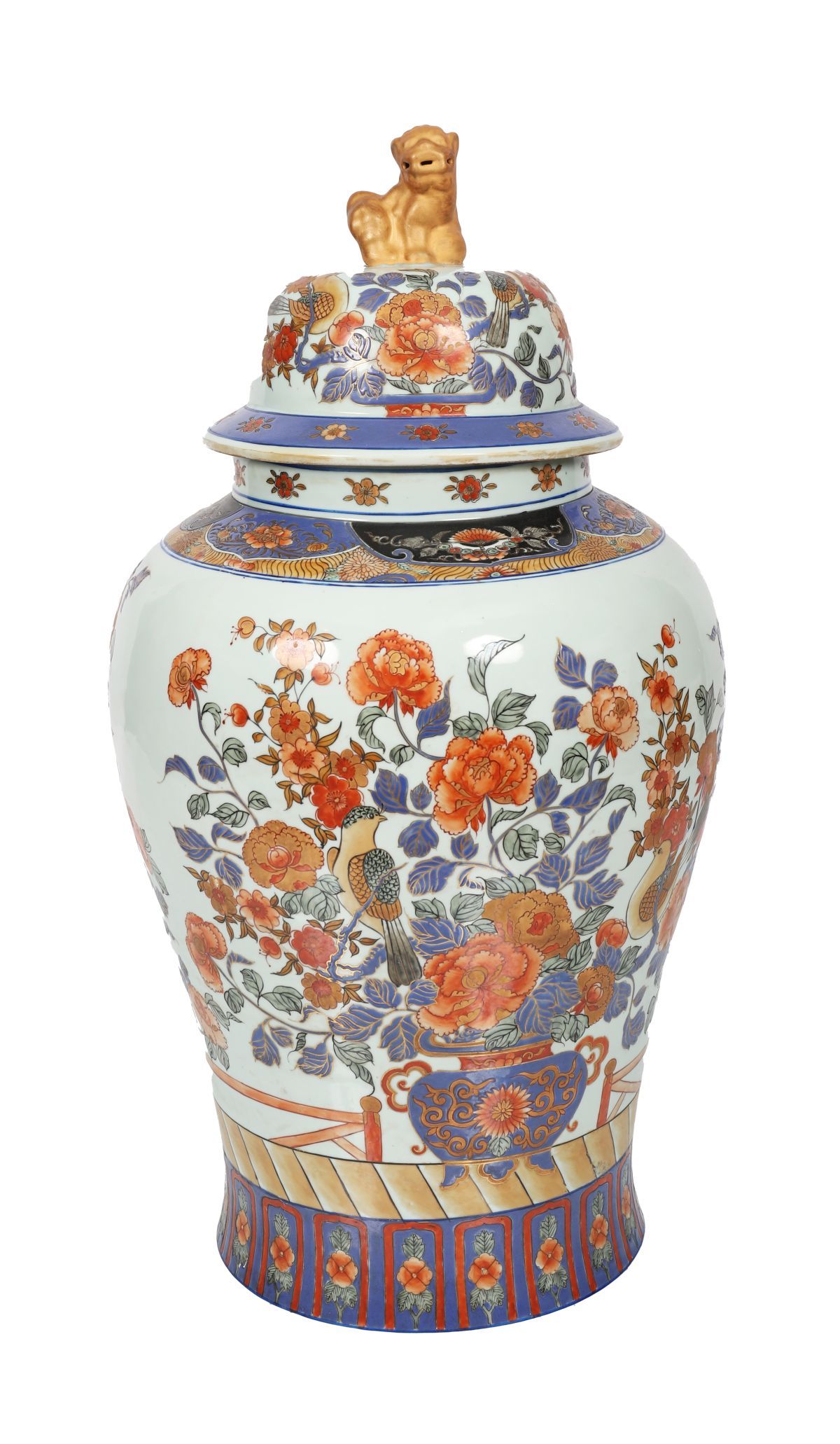 A large Chinese porcelain vase and cover decorated in the Imari palette of iron red, cobalt blue and gilt, the domed lid surmounted by a gilt lion finial, the body painted with peony blooms and foliage.