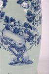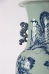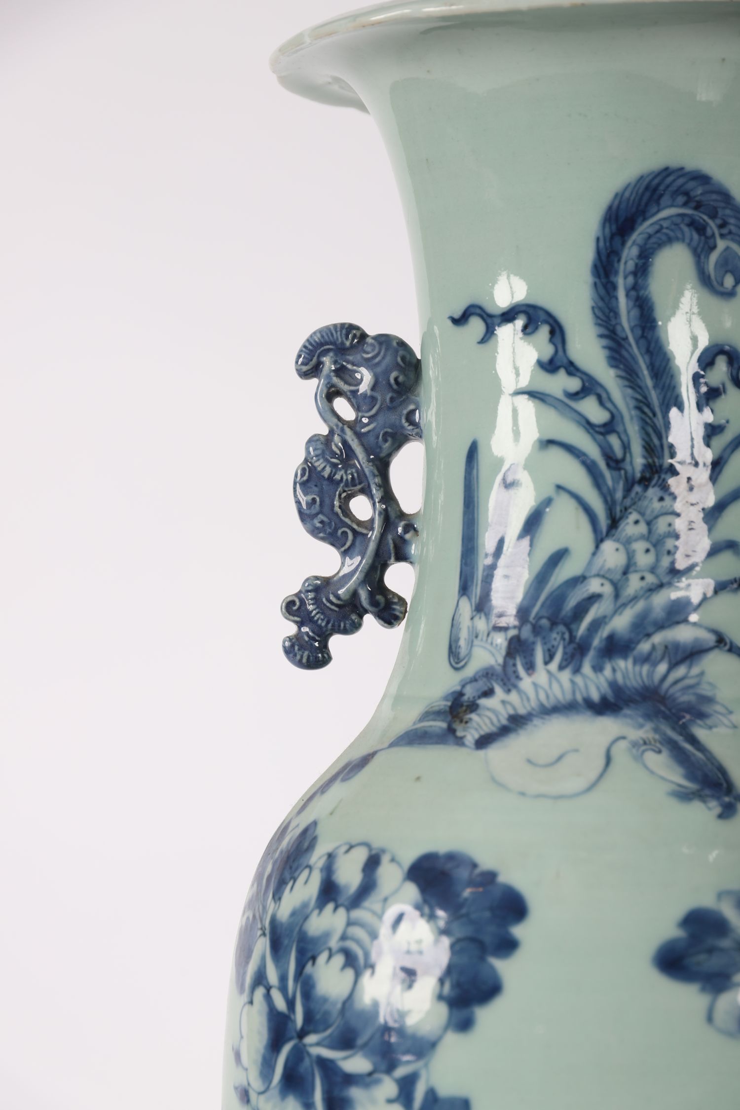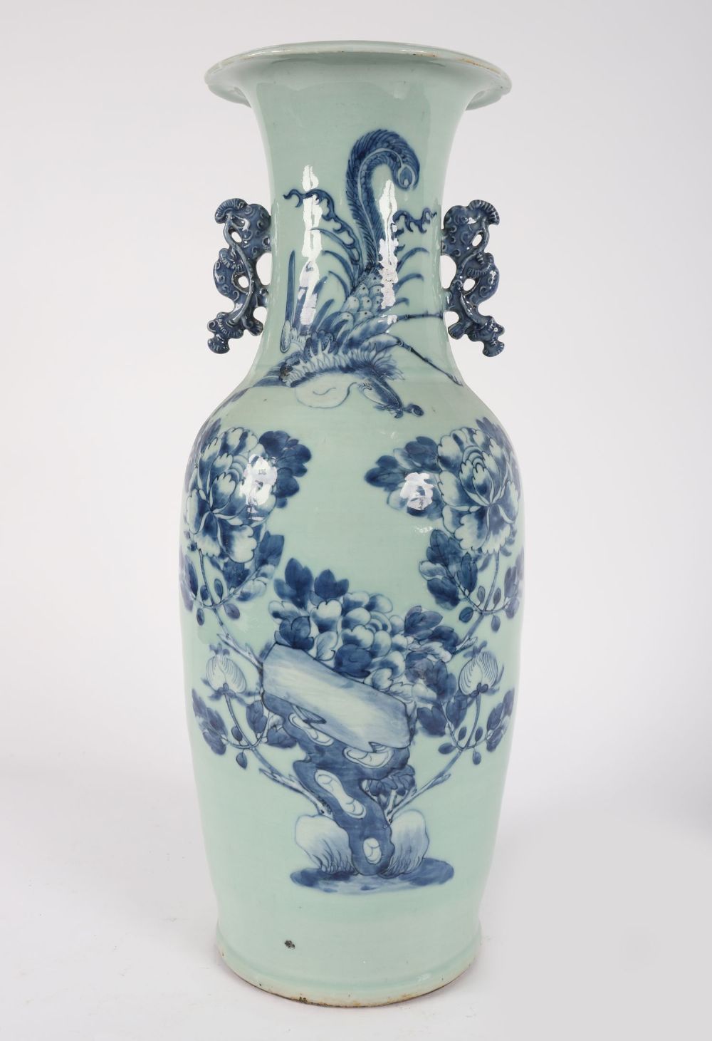 A large Qing dynasty-style Chinese porcelain vase with flared rim and applied qilin-style handles. Decorated in underglaze cobalt blue with phoenix and peony motifs on a pale celadon ground.
