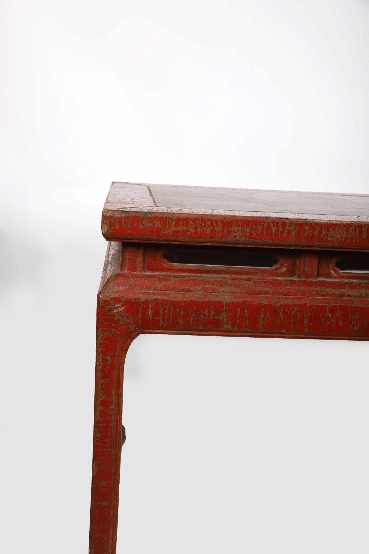 A striking Qing dynasty lacquered side table, the rectangular form richly decorated in a deep red lacquer finish. The frieze with shaped aprons, the legs of square section terminating in simple feet. A bold piece of Chinese decorative furniture with strong presence.