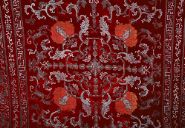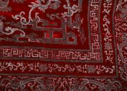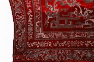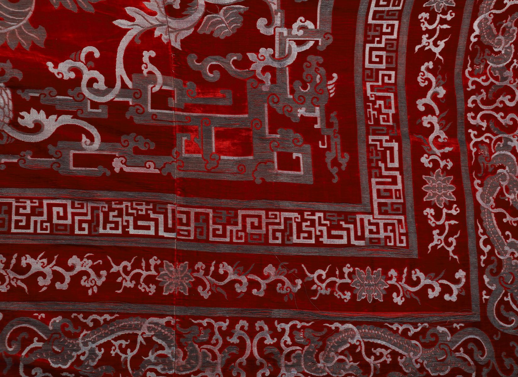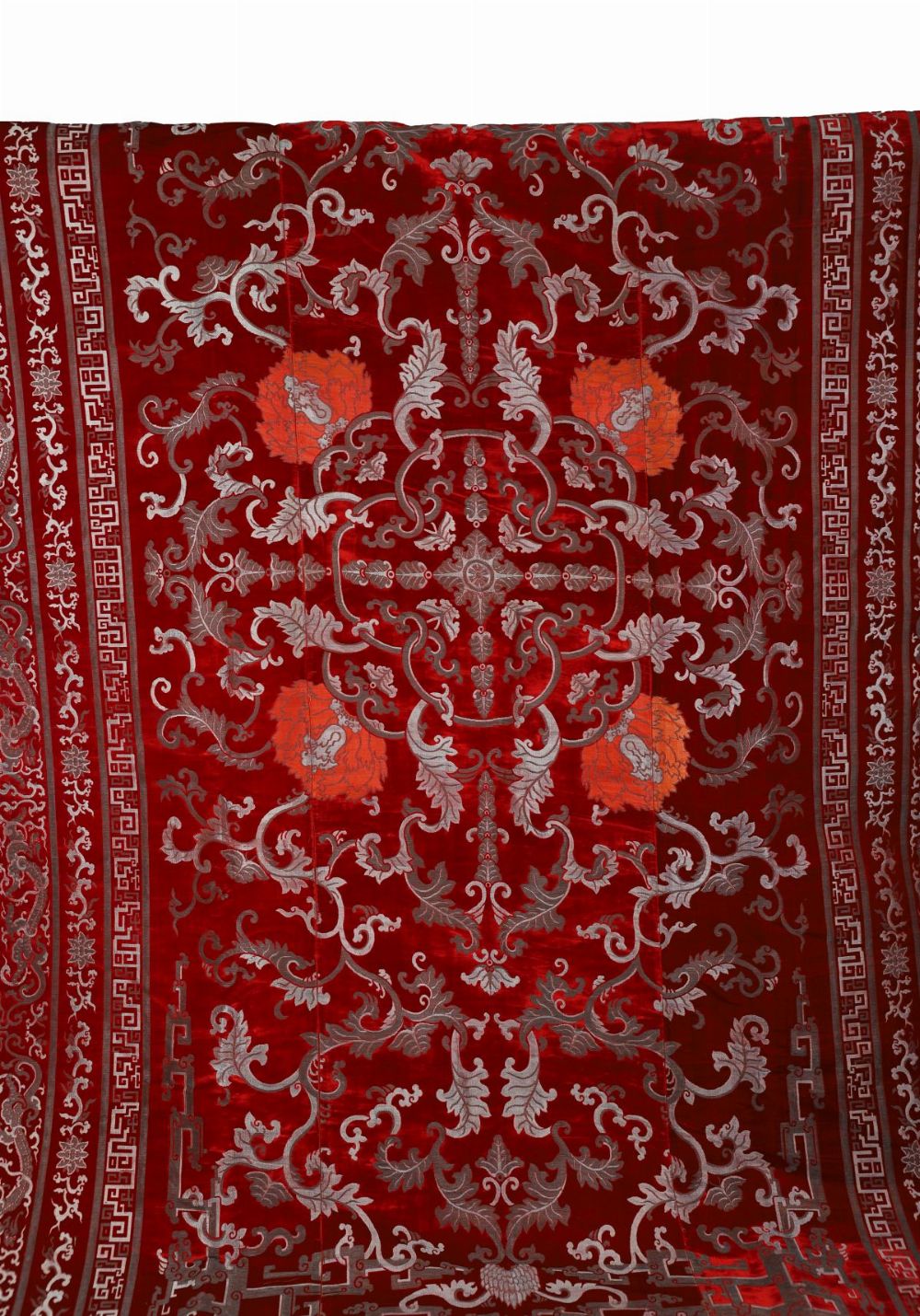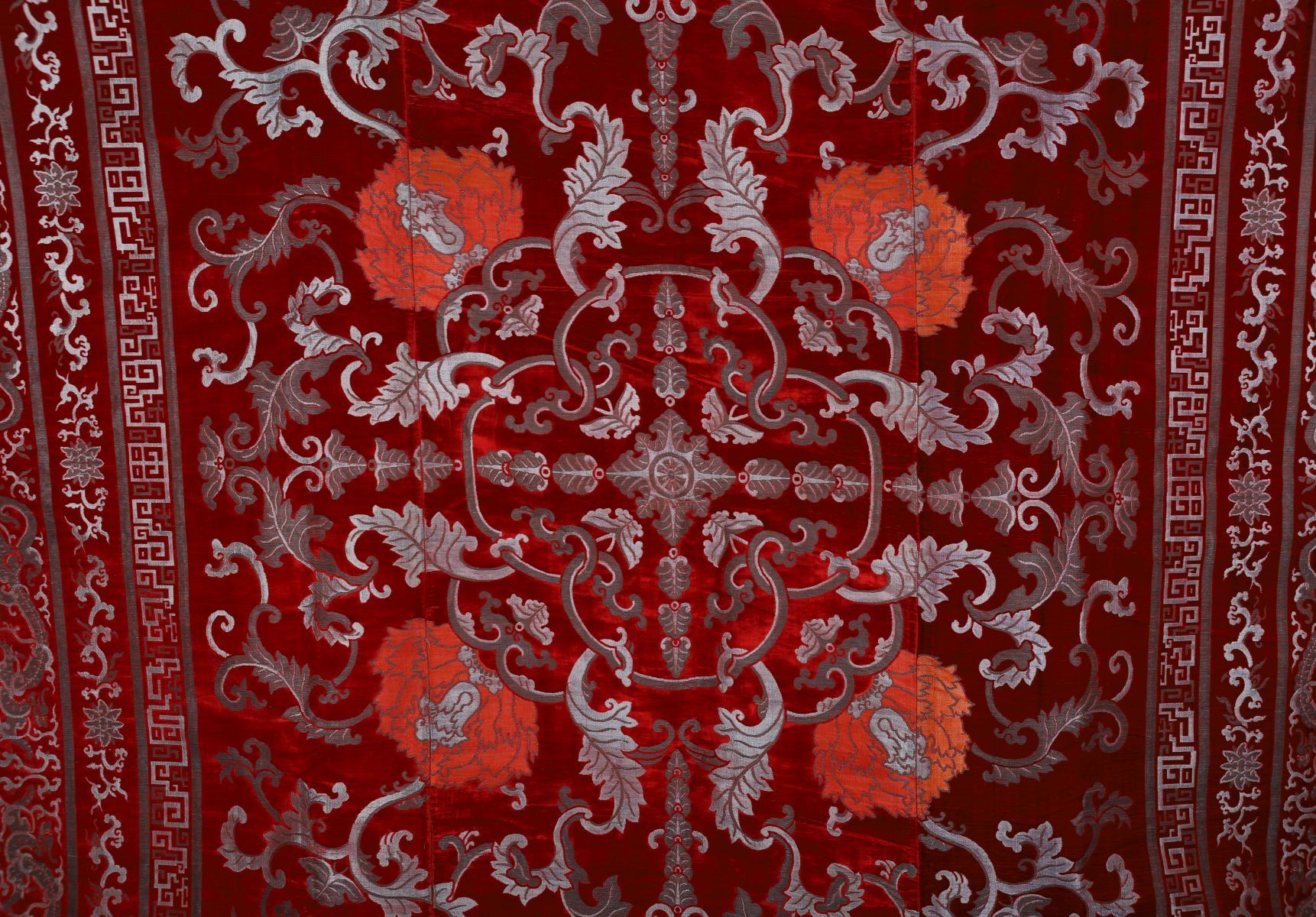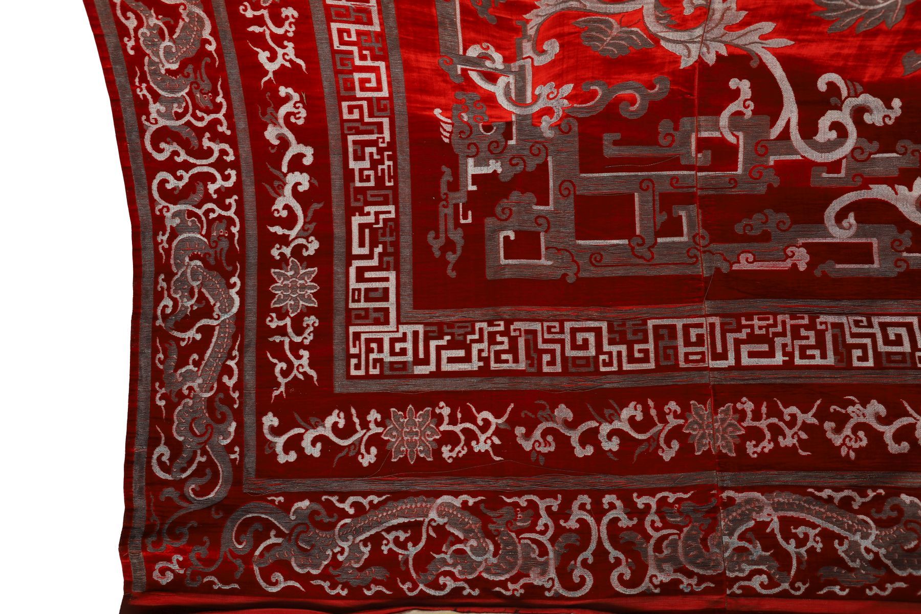 A richly embroidered Chinese silk wall hanging of vibrant red ground, worked in silver and gold thread with scrolling lotus, foliate motifs, and stylised border patterns. The intricate geometric and floral designs exhibit fine craftsmanship