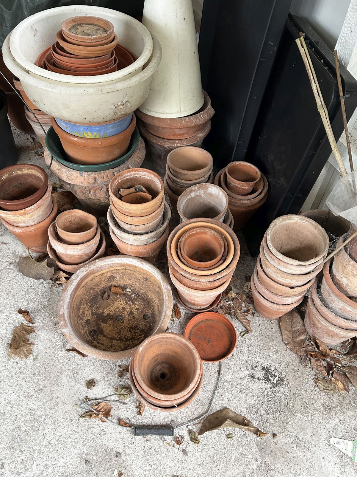 A substantial group of terracotta flowerpots in assorted sizes and forms, including plain pots, bowls and saucers, stacked and grouped.
