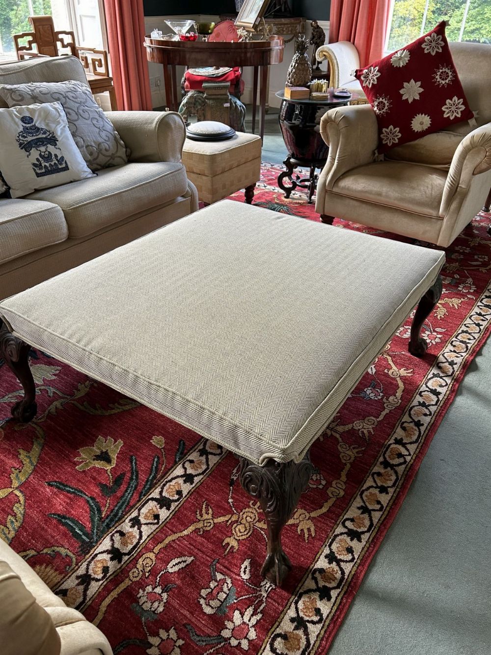 the expansive upholstered seat, raised on acanthus leaf carved cabriole legs terminating on claw and ball feet.