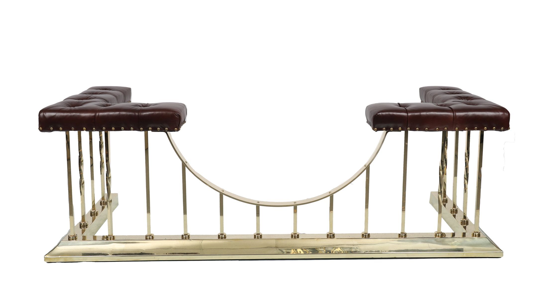 A substantial brass club fender of rectangular form, fitted with two hide upholstered seats.
