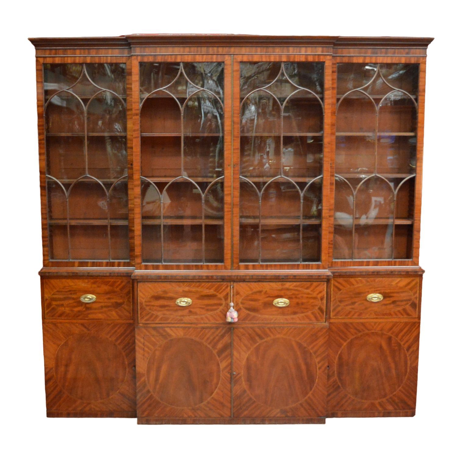 A fine Georgian breakfront mahogany bookcase, the upper section with four astragal-glazed doors enclosing adjustable shelving, above a lower section fitted with central secretaire drawer flanked by cupboards. The whole finely inlaid with satinwood banding and oval panels, with brass escutcheons and handles.