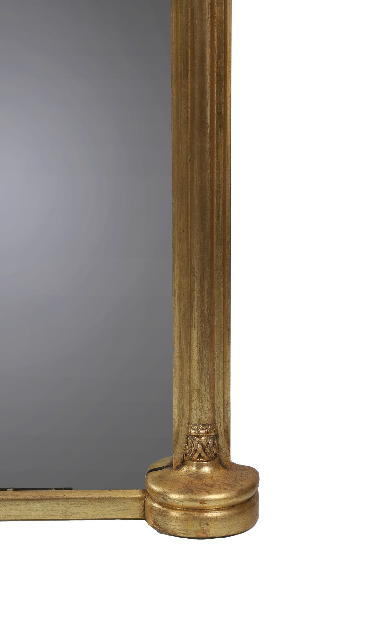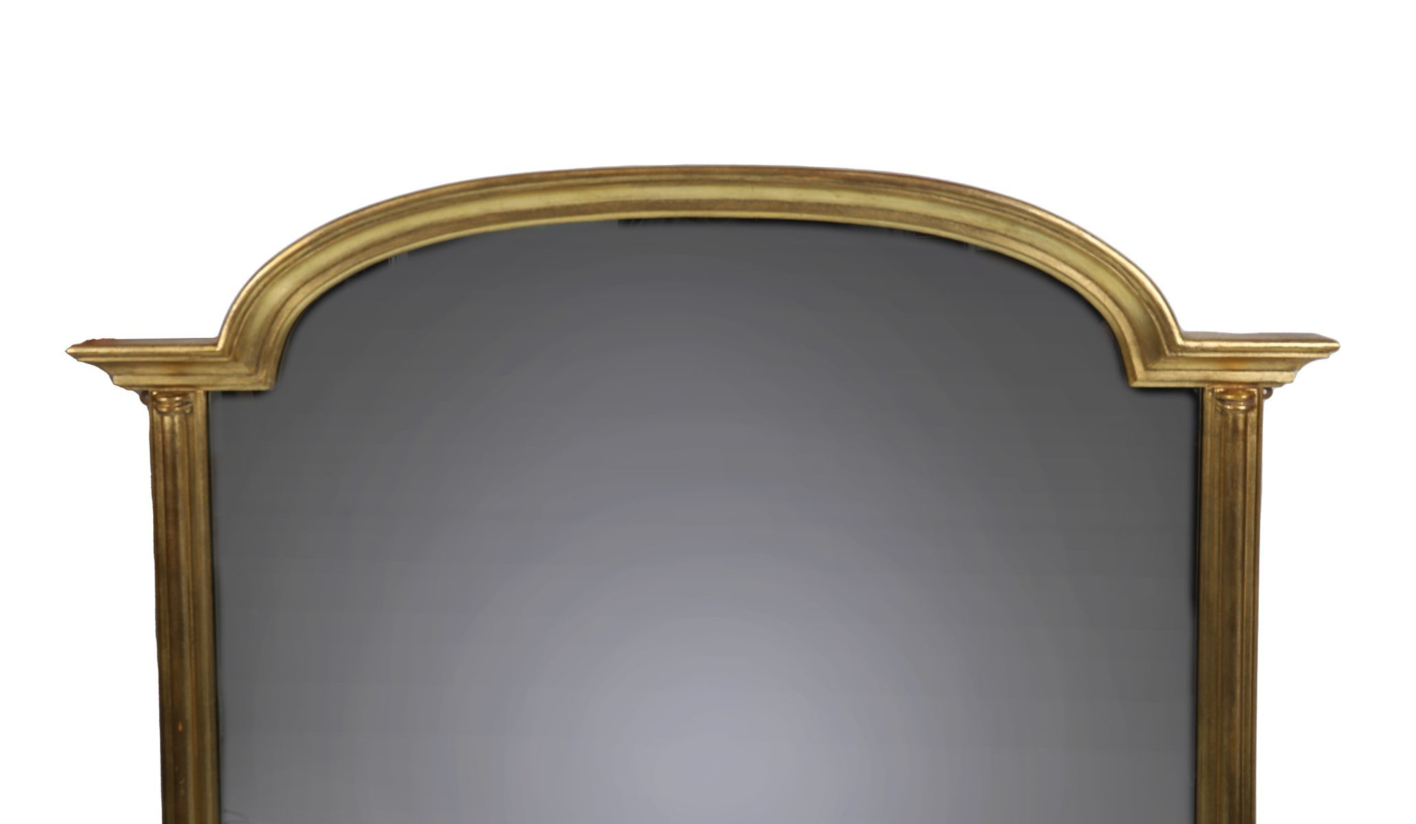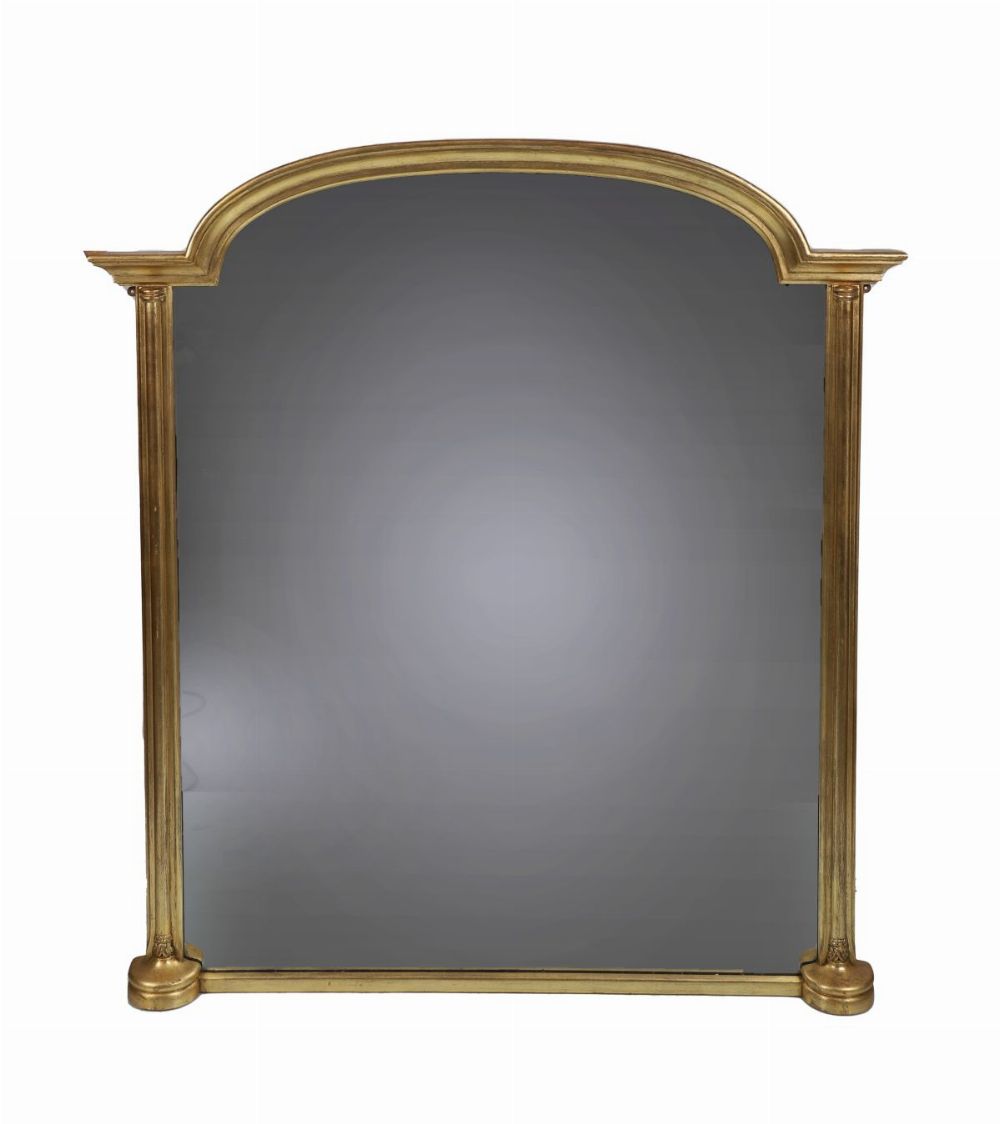 A substantial giltwood overmantel mirror with arched top and moulded frame, raised on shaped feet. The mirror plate within a gilt slip. An impressive decorative focal piece.