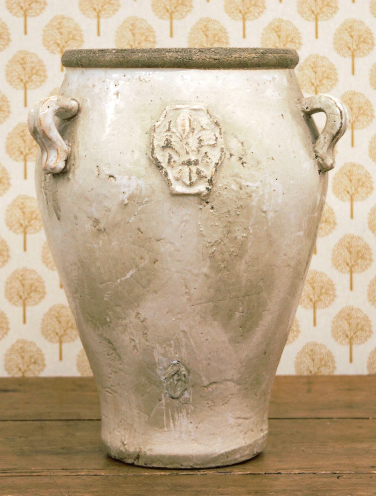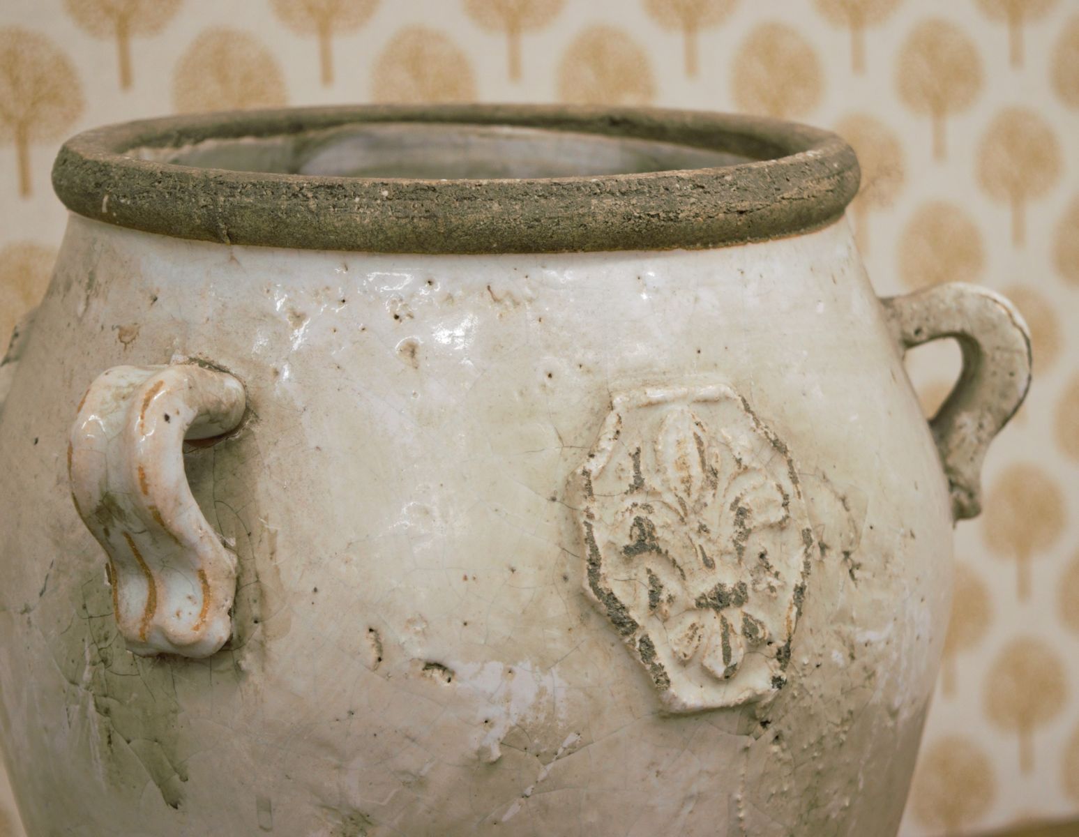 Large glazed pottery jar of ovoid form with everted rim and twin applied loop handles to the shoulder. The body decorated with an applied relief medallion to the front, the surface covered in a pale cream glaze with areas of natural wear and kiln character. Raised on a slightly tapering foot.