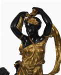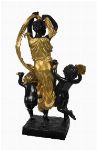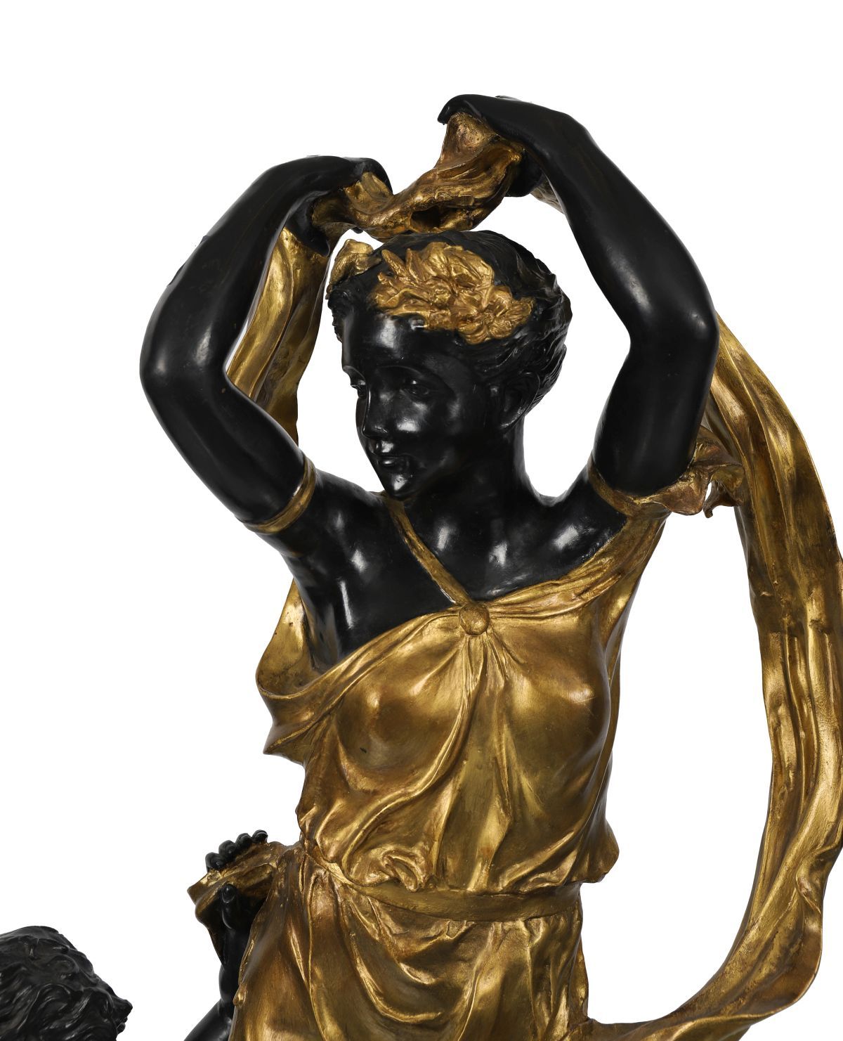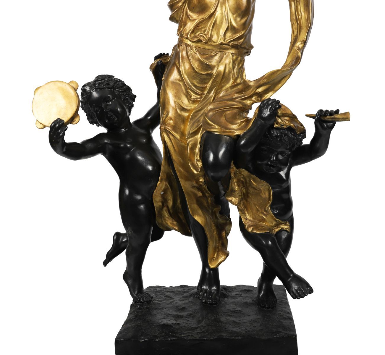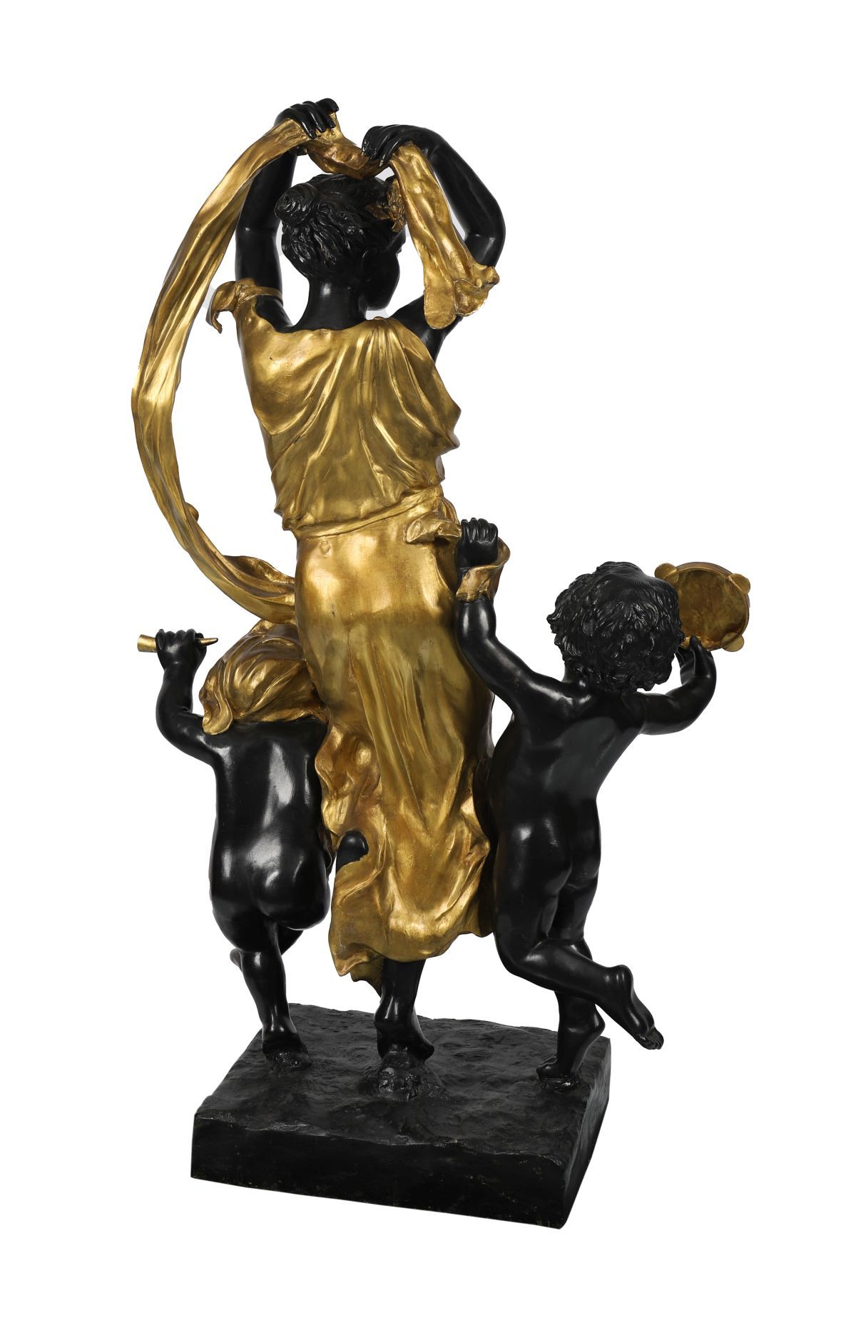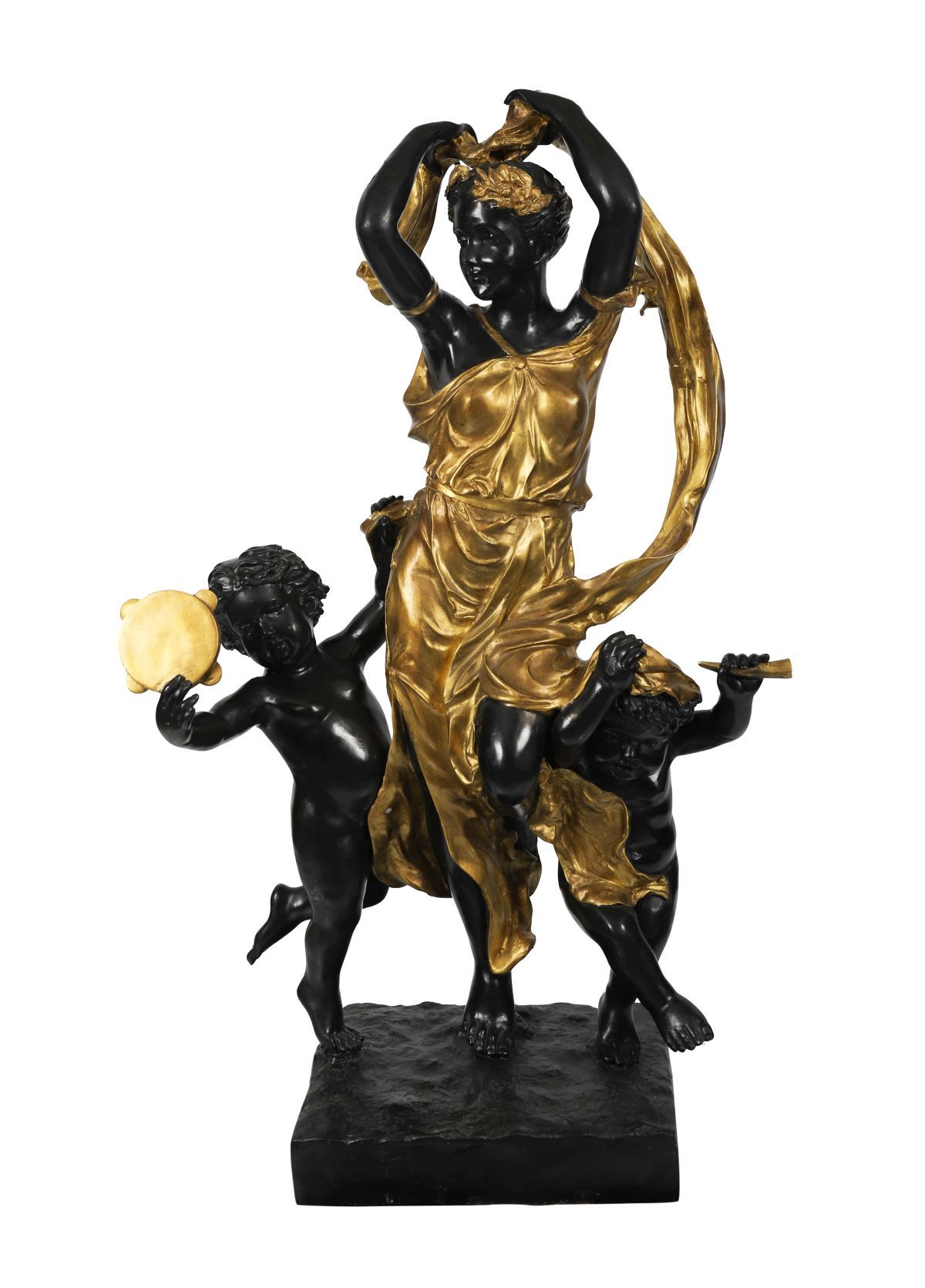 A large patinated and gilt bronze group depicting a Bacchante dancing with two playful putti, one with a tambourine and the other blowing a flute, after the celebrated model by Carrier-Belleuse. The figures classically draped and set on a rectangular base.