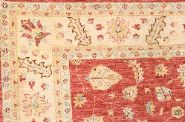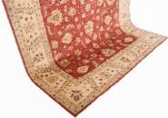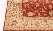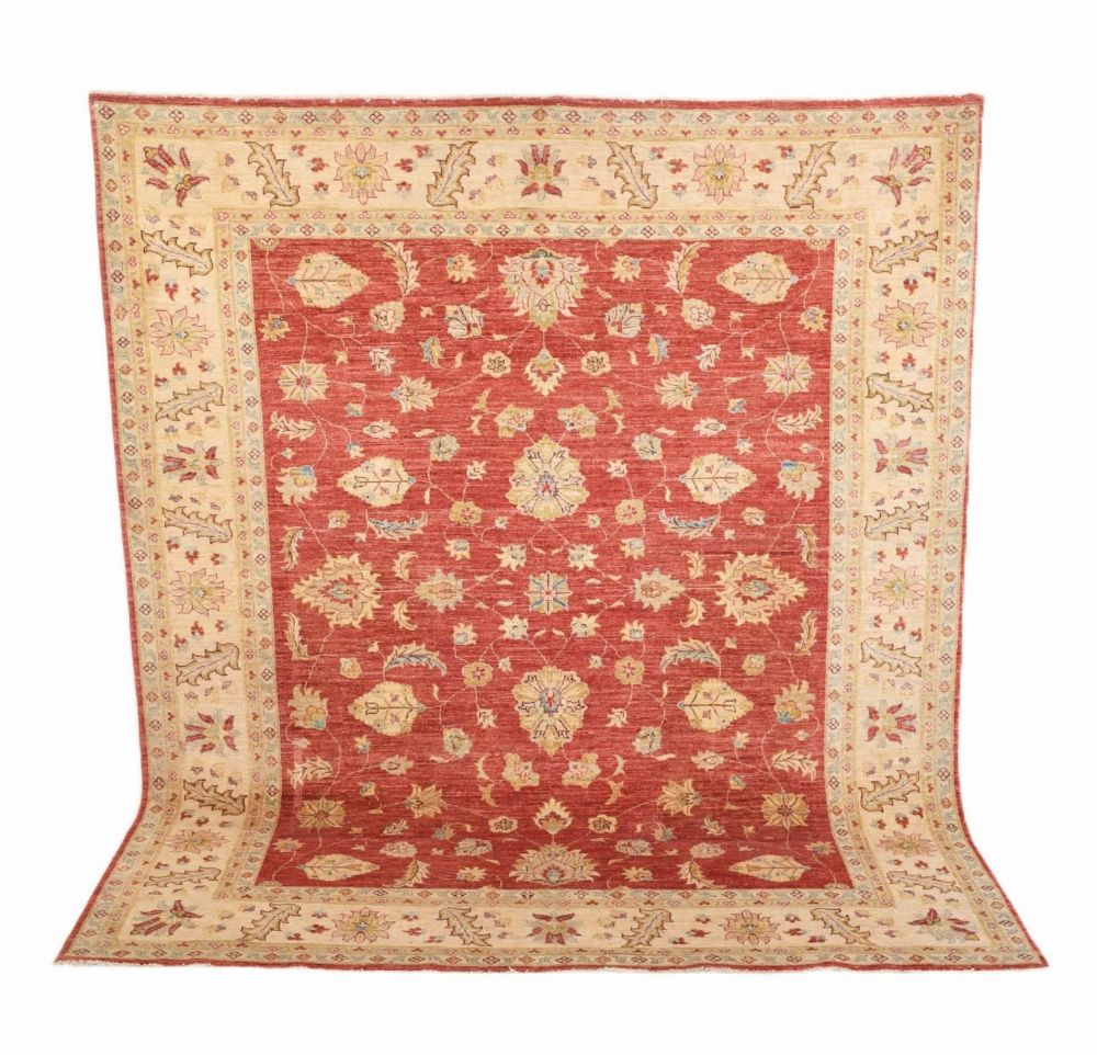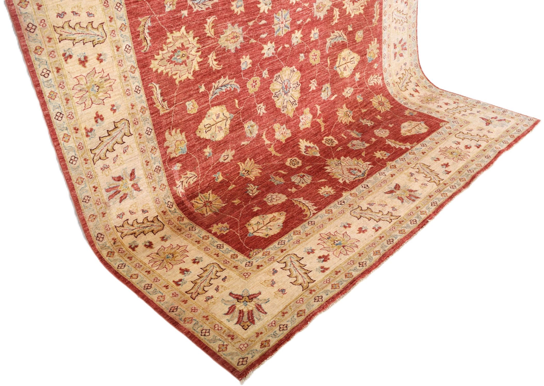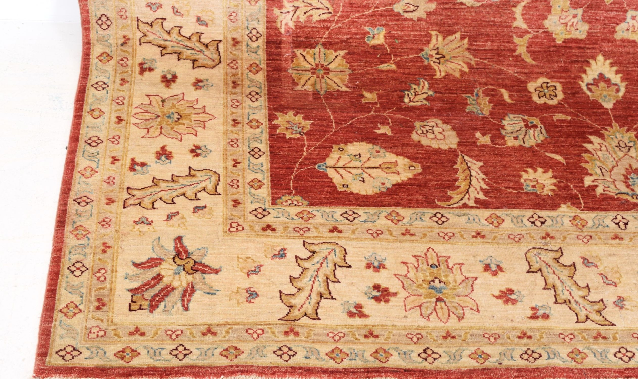 Handwoven wool carpet with red ground, repeating floral and palmette motifs in ivory, green, and ochre, enclosed by a wide cream border with stylised flowers and scrolling leaves.