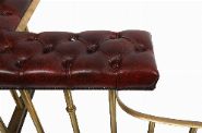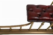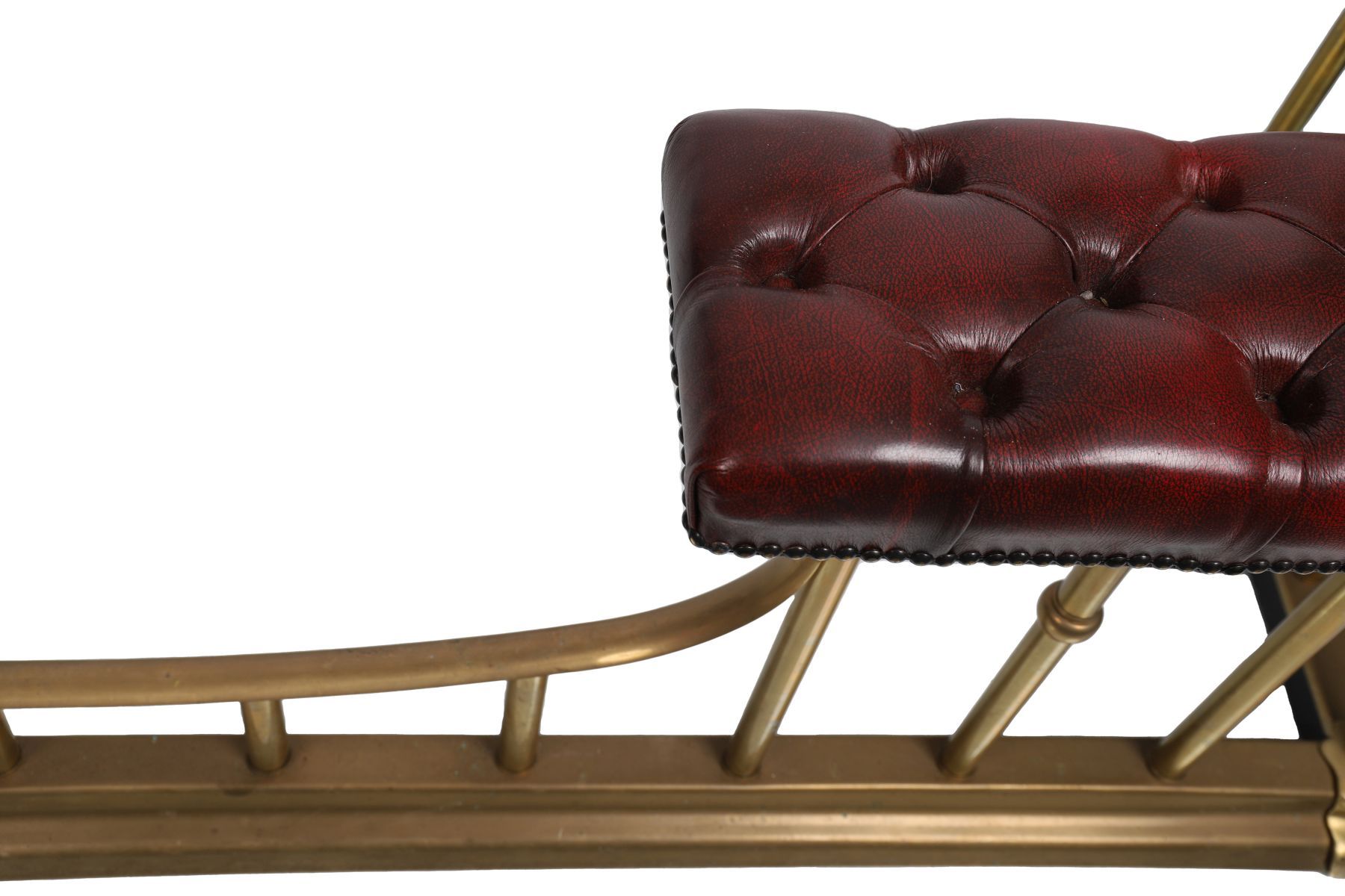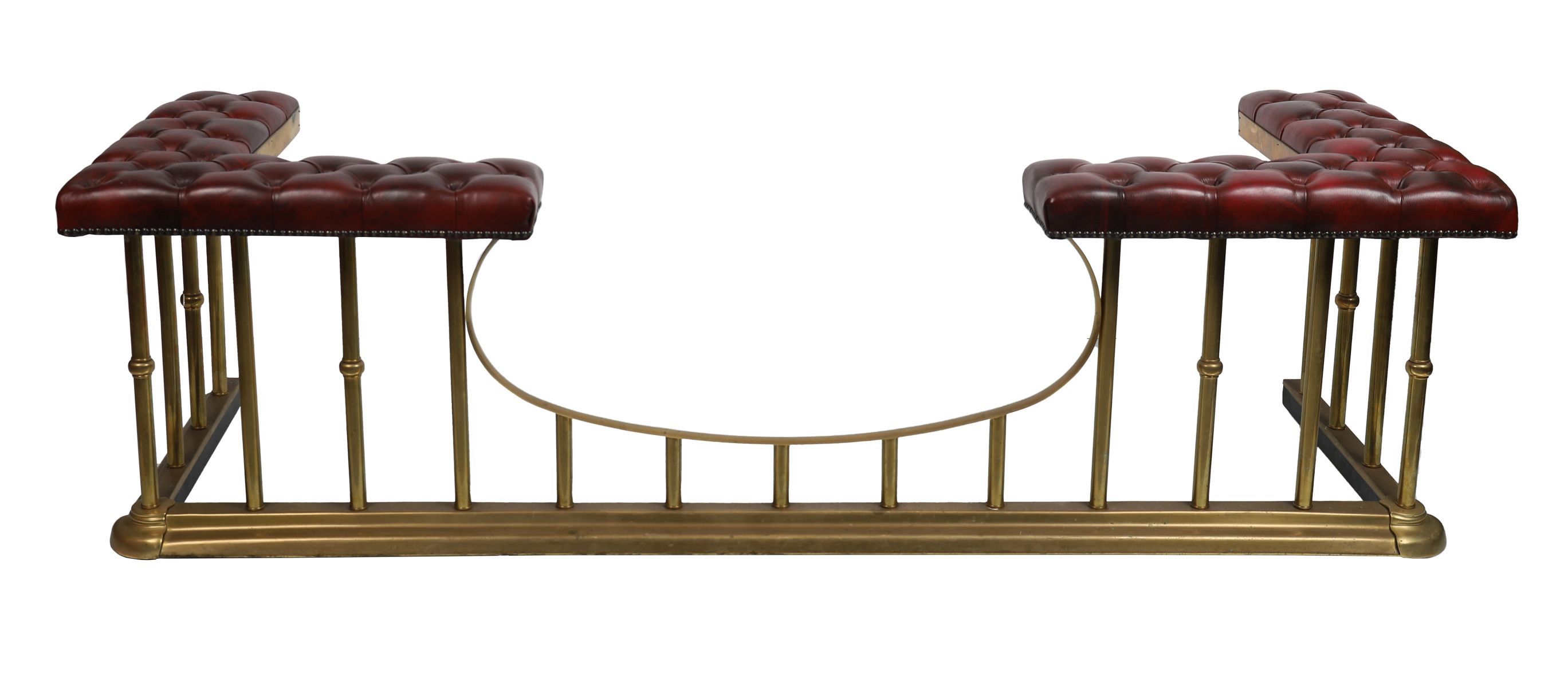 A large brass club fender with rail supports and red hide upholstered buttoned seat, raised on turned uprights.