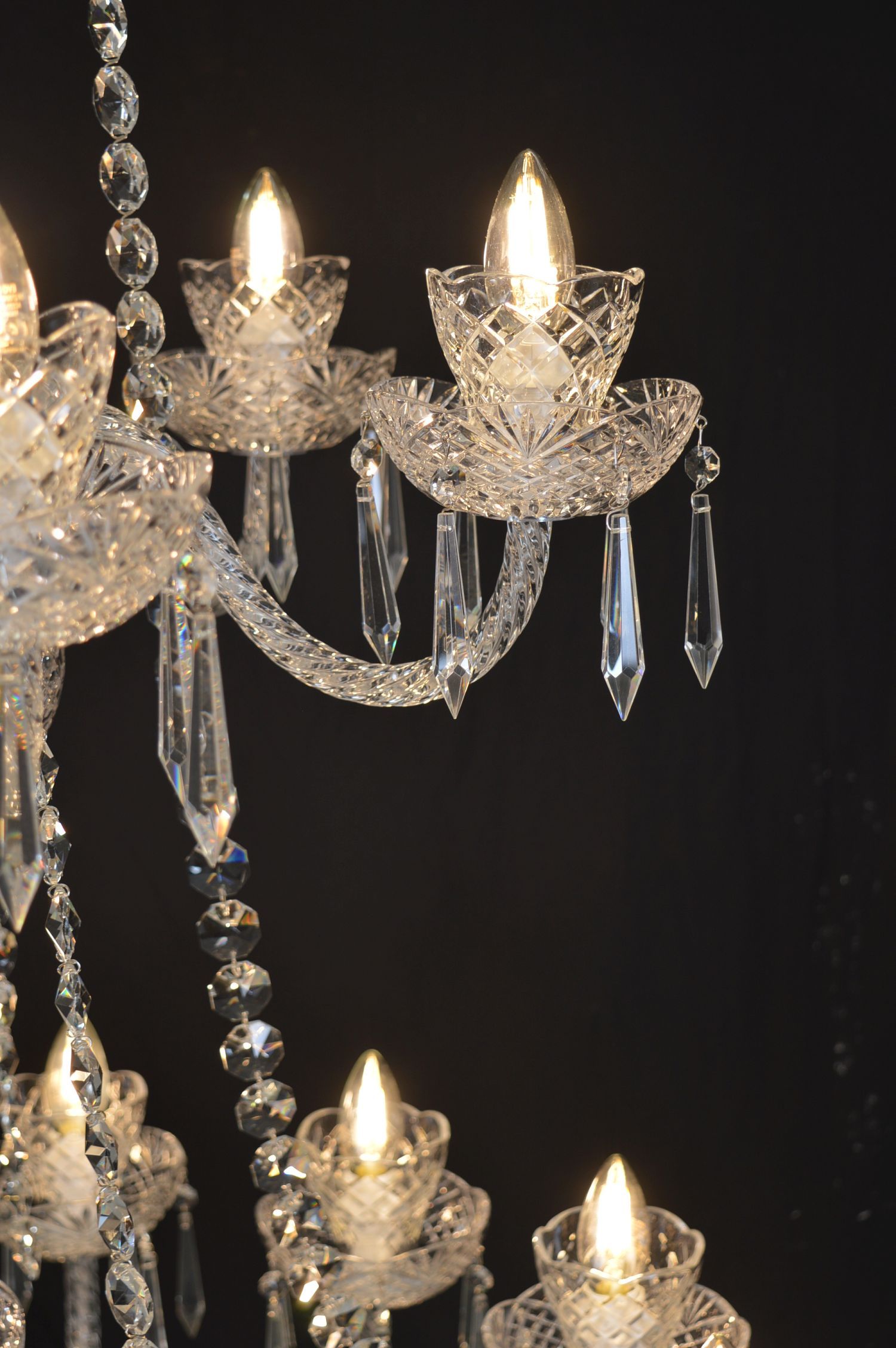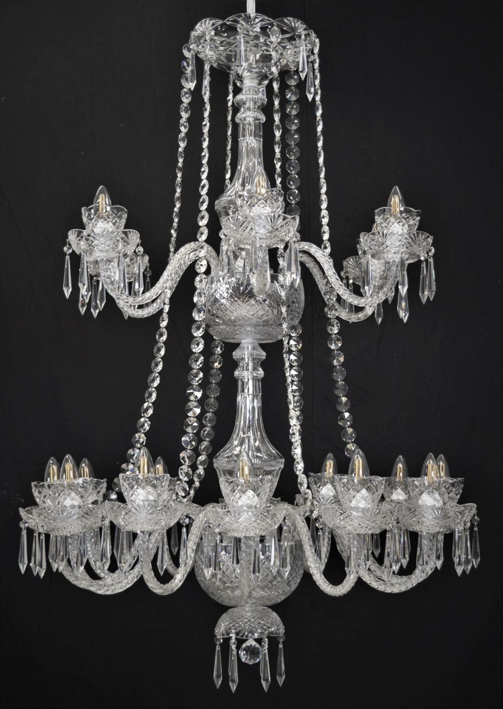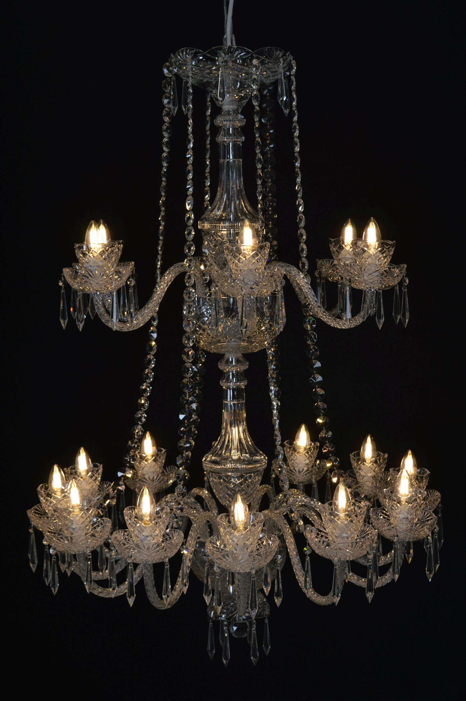 A large and impressive Irish cut crystal chandelier, with two graduated tiers supporting eighteen candle branches, the whole richly hung with cut prisms, drops, and swags.