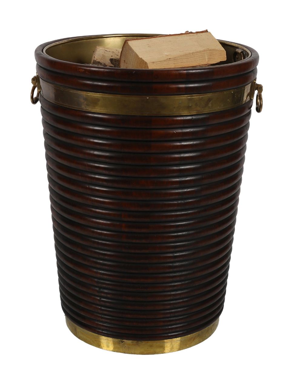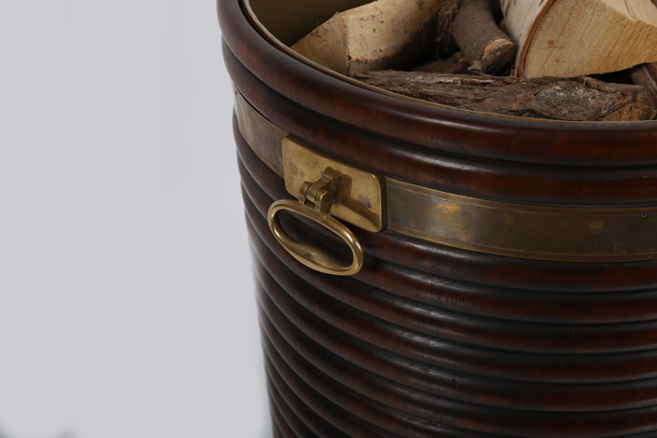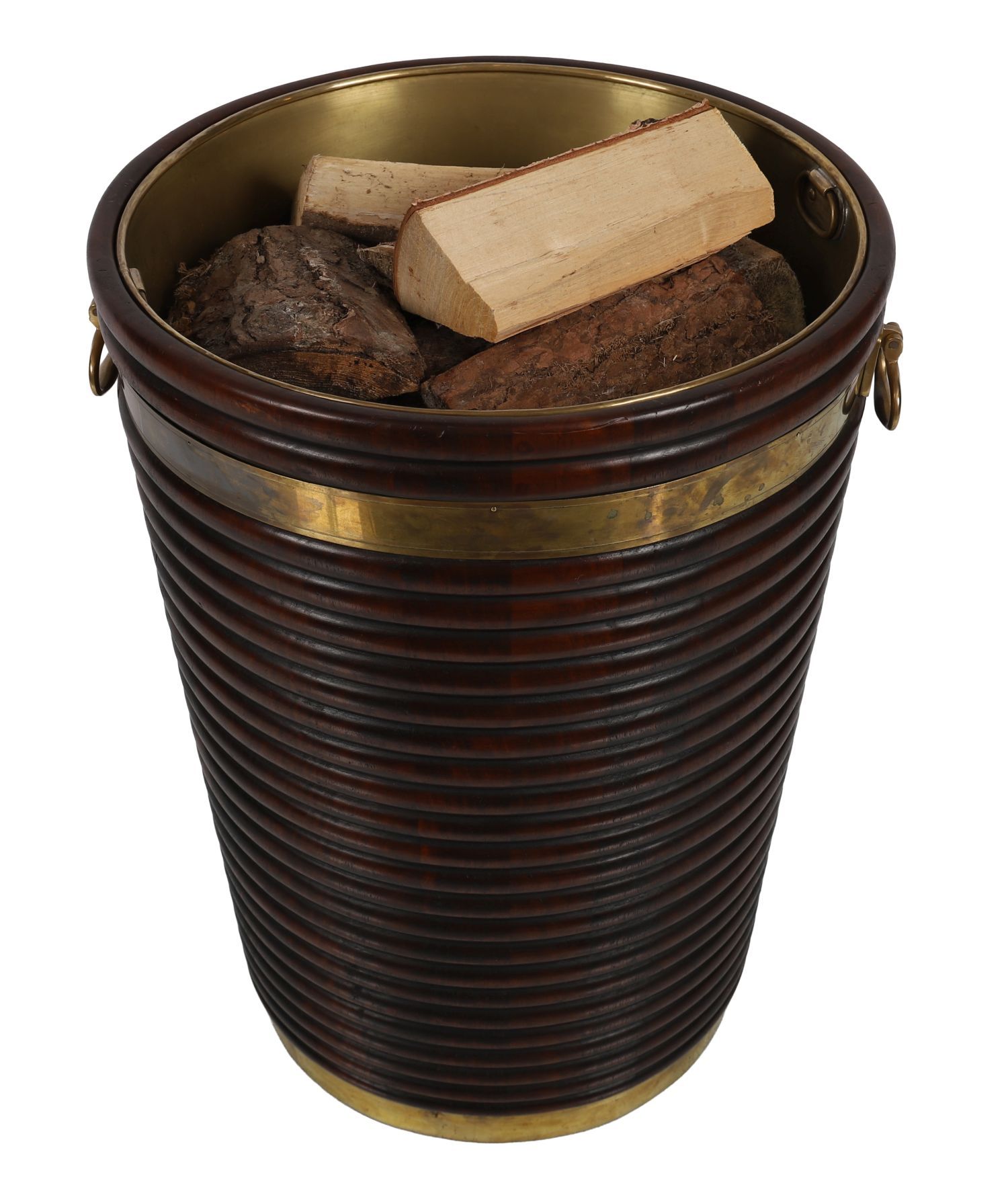 A tall estate peat bucket of tapering ribbed mahogany form, brass-bound and with brass liner and carrying handles, in the late 18th-century manner.