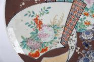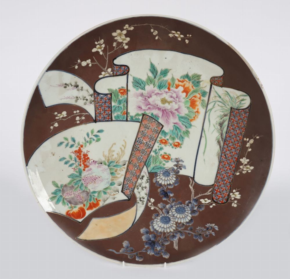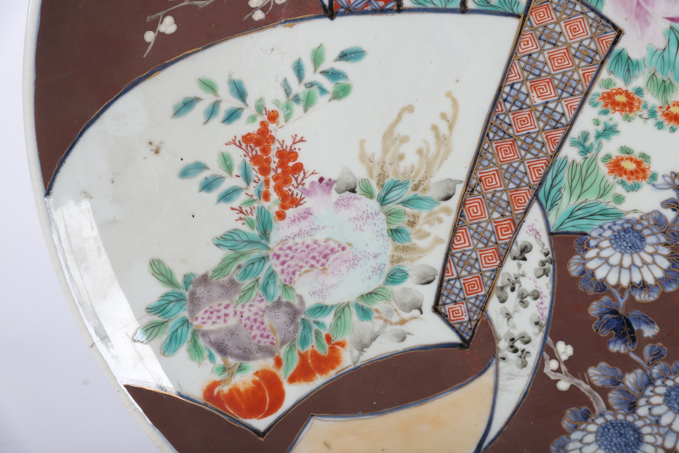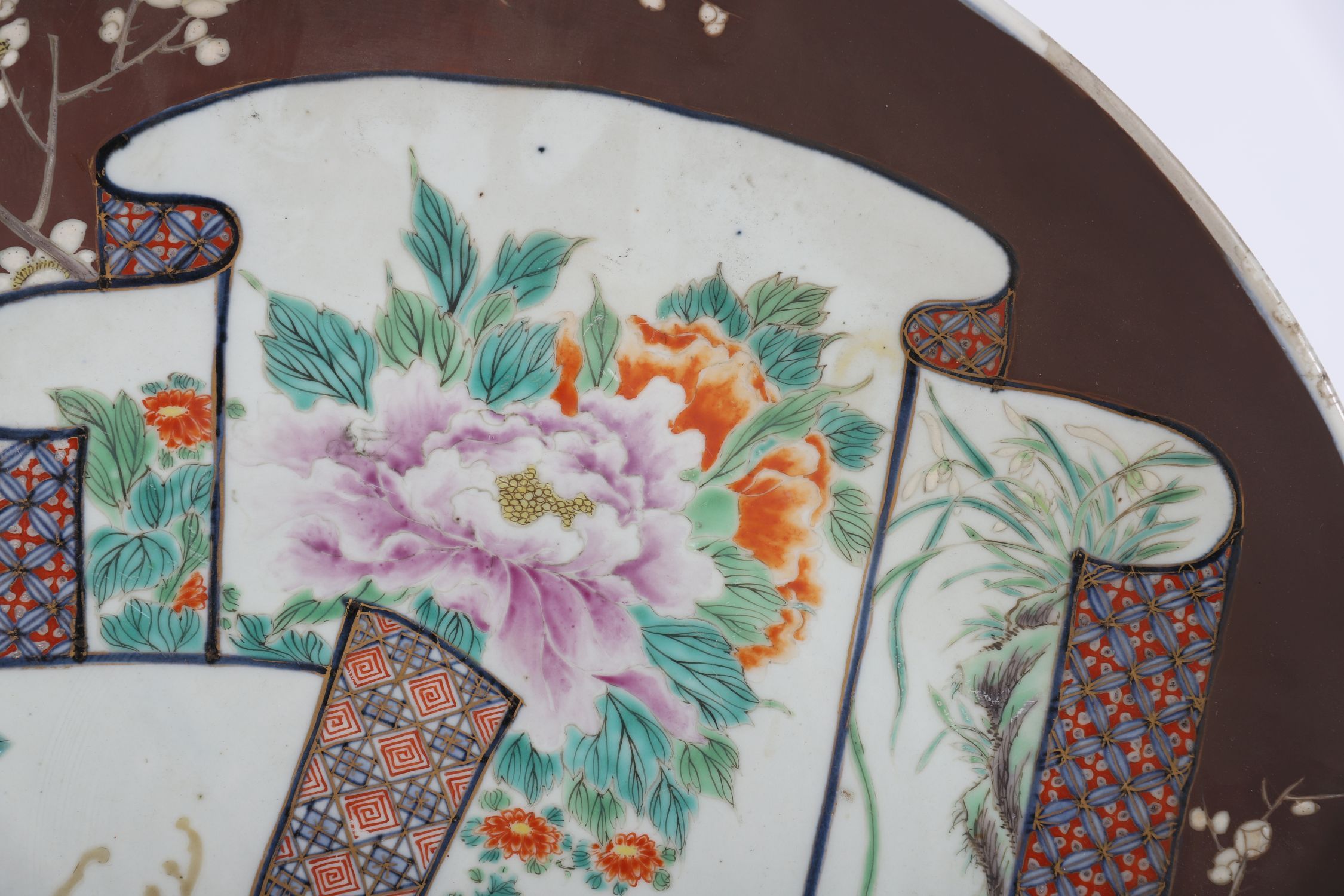 A finely enamelled large Japanese porcelain charger, decorated in the Imari palette with panels of blooming peonies, chrysanthemums, and prunus on a deep brown ground. The central field is segmented into cartouches filled with textile-like geometric patterns and floral sprays, all outlined in underglaze blue and heightened with gilt.