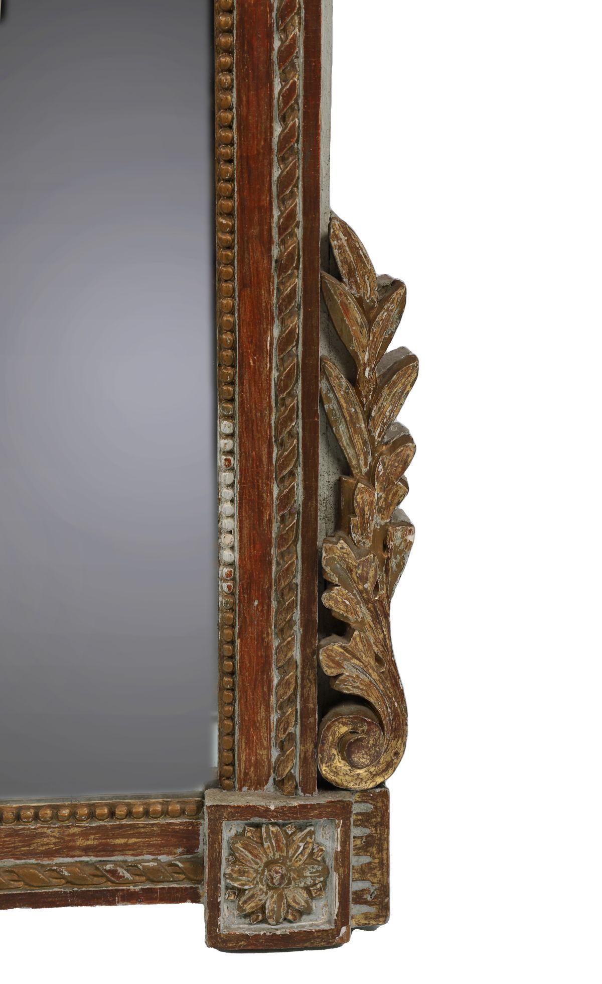 A large giltwood pier mirror in the Neoclassical style, the rectangular plate within a carved frame of laurel and rosette ornament, surmounted by an urn with scrolling acanthus and floral sprays. Original gilding and mirror plate.