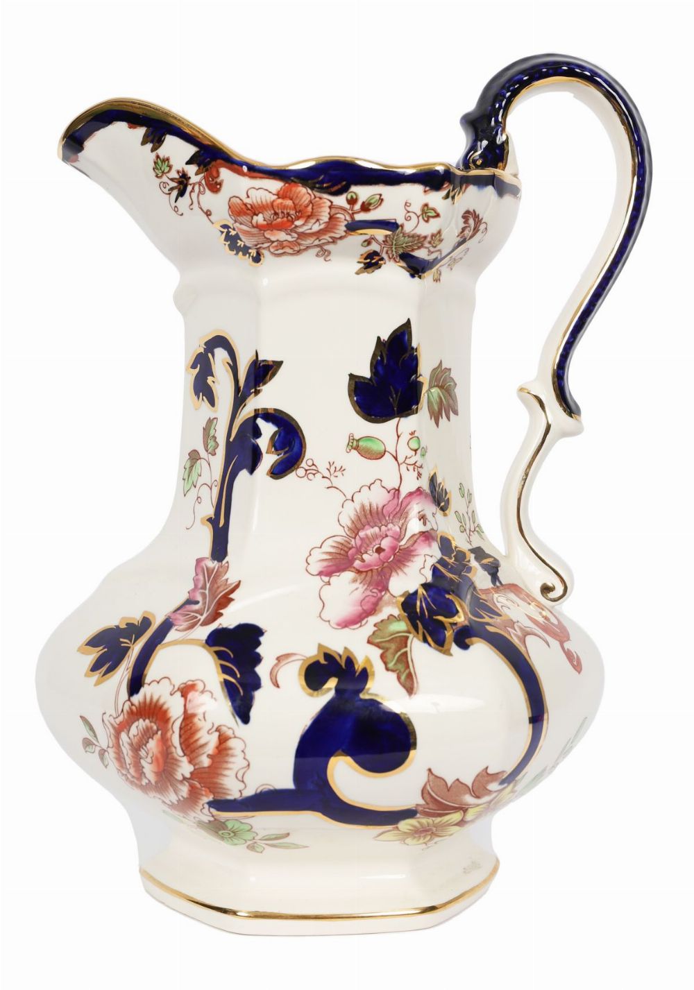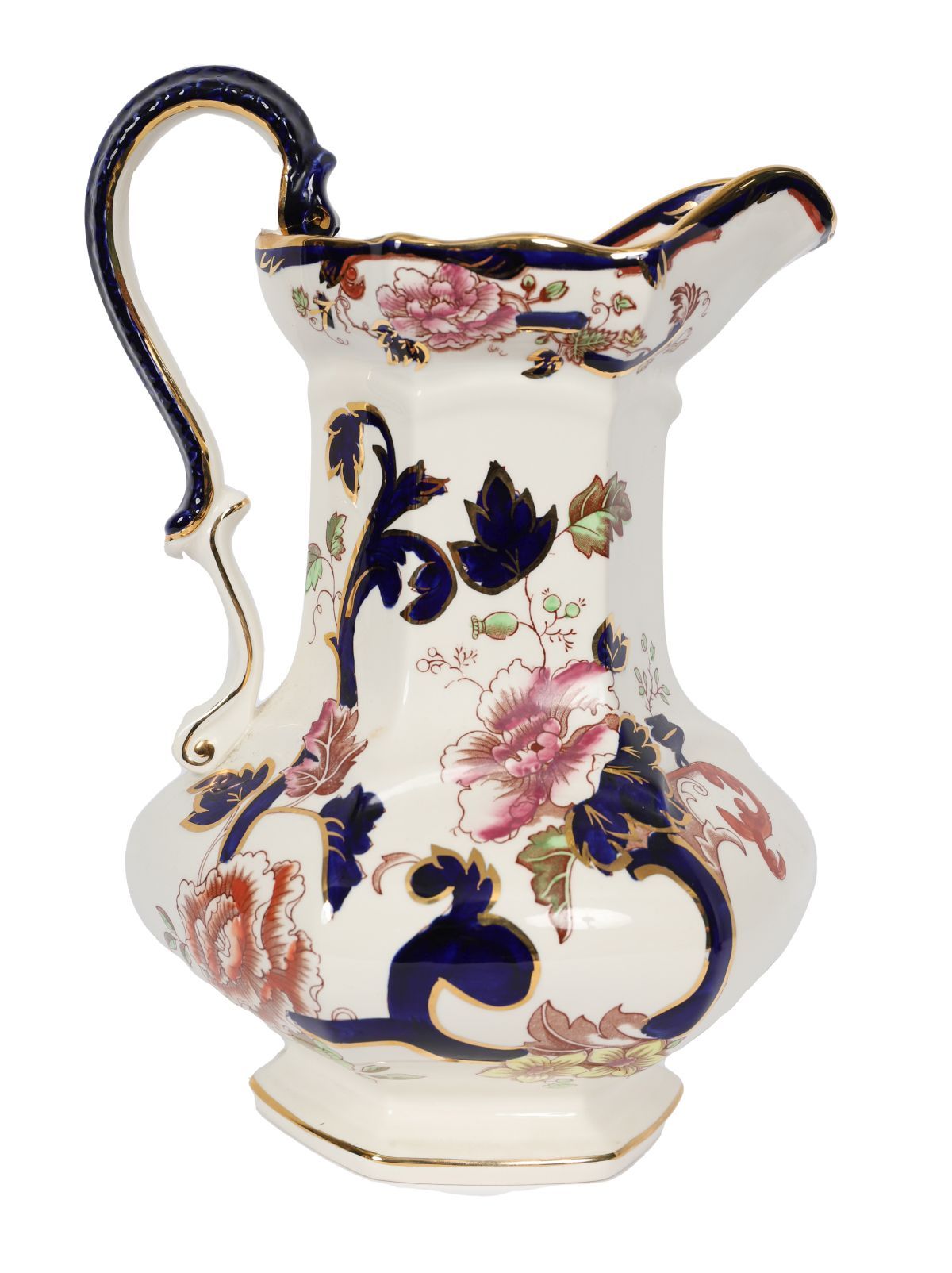 A large Mason’s Ironstone jug in the Imari palette, of baluster form with shaped spout and scroll handle, decorated with floral sprays and scrolling foliage in cobalt blue, iron-red and gilt.