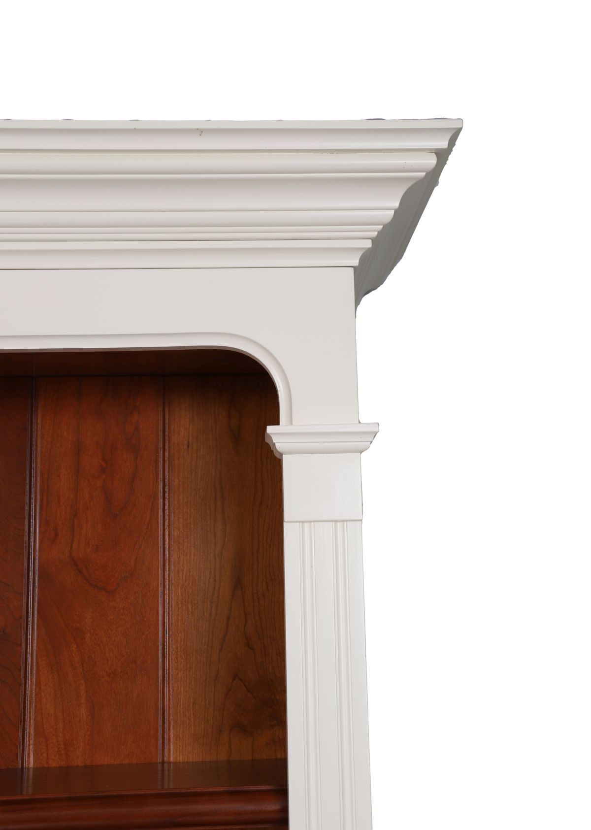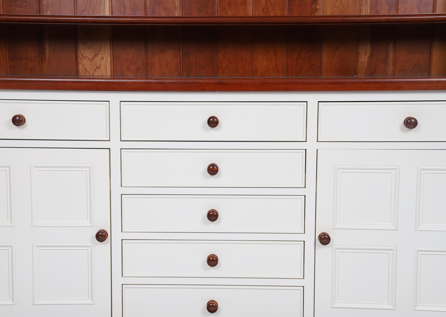 the upper section with open shelves above a series of drawers and panelled doors furnished with turned wooden knobs.