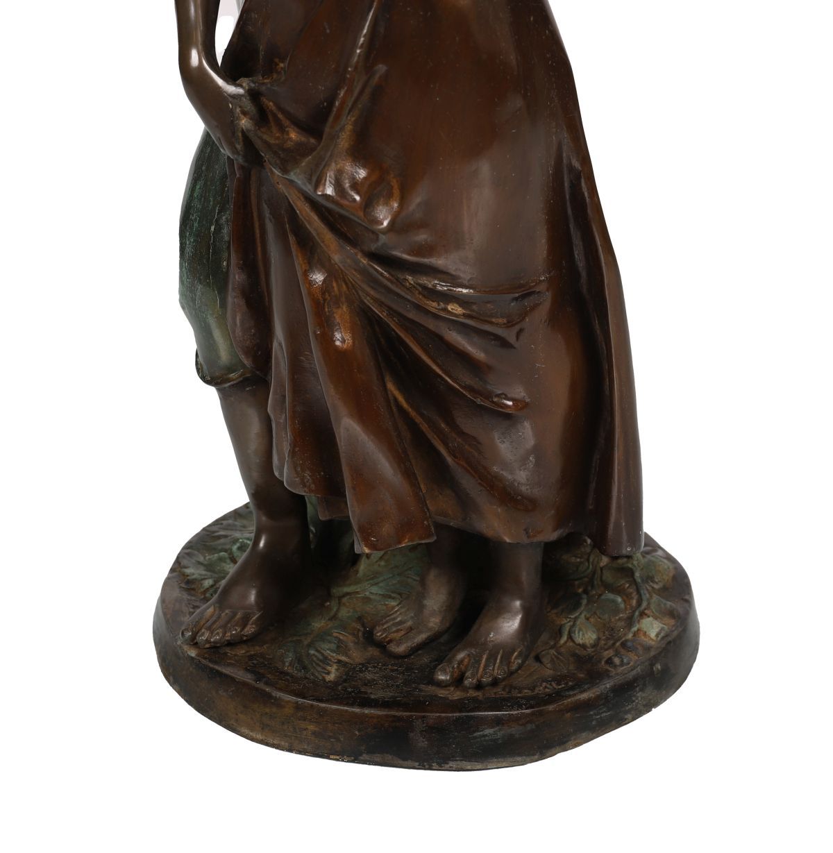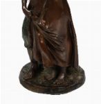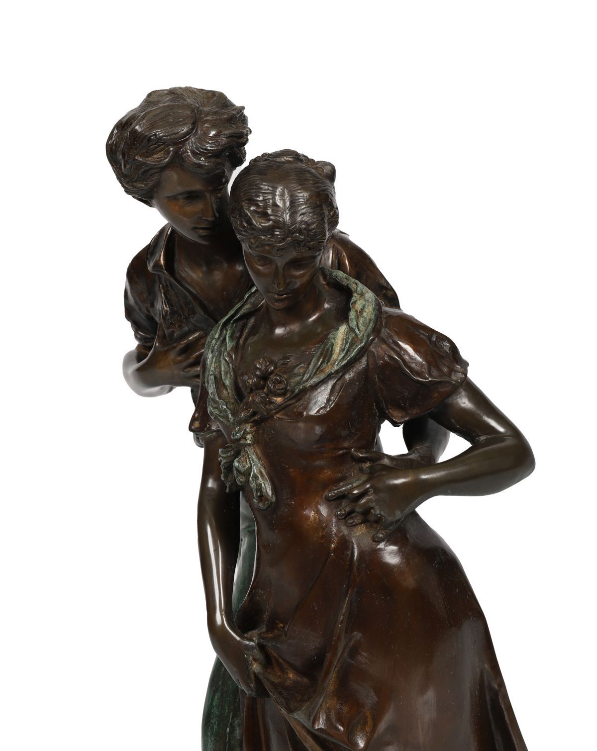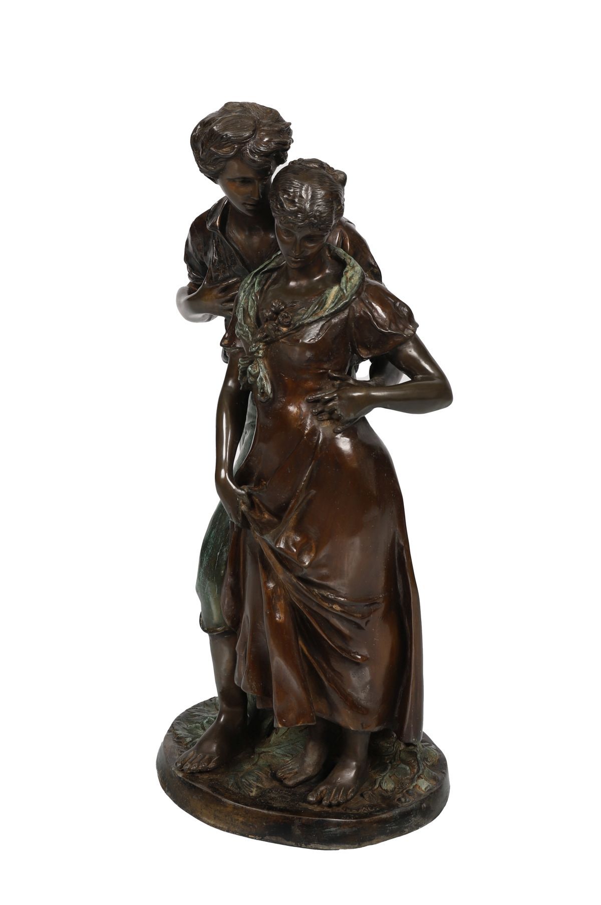 Substantial bronze group depicting a young couple in rustic dress, the male figure standing protectively beside the girl, both finely modelled with naturalistic detail and textured surface. Mounted on circular base.
