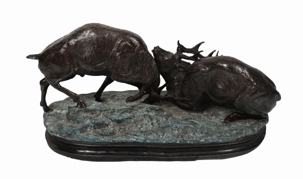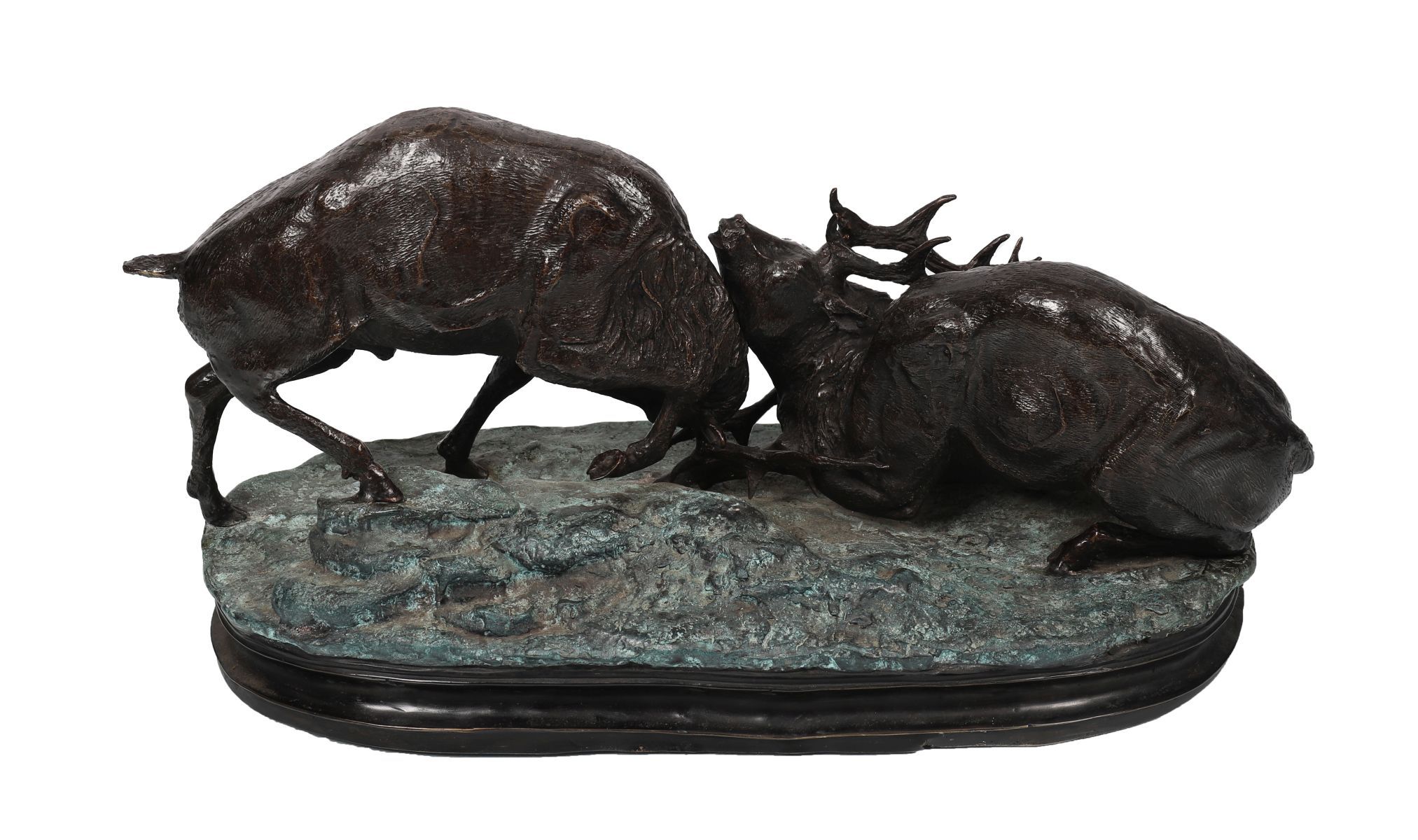 A substantial patinated bronze sculpture depicting two stags in combat, modelled with fine anatomical detail and naturalistic movement, set on an integral textured base.