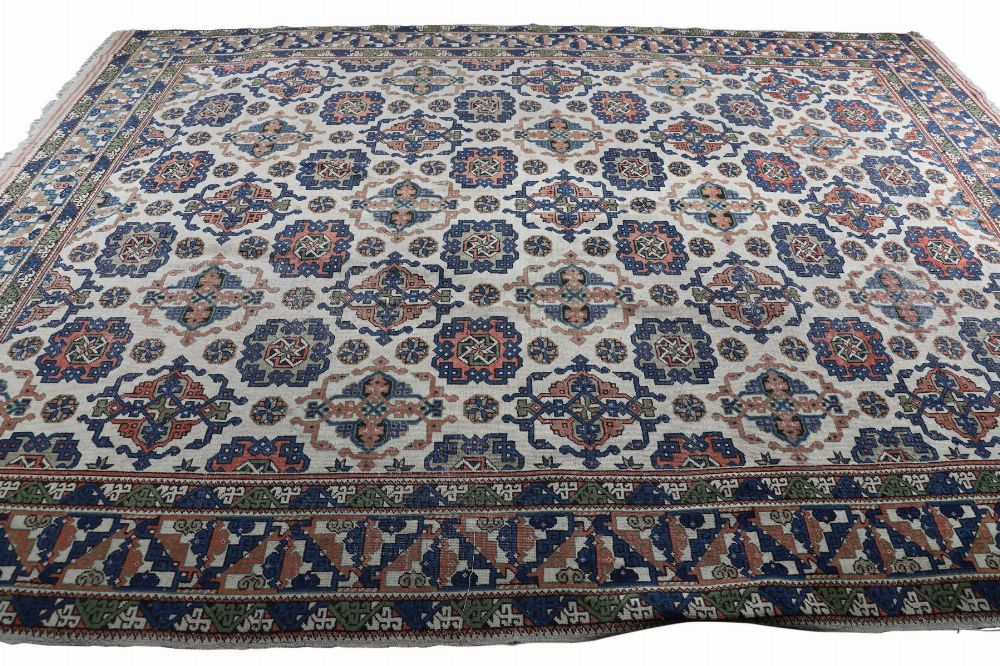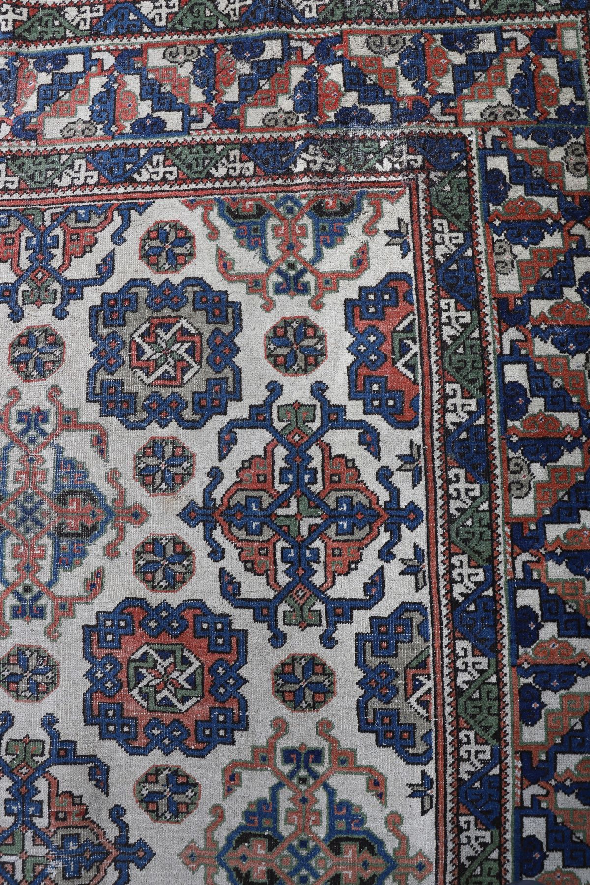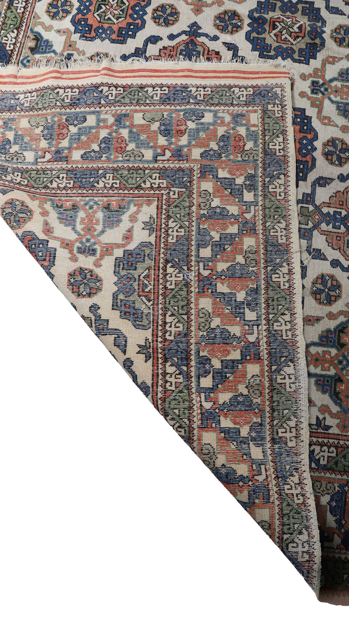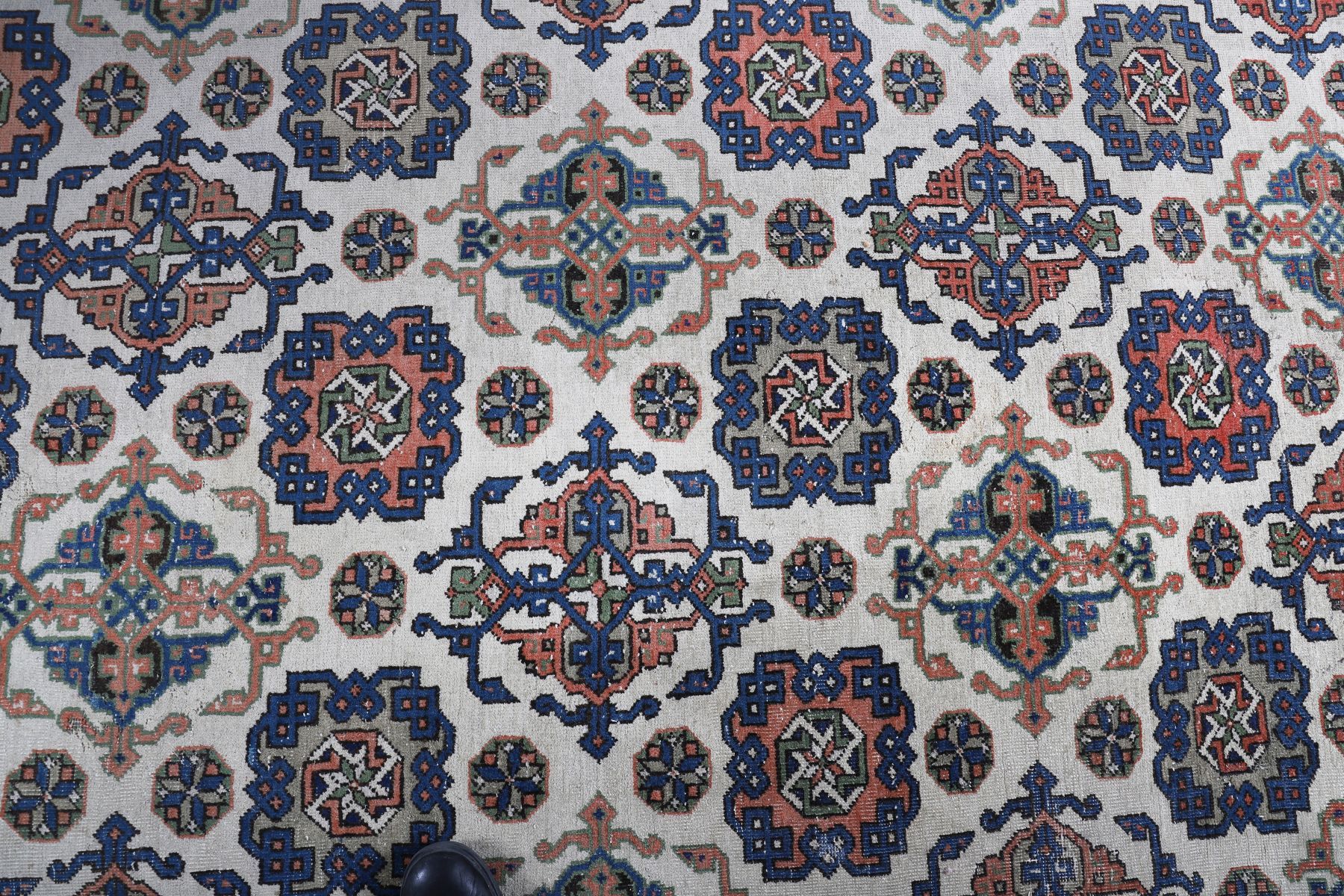 A large handwoven Persian Heriz carpet, the ivory field decorated with an all-over arrangement of linked geometric medallions in terracotta, indigo, and soft green tones, enclosed within multiple stylised borders featuring repeating angular motifs.