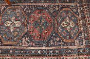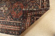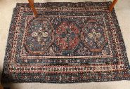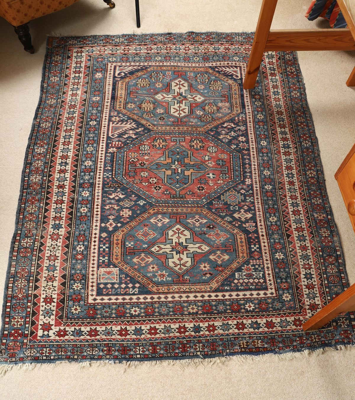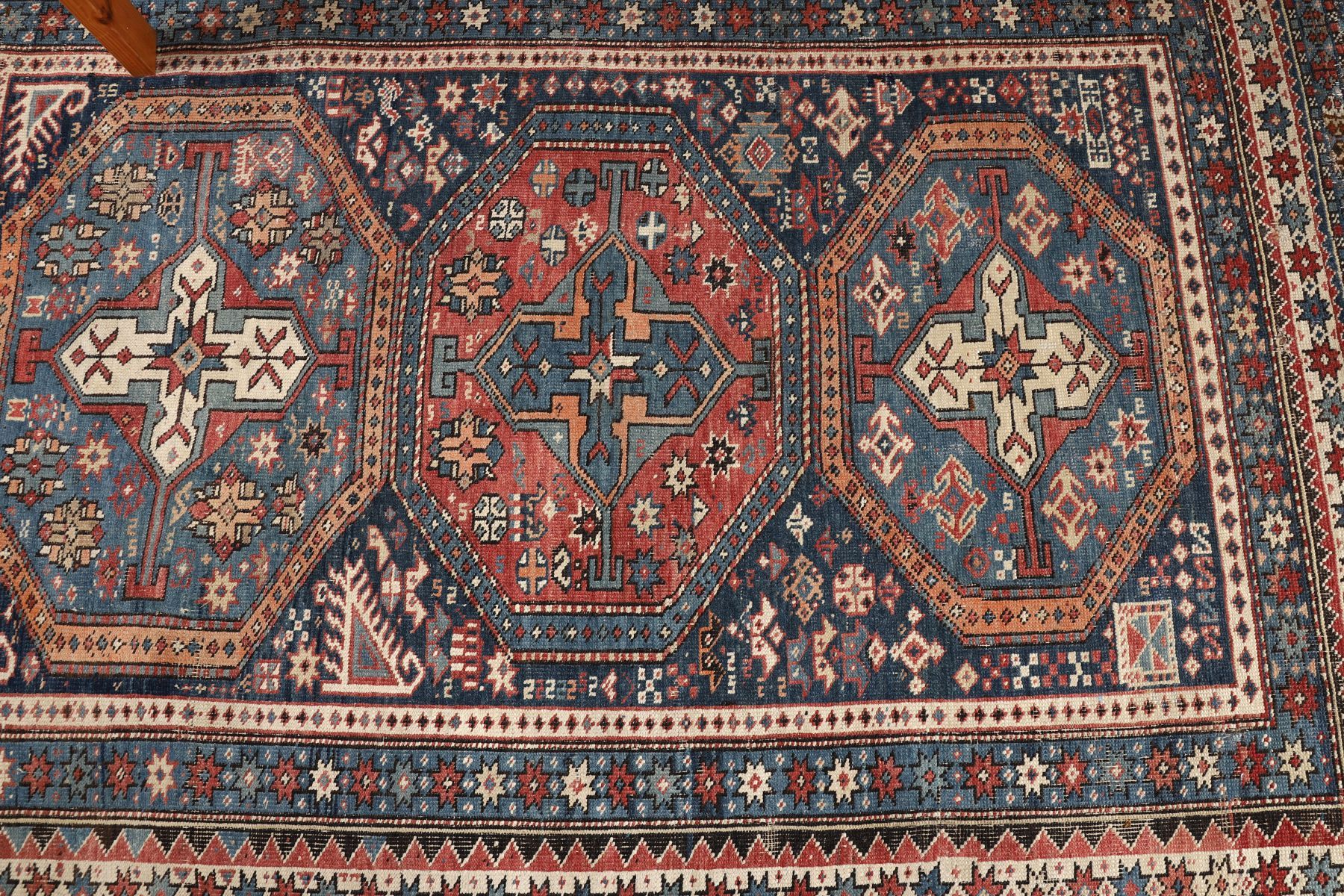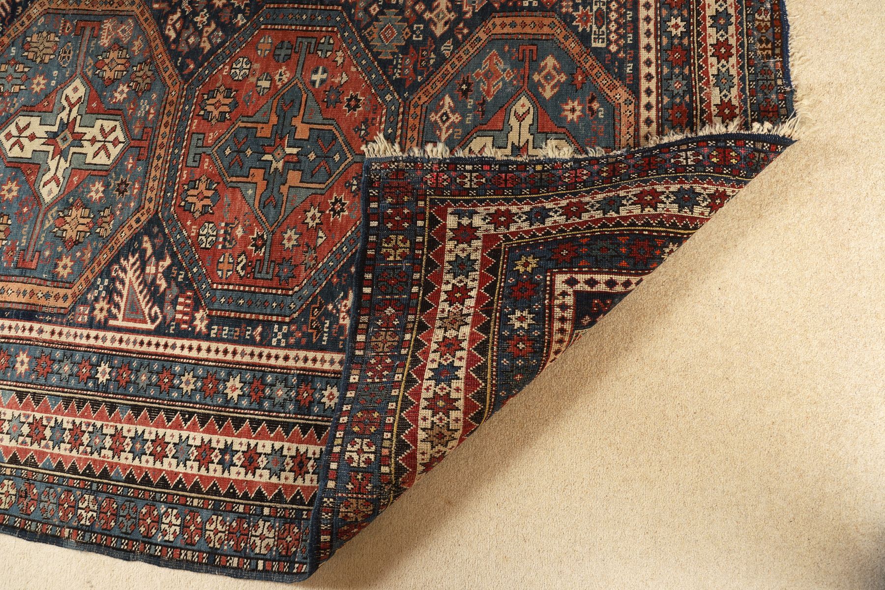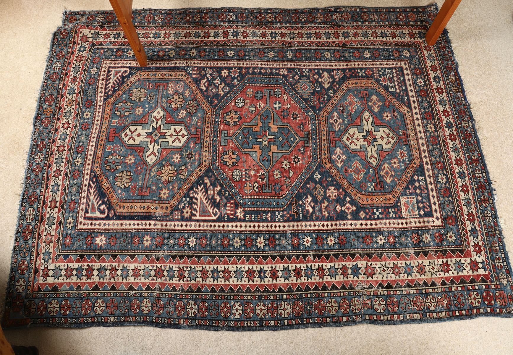 Large Persian wool rug, the field centred by three octagonal medallions within a dense geometric ground, framed by multiple guard borders with stylised floral and tribal motifs. Rich palette of indigo, madder red and ivory.