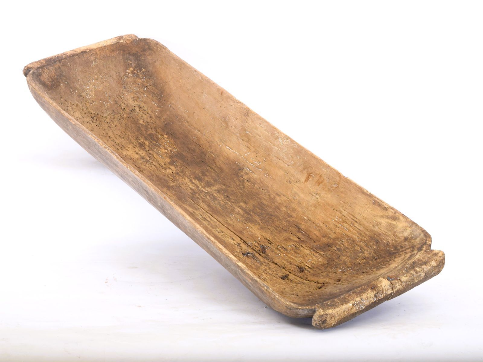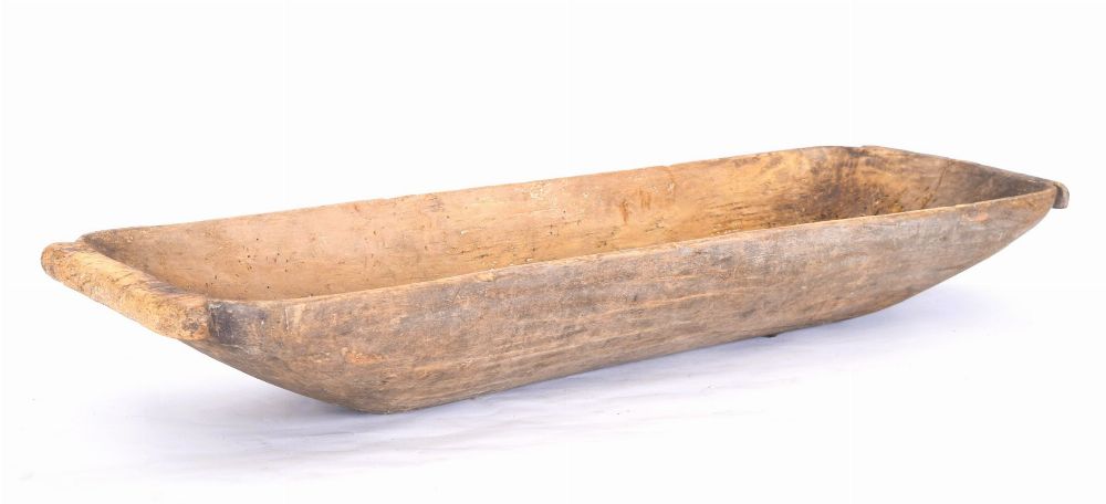 Large pine dough trough of elongated rectangular form with shaped ends.