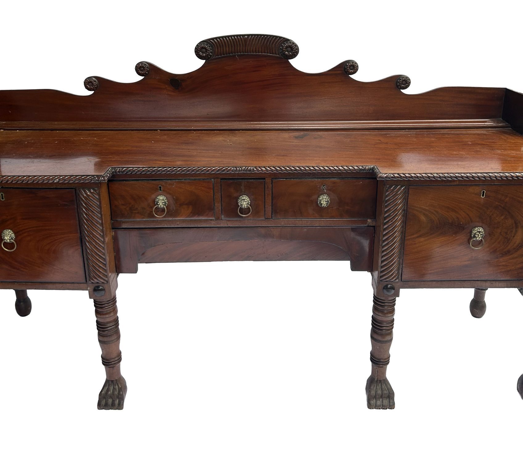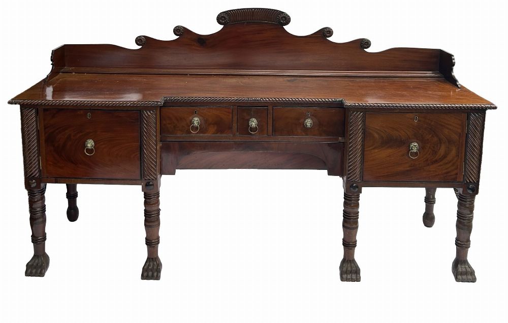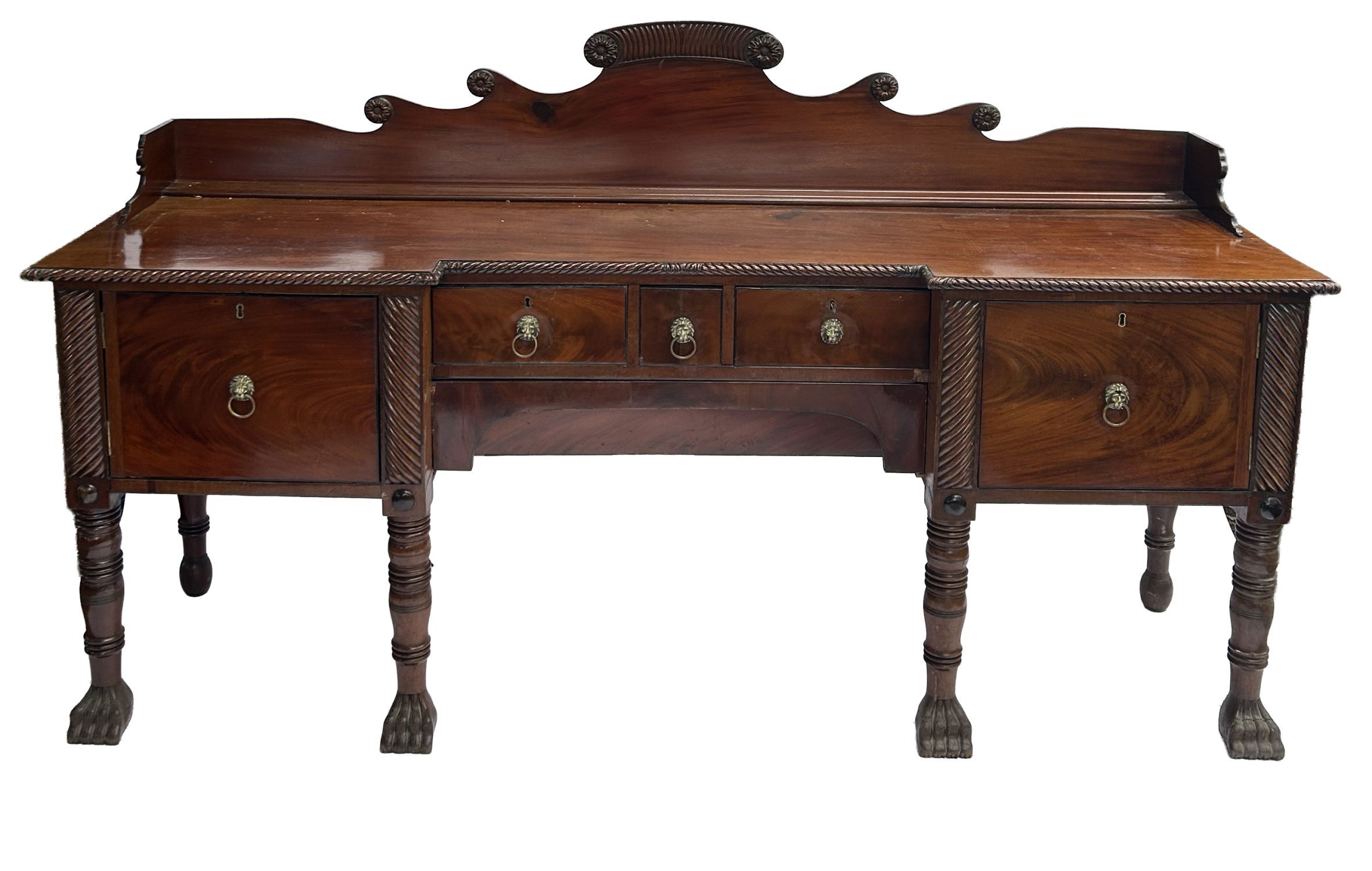 A fine Regency mahogany sideboard of serpentine outline, with rope-carved edges, central drawers and cupboards, flanked by pedestal cupboards, raised on turned and reeded legs with lion paw feet.