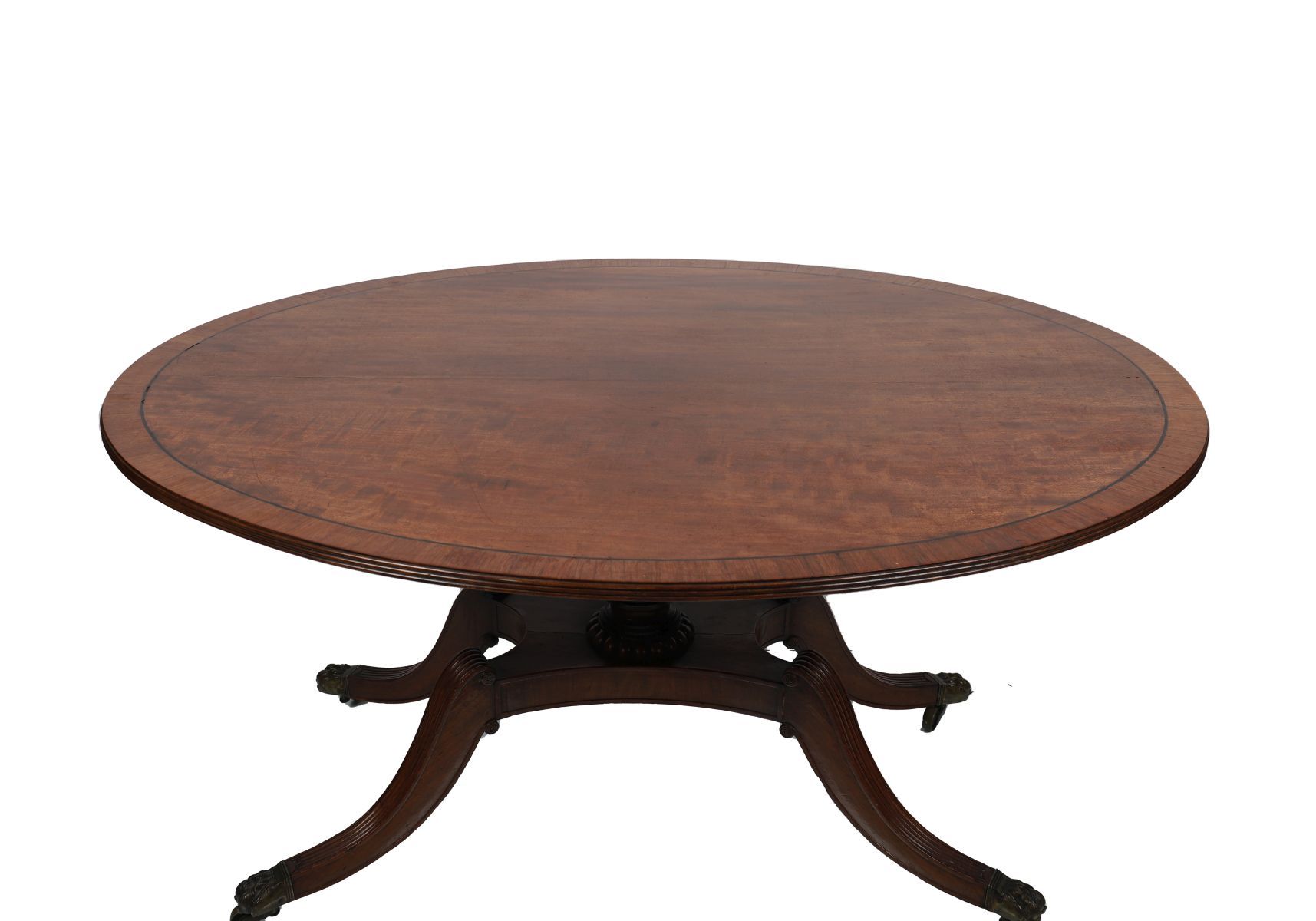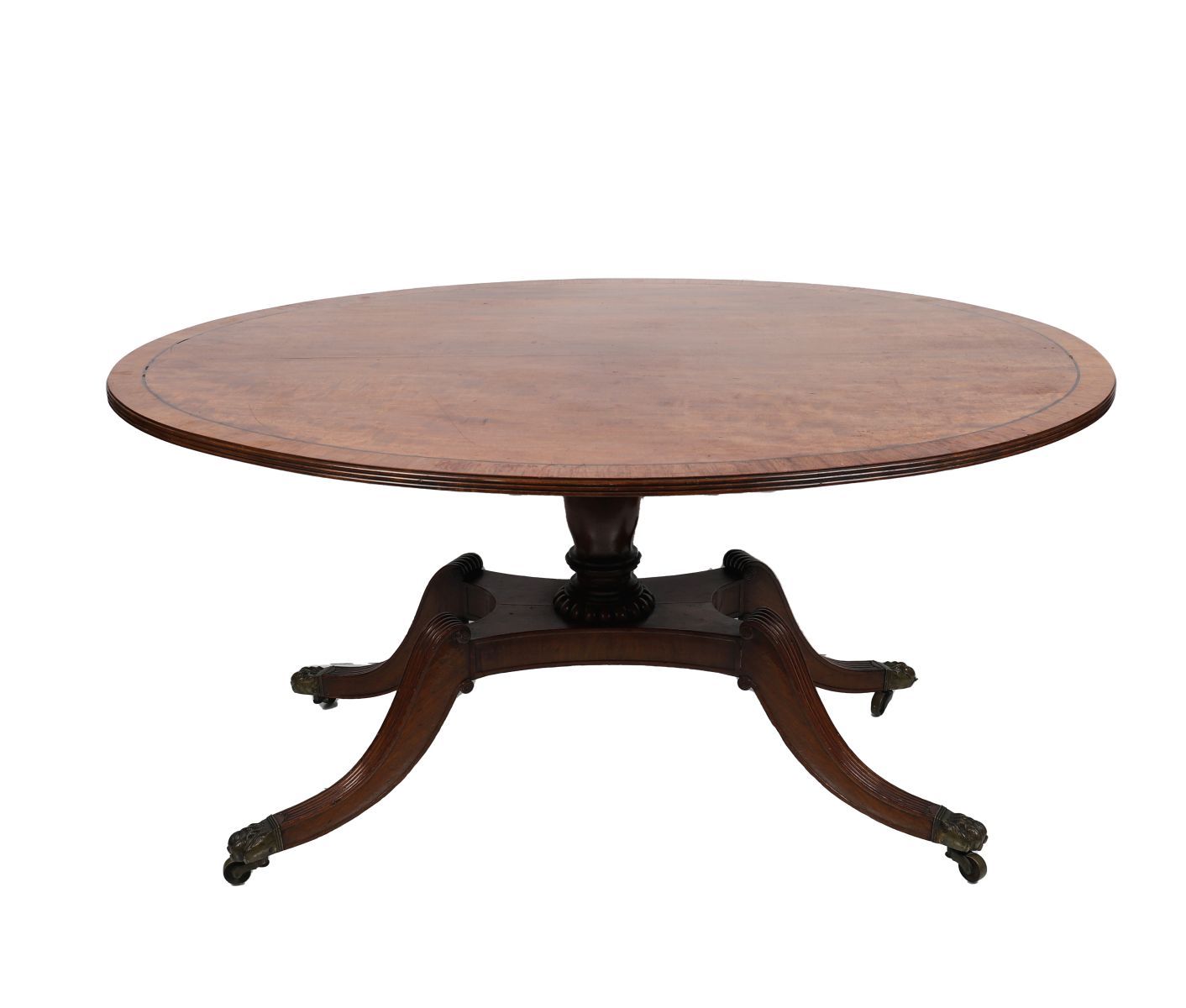 The well-figured circular top with crossbanded edge, on turned column support and four reeded sabre legs with brass caps and castors.