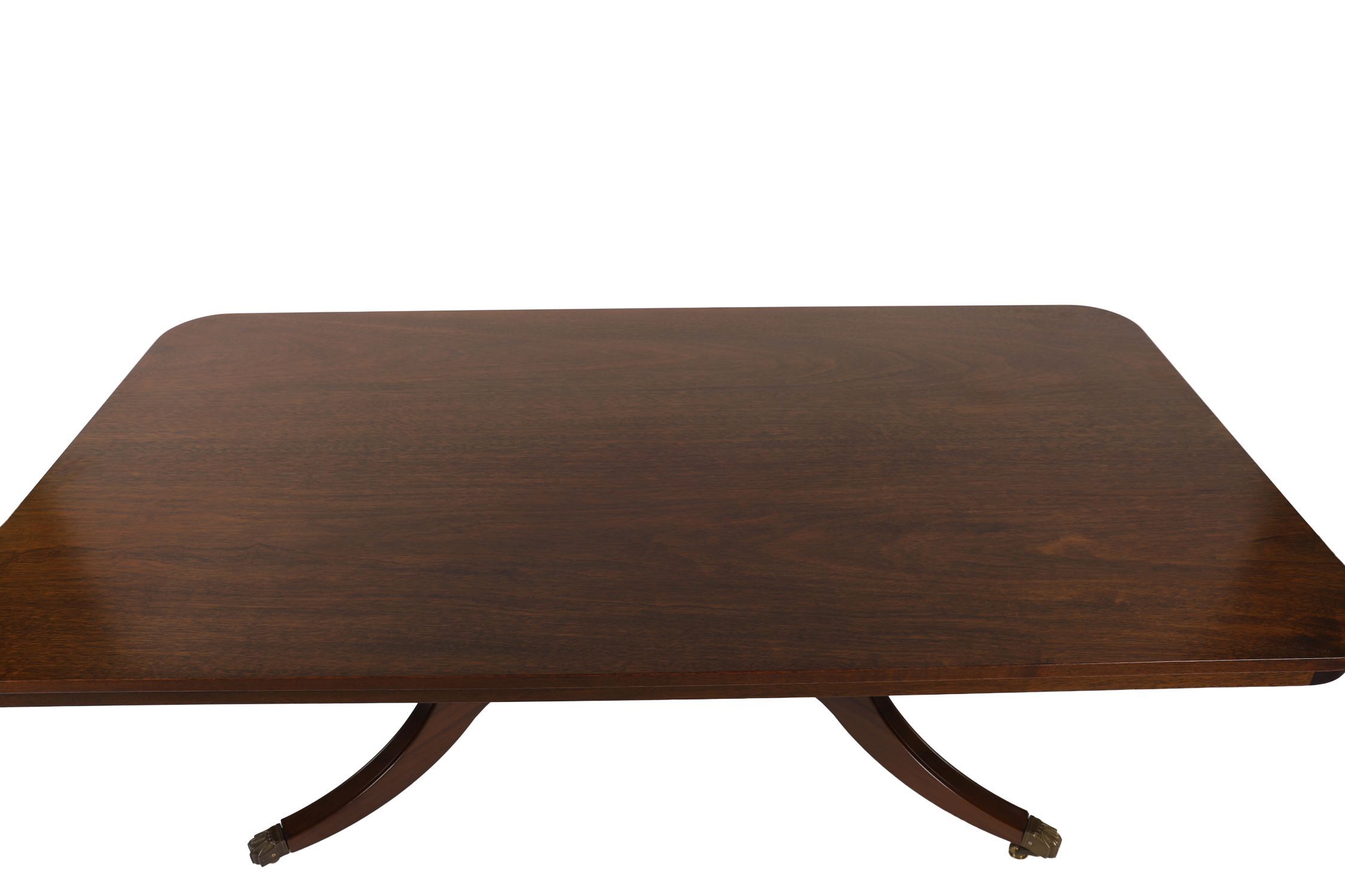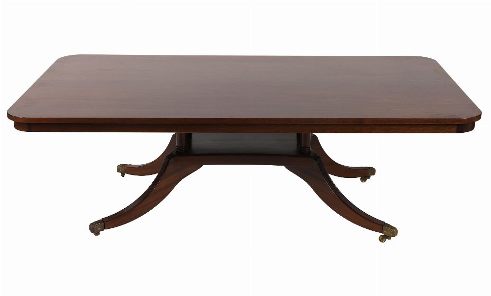 A large Regency style coffee table, the rectangular shaped top with rounded corners raised on a turned central stem and sabre-legged pod terminating in brass castors. Polished mahogany finish with classic period proportions.