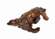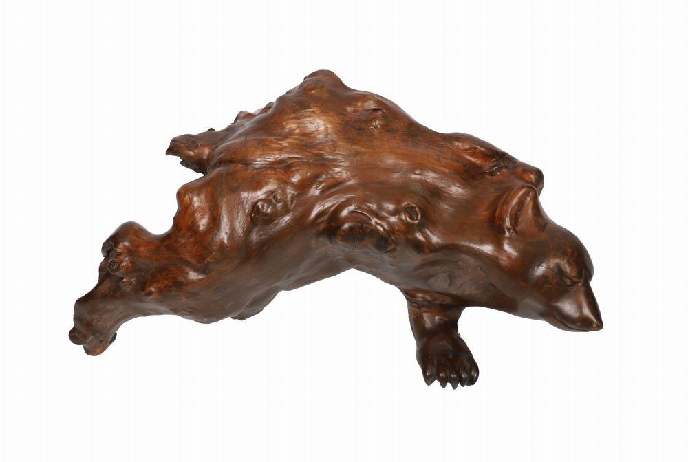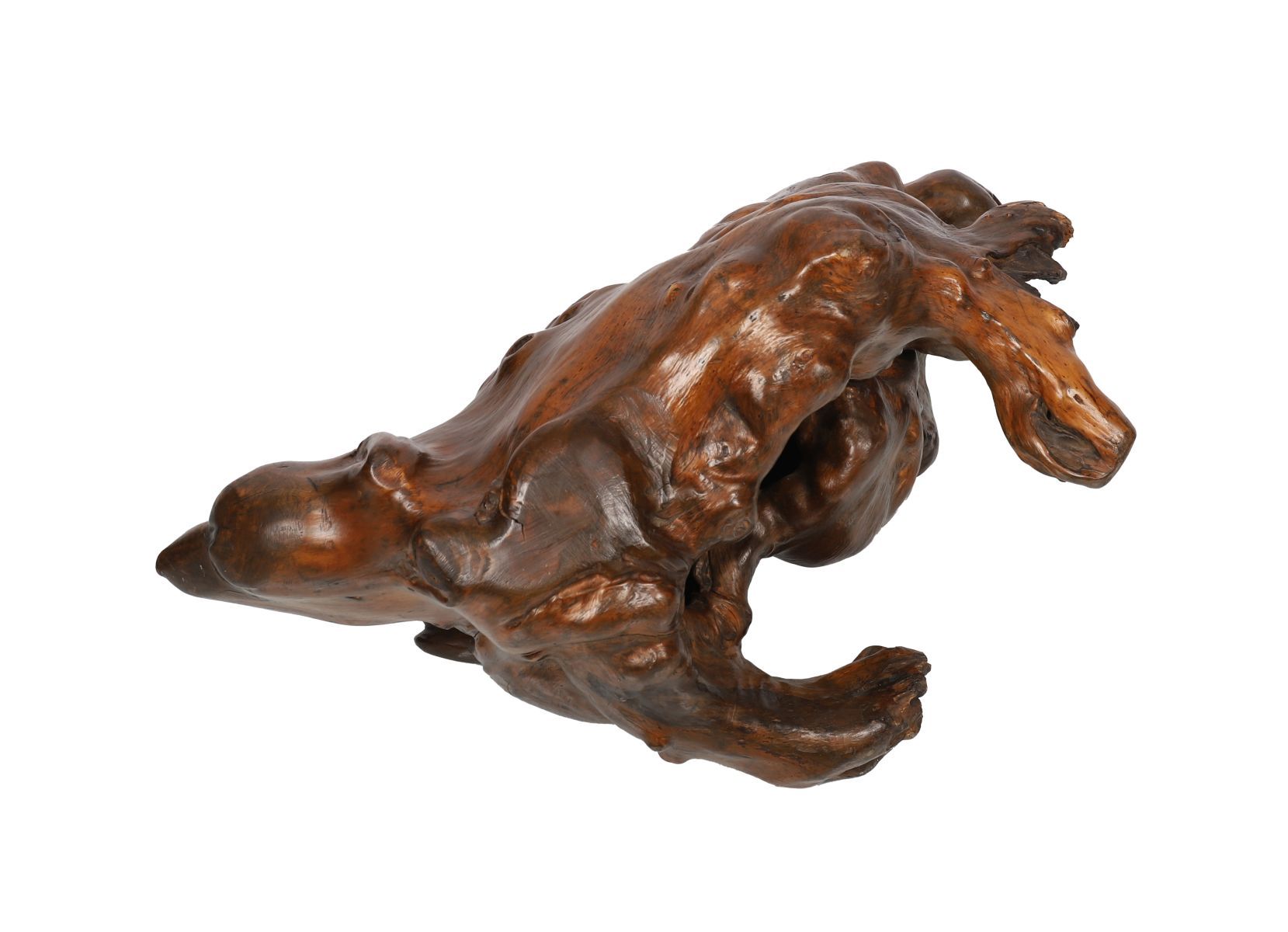 A large root-wood sculpture, naturalistically carved and worked to suggest the form of a bear, the organic gnarled surface of the root emphasising the animal’s musculature and movement. The wood polished to a rich, warm patina.