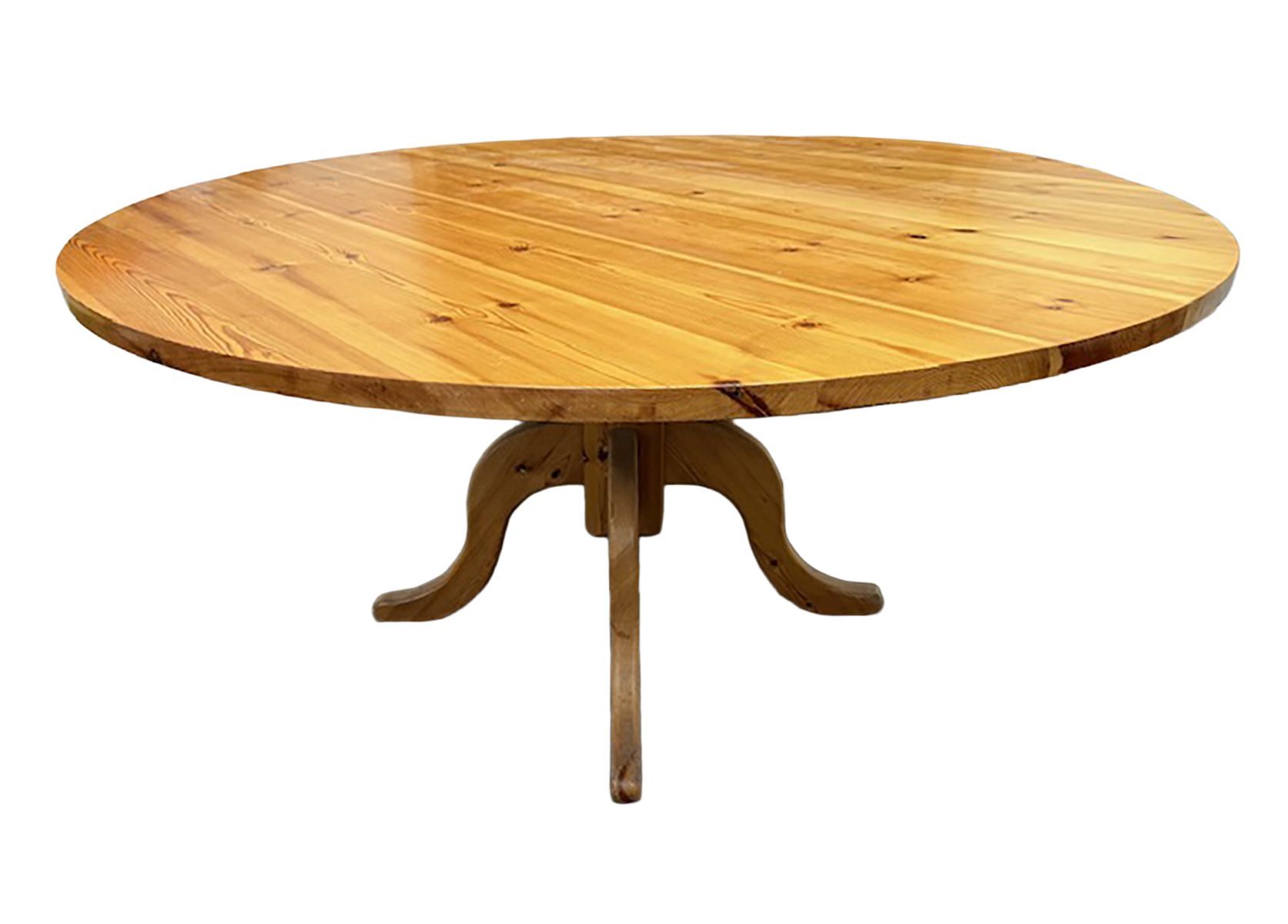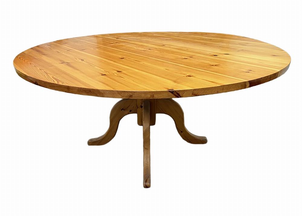 A large circular pine kitchen or dining table, the well-figured plank top raised on a quadruple splayed pedestal base.