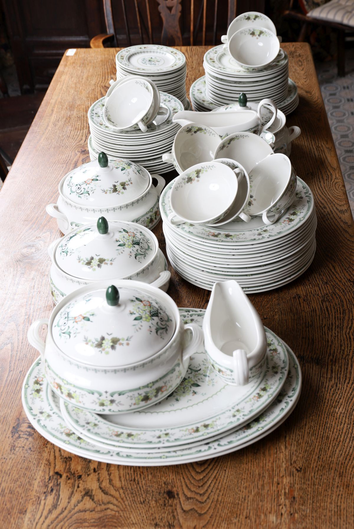 Comprising: 12 dinner plates, 12 salad plates, 12 side plates, 8 soup bowls, 2 sauce boats, 3 tureens, 4 graduated meat platters.