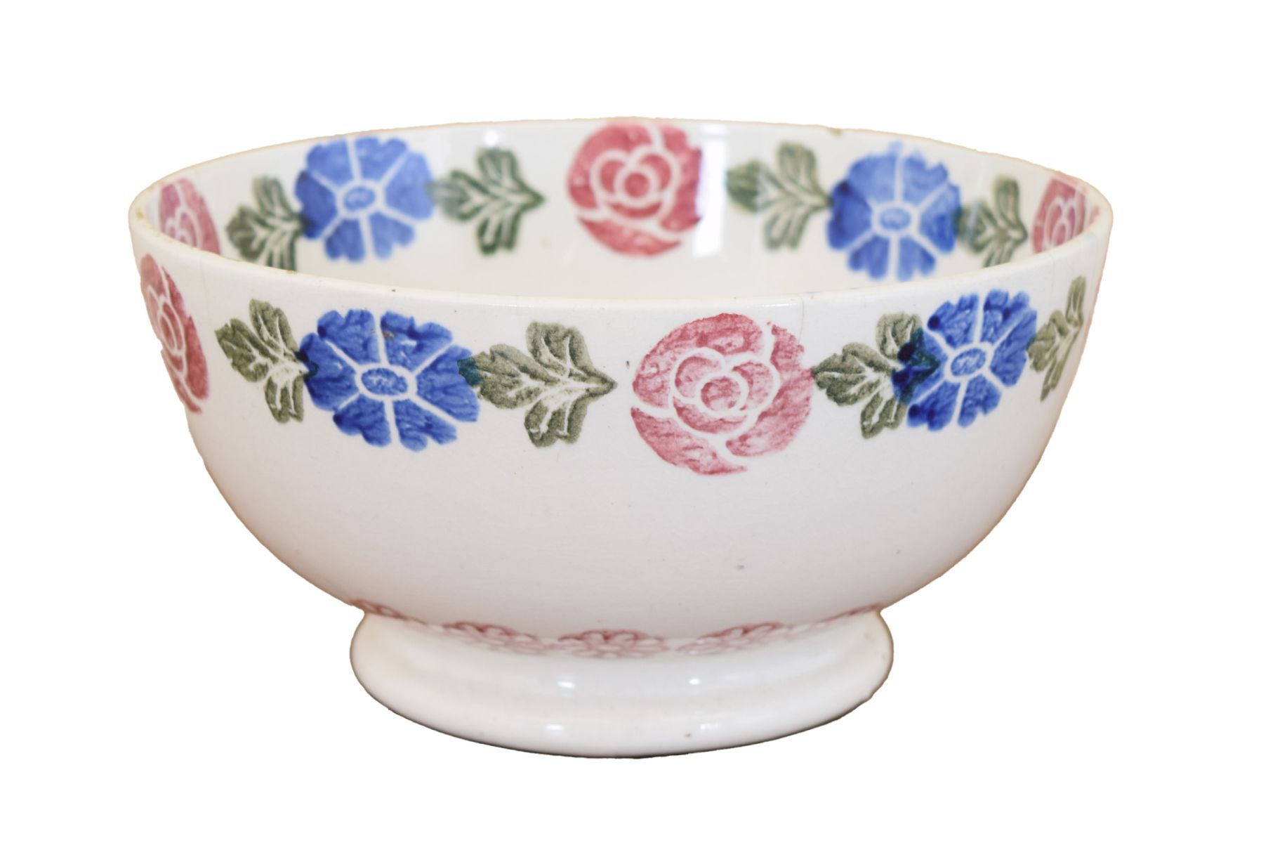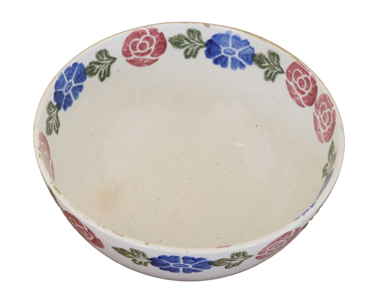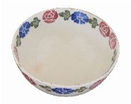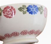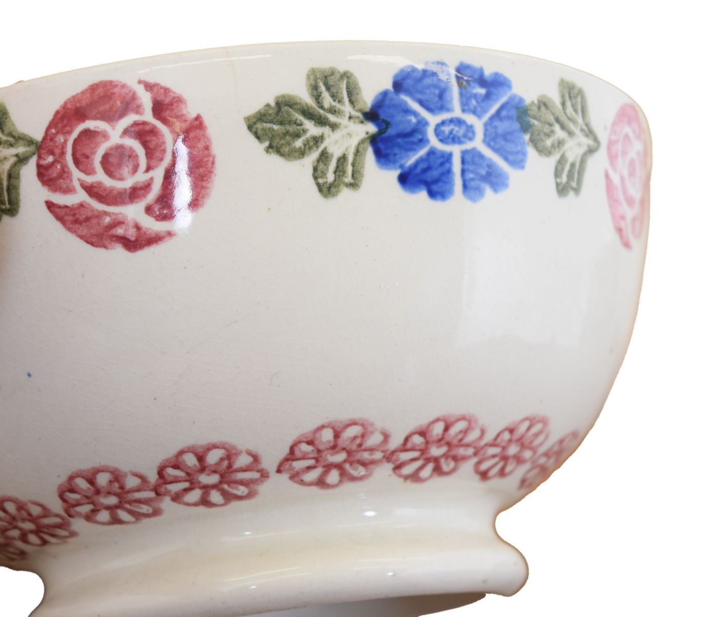 decorated with alternating red and blue flower band design; a vibrant piece of utilitarian pottery.