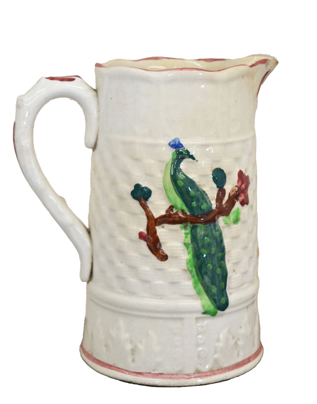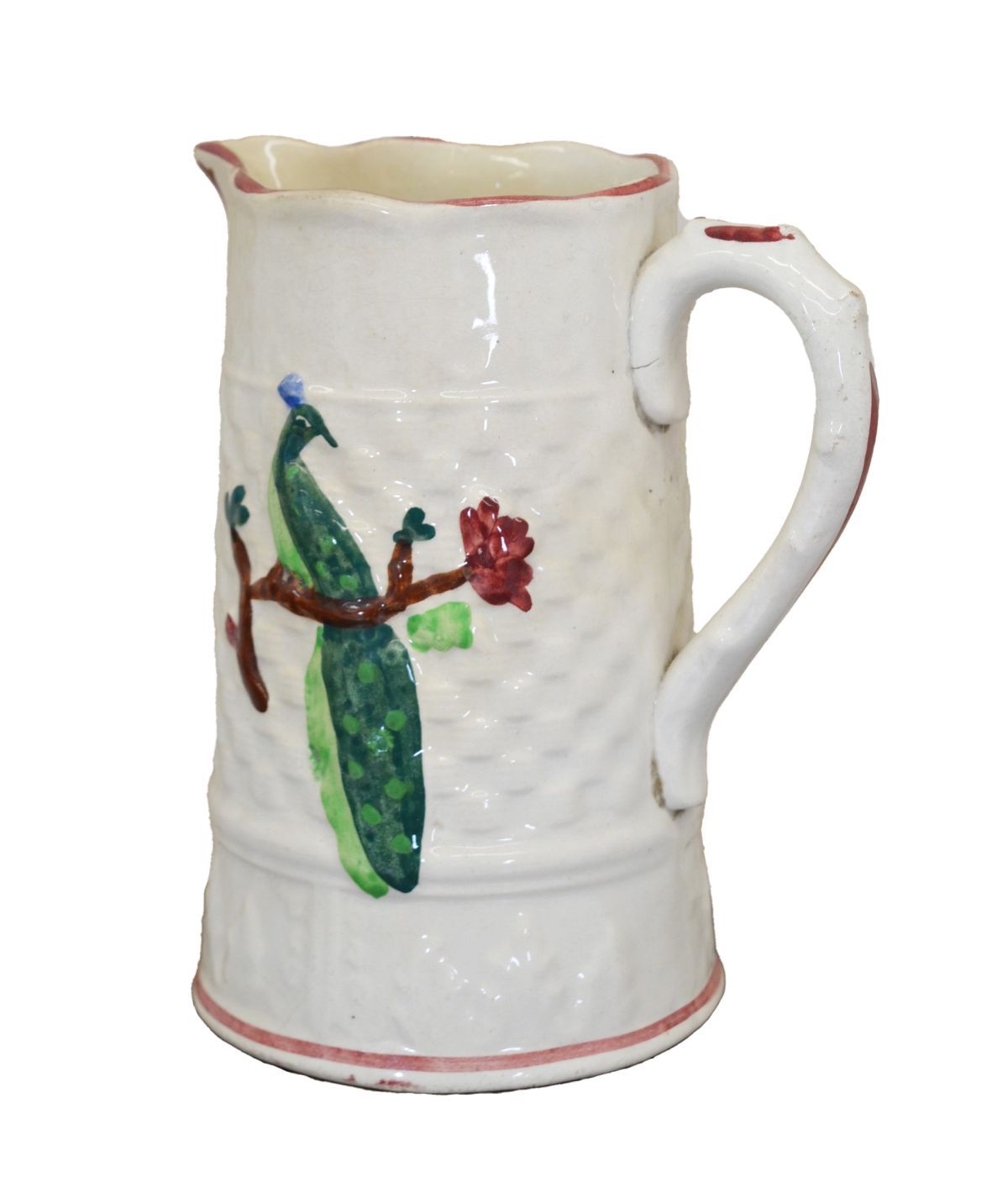 with vibrant peacock decoration and scroll handle; a charming piece of decorative Irish earthenware.