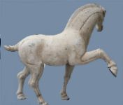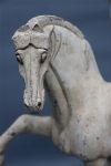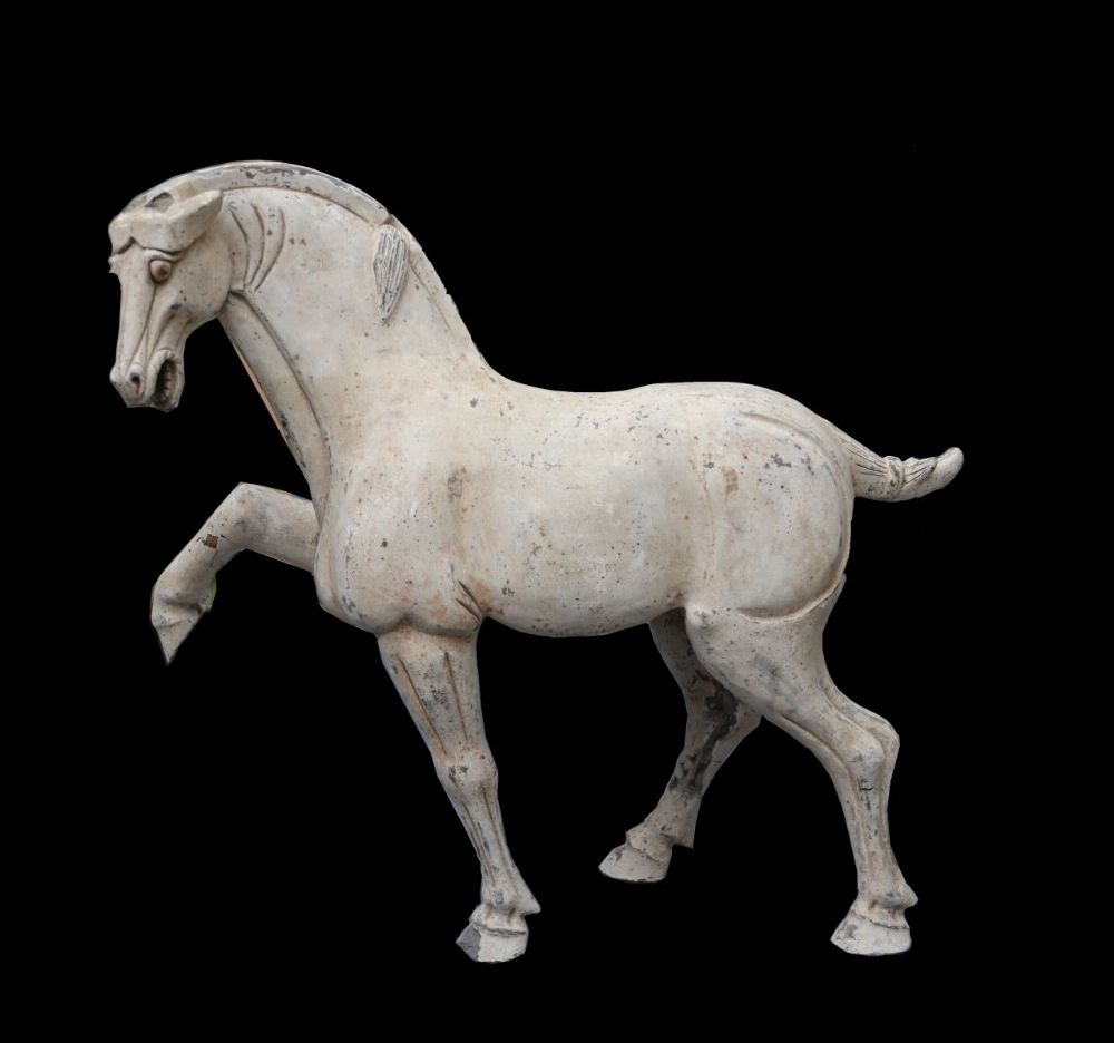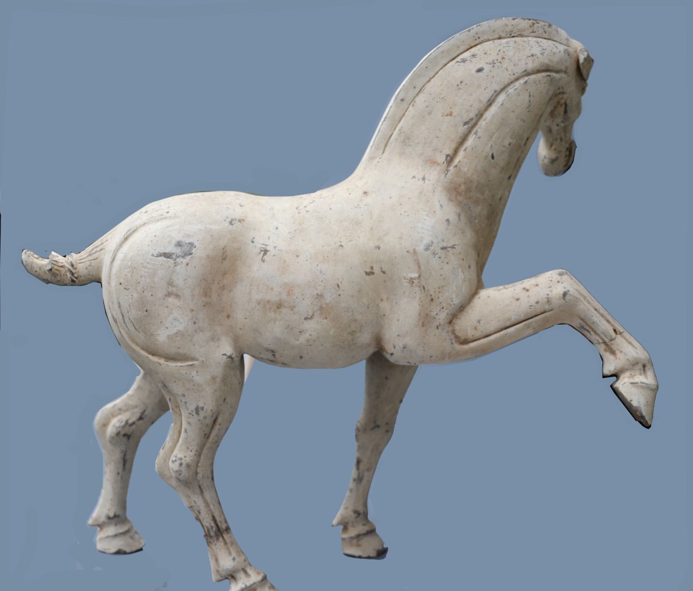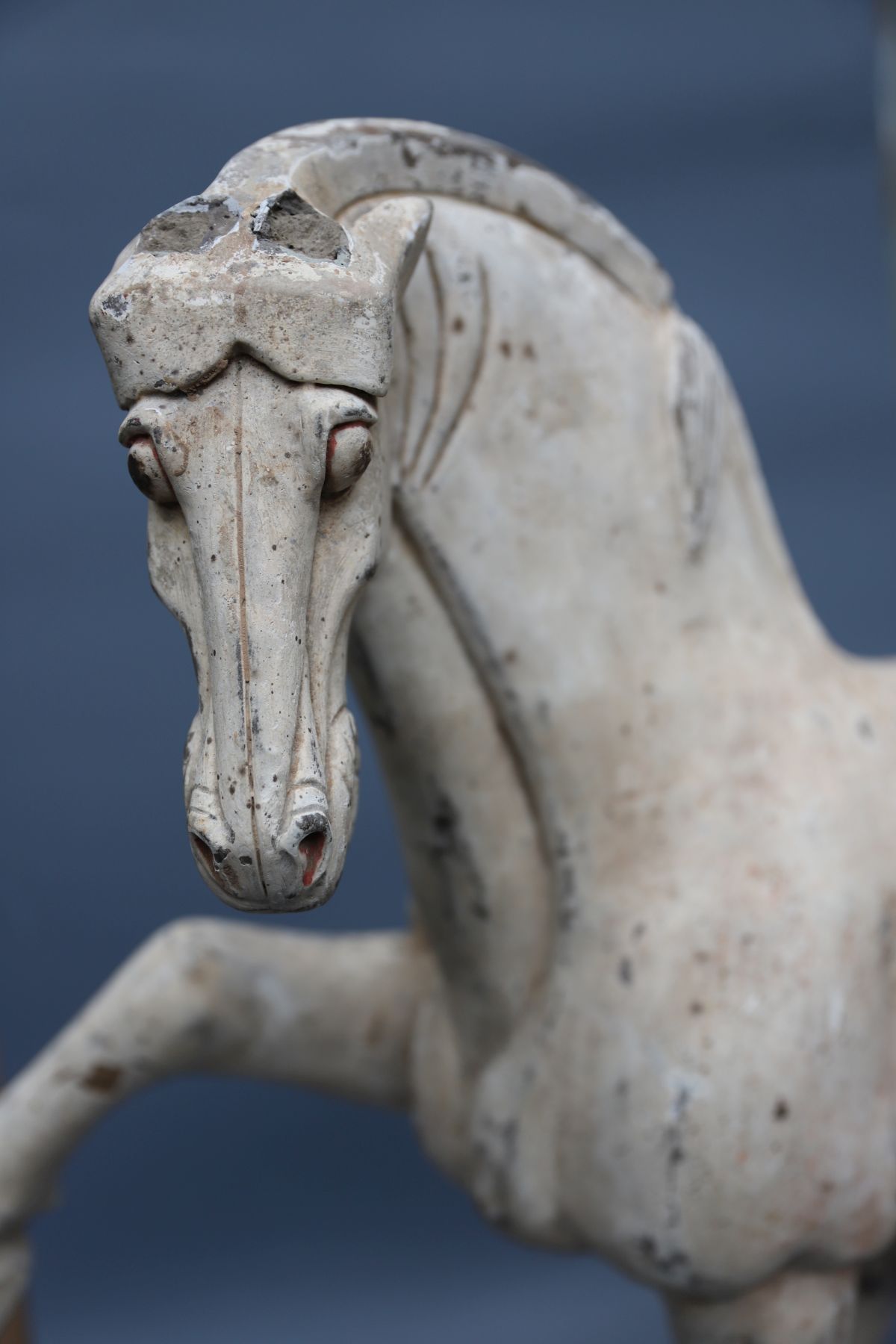 A large Chinese pottery horse modelled in the Tang style, shown standing four-square with head turned alertly to one side and mouth open. The figure is covered in a pale slip with traces of pigment remaining, and well-defined modelling to the mane, muzzle, and limbs. The form reflects the powerful, expressive equine sculptures characteristic of Tang dynasty tomb figures.