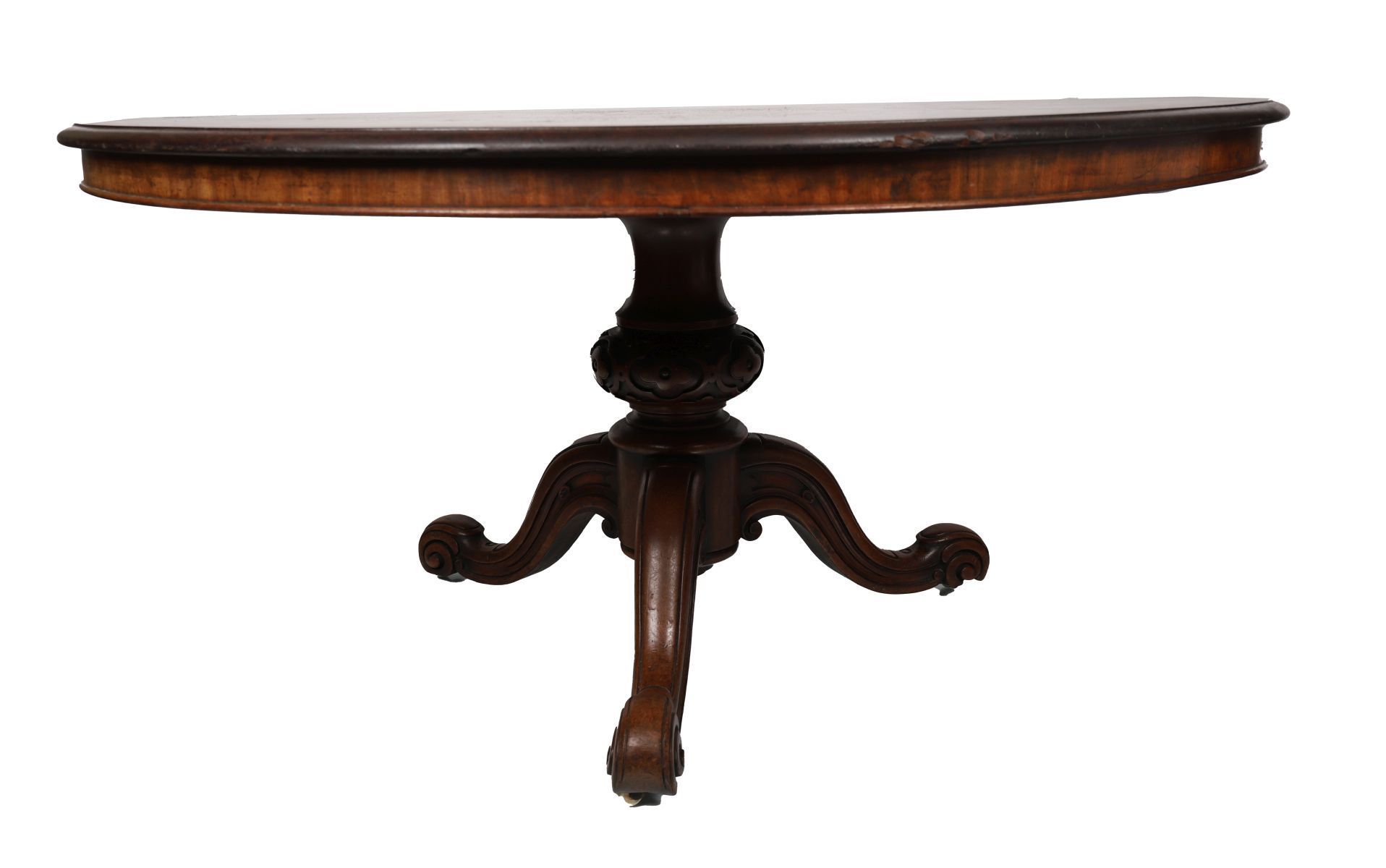 Mid-19th century. The well-figured circular top on a substantial turned baluster column and quadruple scroll supports with recessed castors.