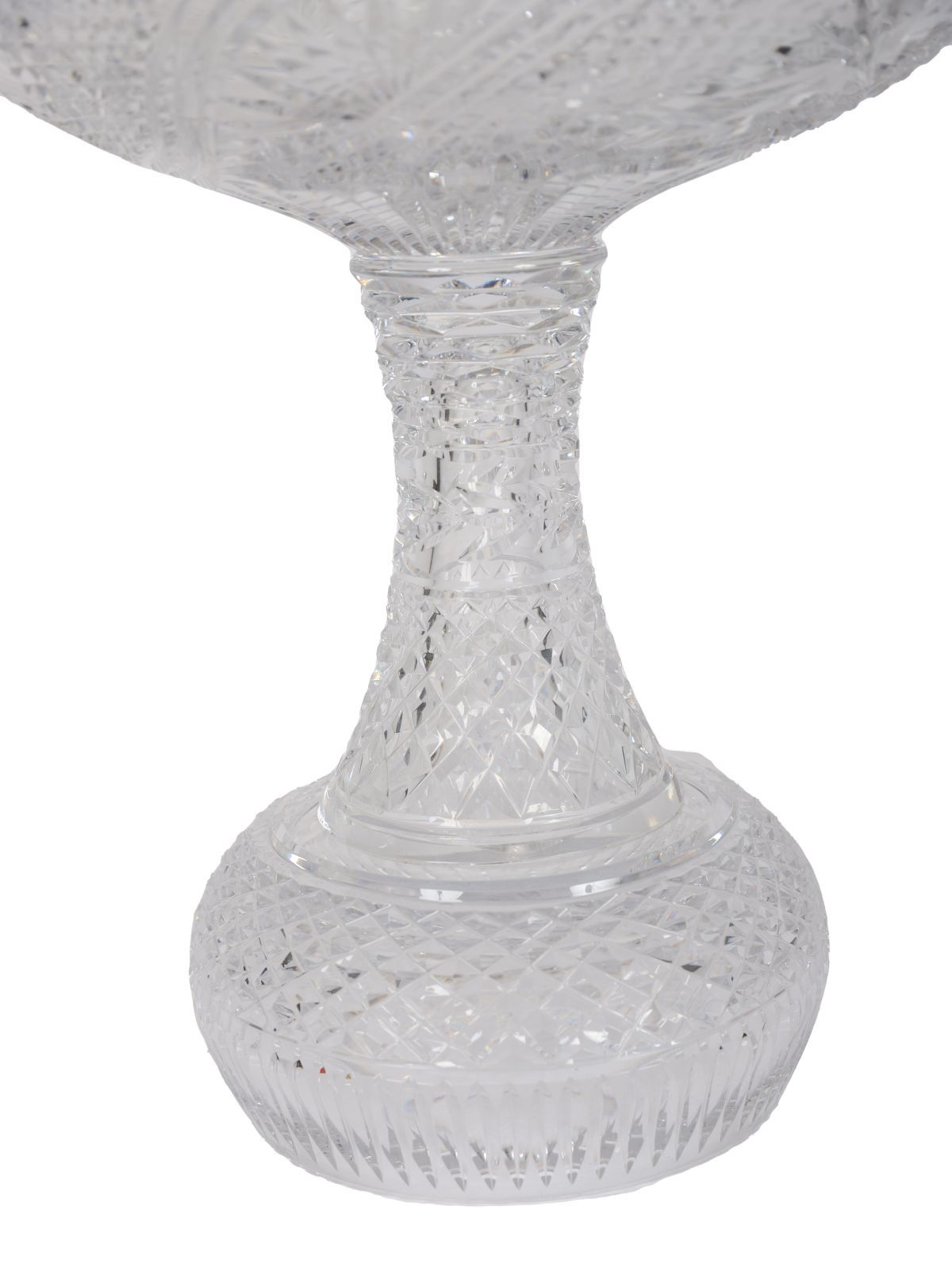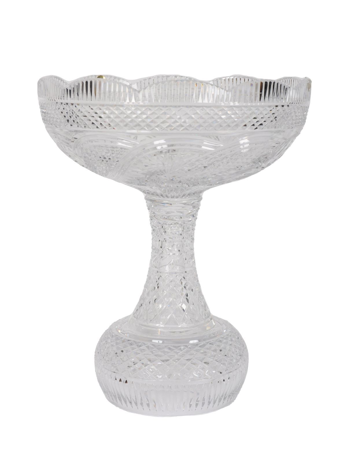 A large Waterford crystal pedestal bowl of wide shallow form, the scalloped rim cut with vertical flutes above bands of diamond cutting, the bowl interior centred with a radiating starburst motif. Raised on a baluster stem and circular foot, both richly cut with diamond patterns. Retaining the original Waterford Crystal paper label.