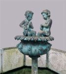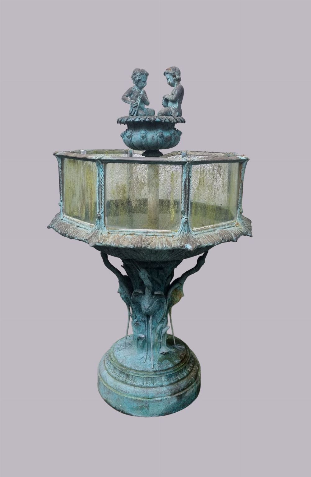 A substantial cast bronze fountain featuring two cherubic figures seated at the rim of a scalloped basin, raised above an octagonal glazed reservoir supported by a pedestal adorned with cranes and foliate motifs. The surface displays an attractive natural verdigris patina from outdoor exposure, enhancing its sculptural depth and classical charm.