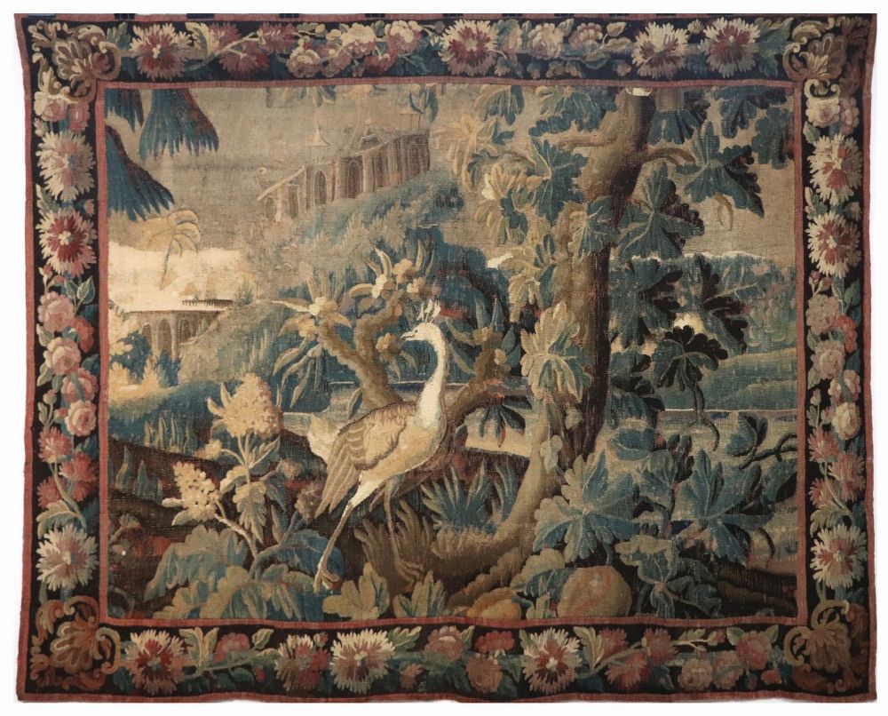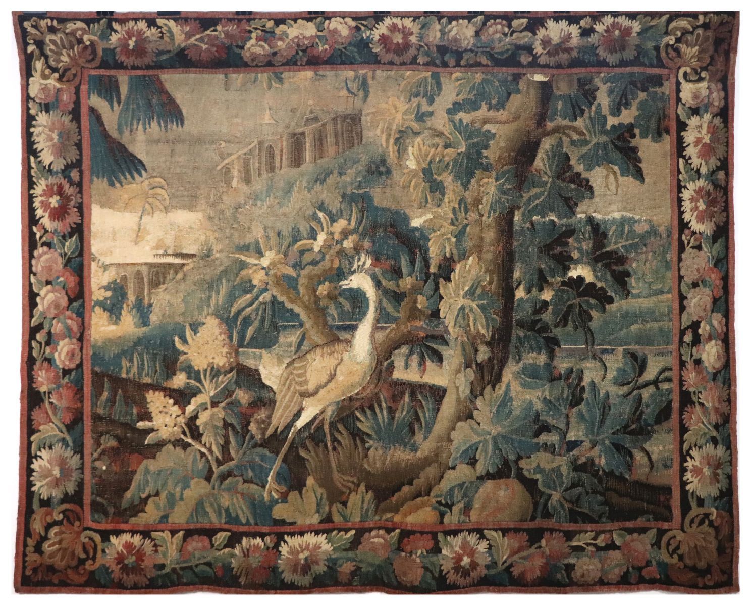 A finely woven late 17th-century silk and wool verdure tapestry, depicting an exotic bird—a crested crane or peacock—amid lush foliage and trees before a classical landscape with architectural ruins