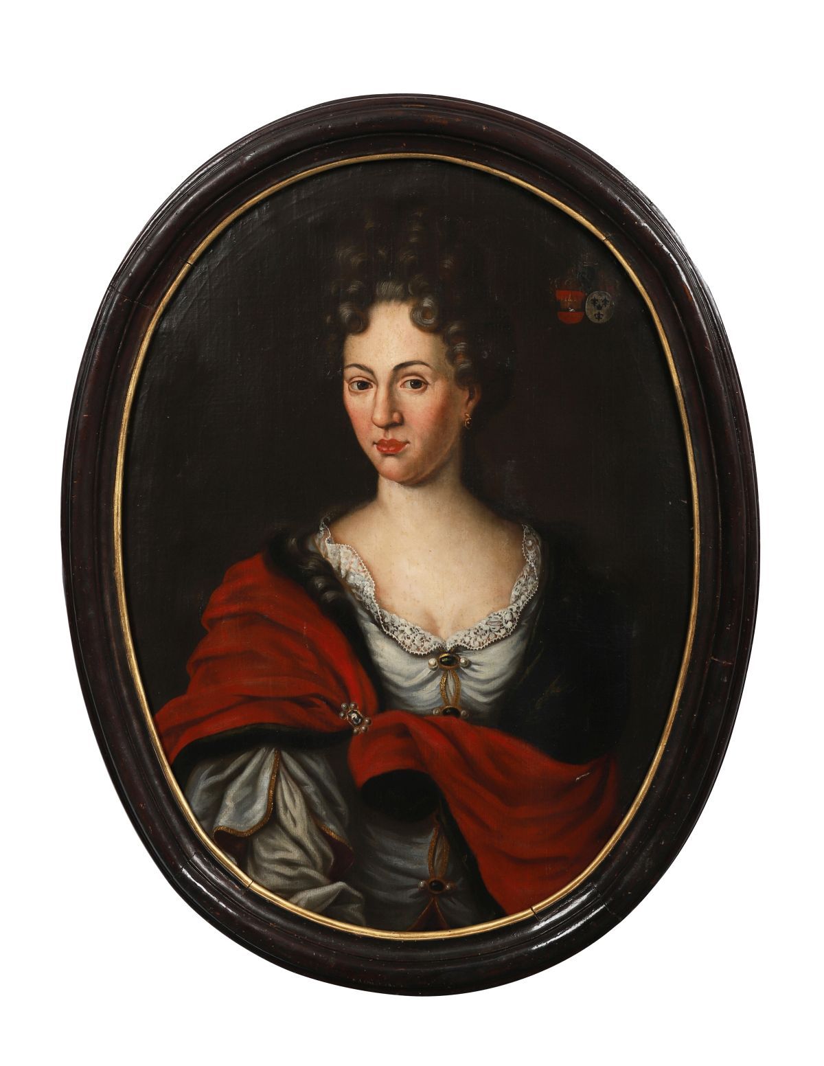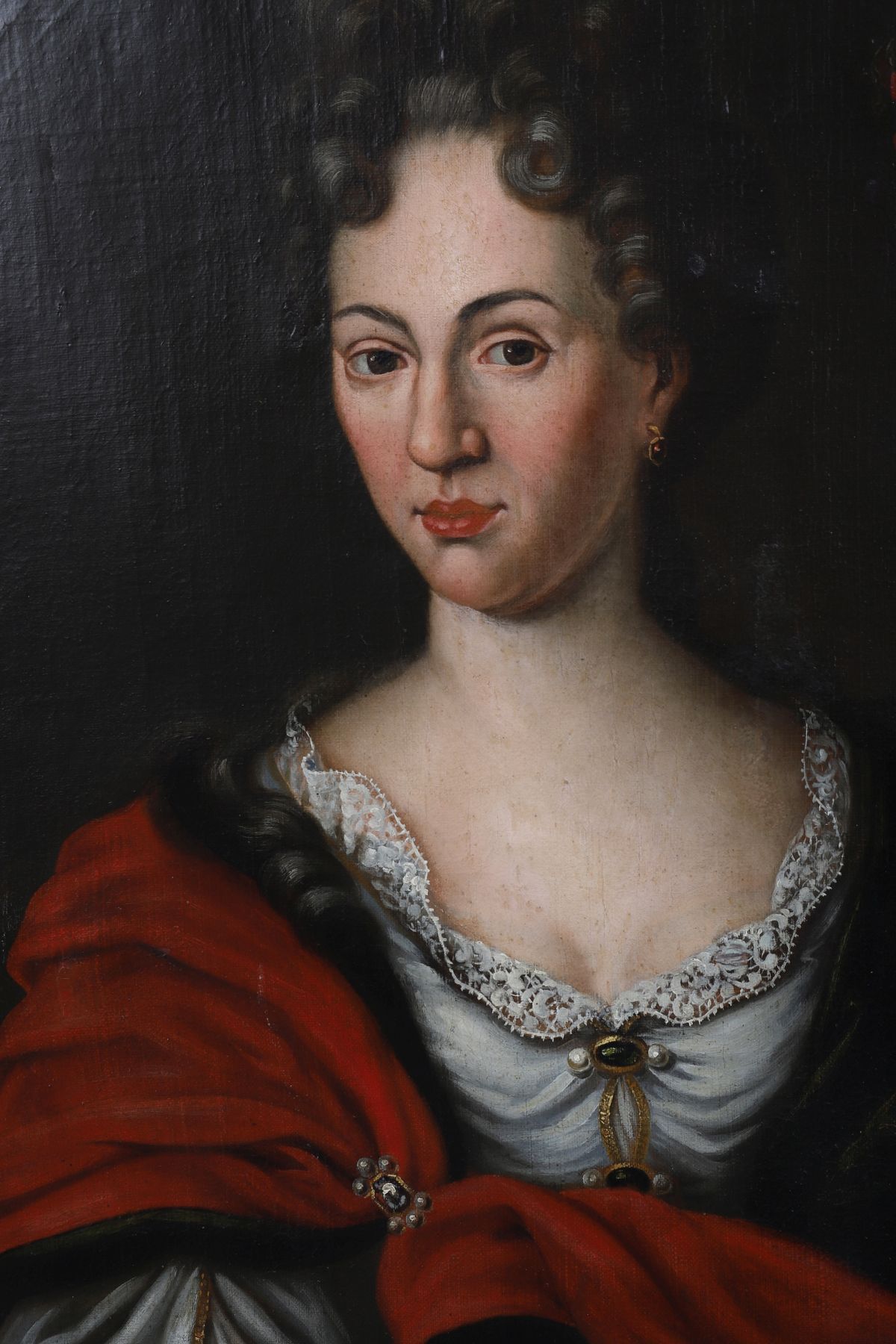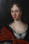 Late 17th-century French School, oval portrait of an elegant lady in red draped shawl and lace chemise, wearing pearls and a jewelled brooch, oil on canvas in period ebonised frame.