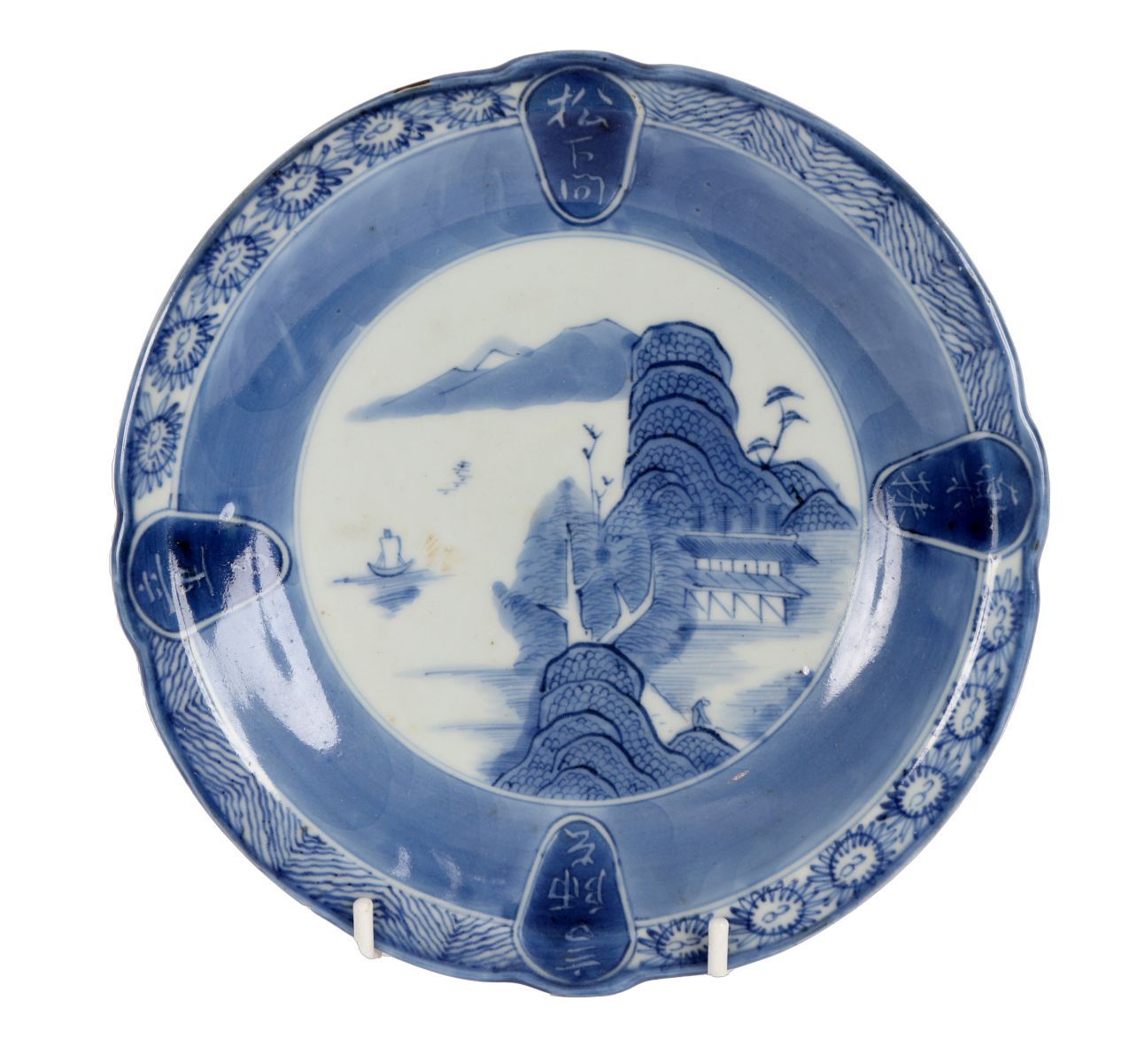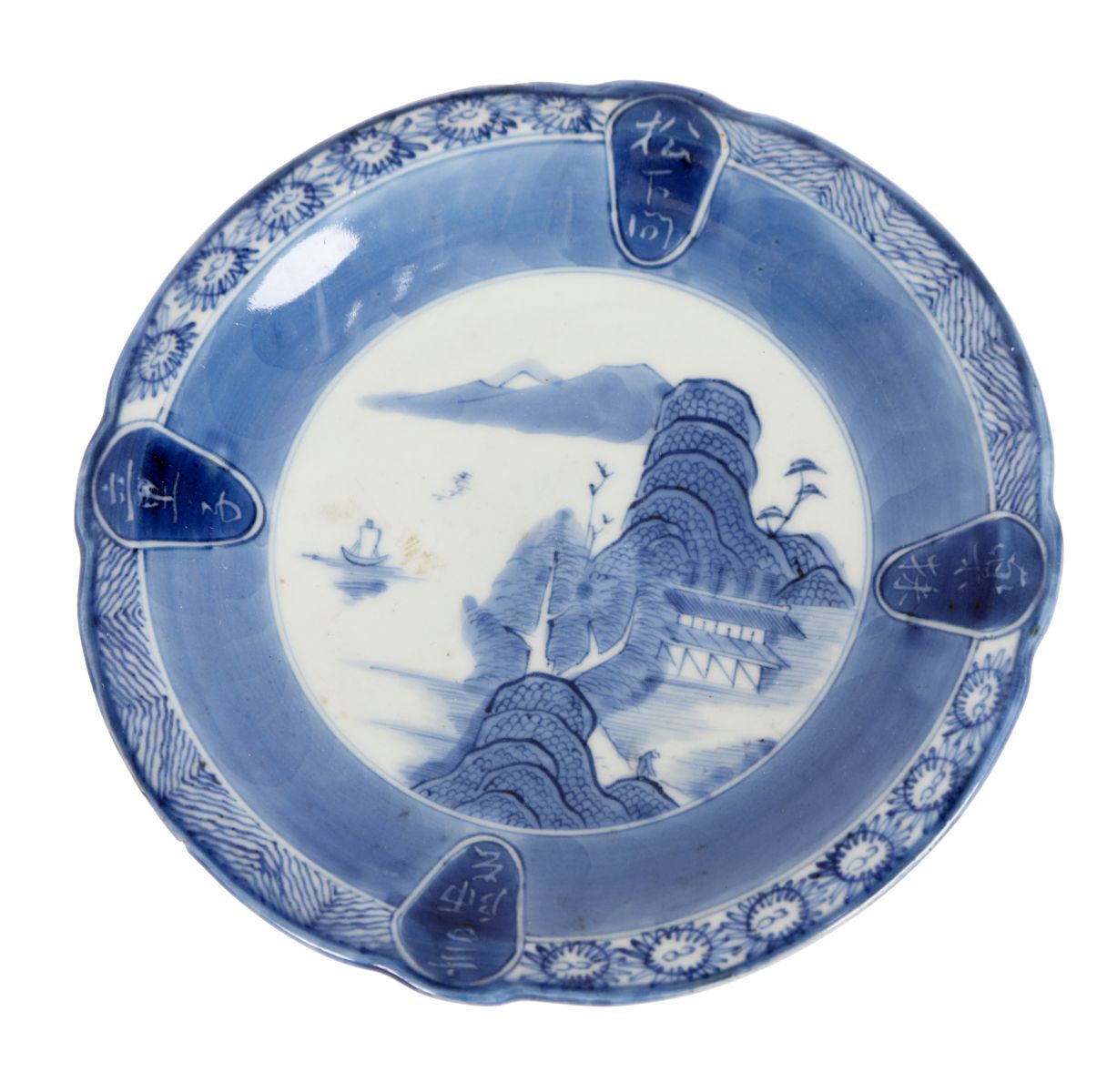 An Edo-period Japanese porcelain bowl of lobed circular form, finely decorated in underglaze blue. The interior painted with a tranquil river landscape depicting pavilions, rocky outcrops, trees and a boat on calm water, enclosed by a broad rim divided into alternating cartouches of Chinese-style calligraphy and floral panels, the border further enriched with stylised scroll and blossom motifs.
