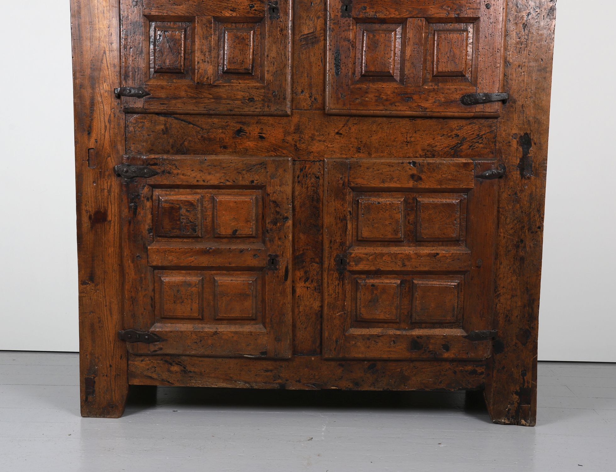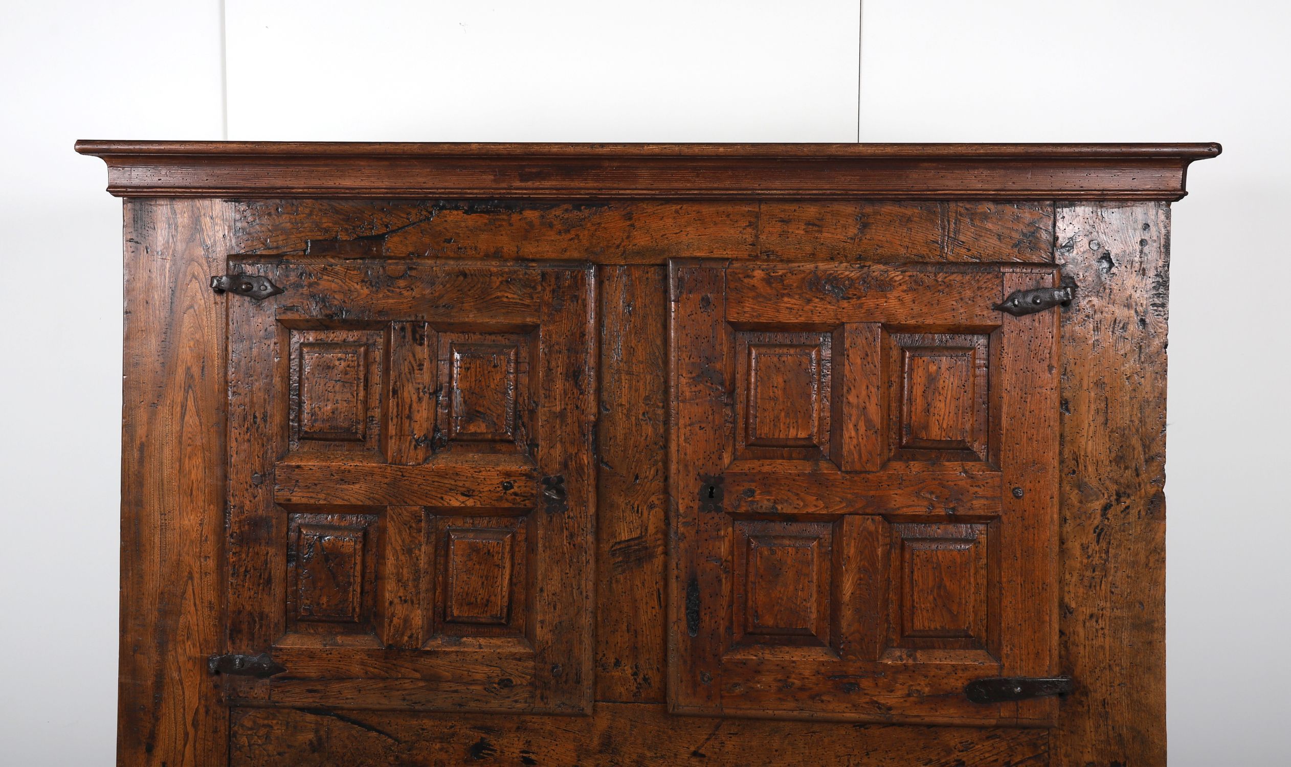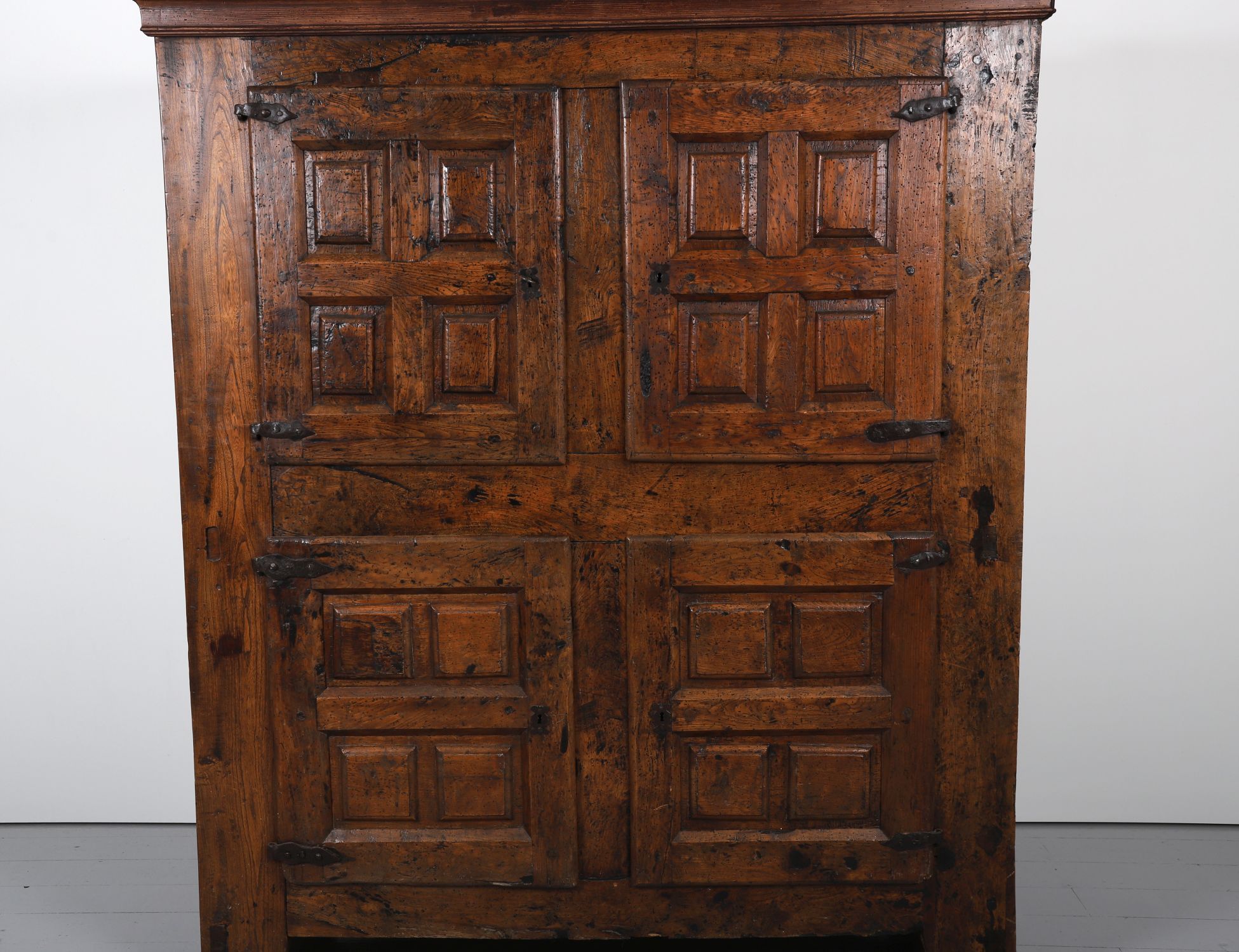 A large oak cupboard, with two tiers of panelled doors, each door with raised rectangular moulded panels, fitted with wrought iron strap hinges and original lock plates. Raised on stile feet with moulded cornice.