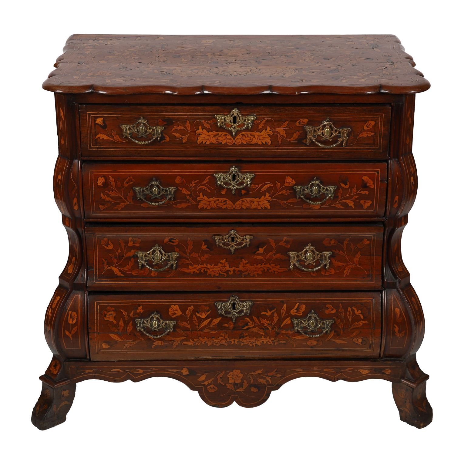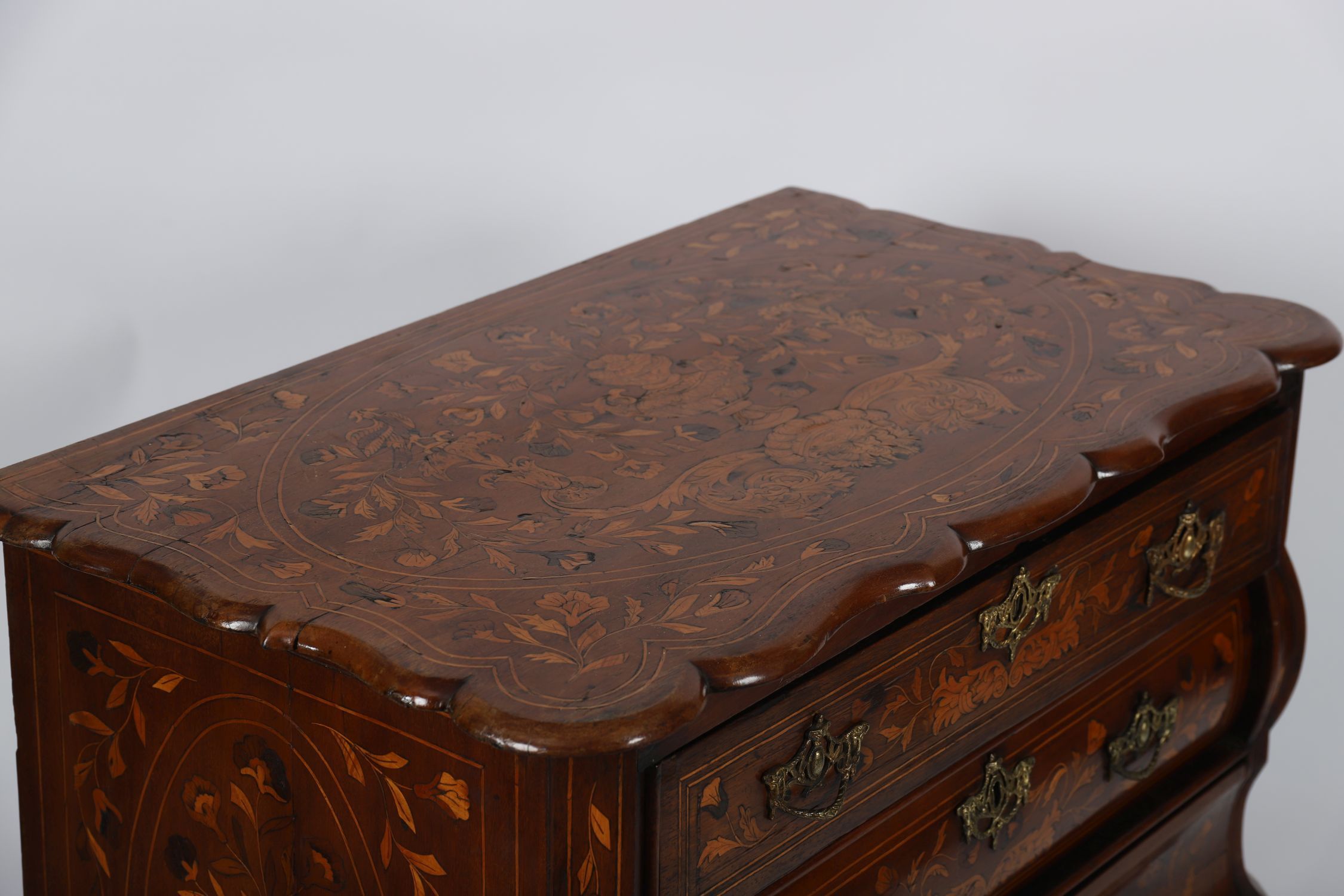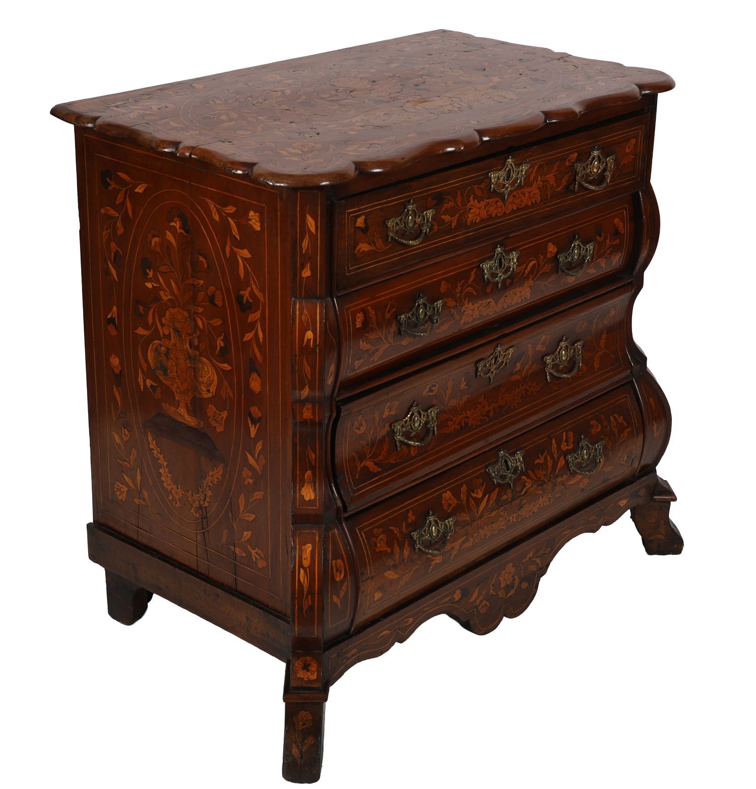 A fine late 18th-century Dutch bombe-front commode, richly inlaid throughout with floral marquetry in various fruitwoods. The serpentine top features scrolling foliate and urn motifs centred by exotic birds, repeated across the graduated drawers and bombe sides. Fitted with ornate brass handles and escutcheons, the drawers retain original or period locks. The shaped apron and cabriole legs complete this elegant provincial form.